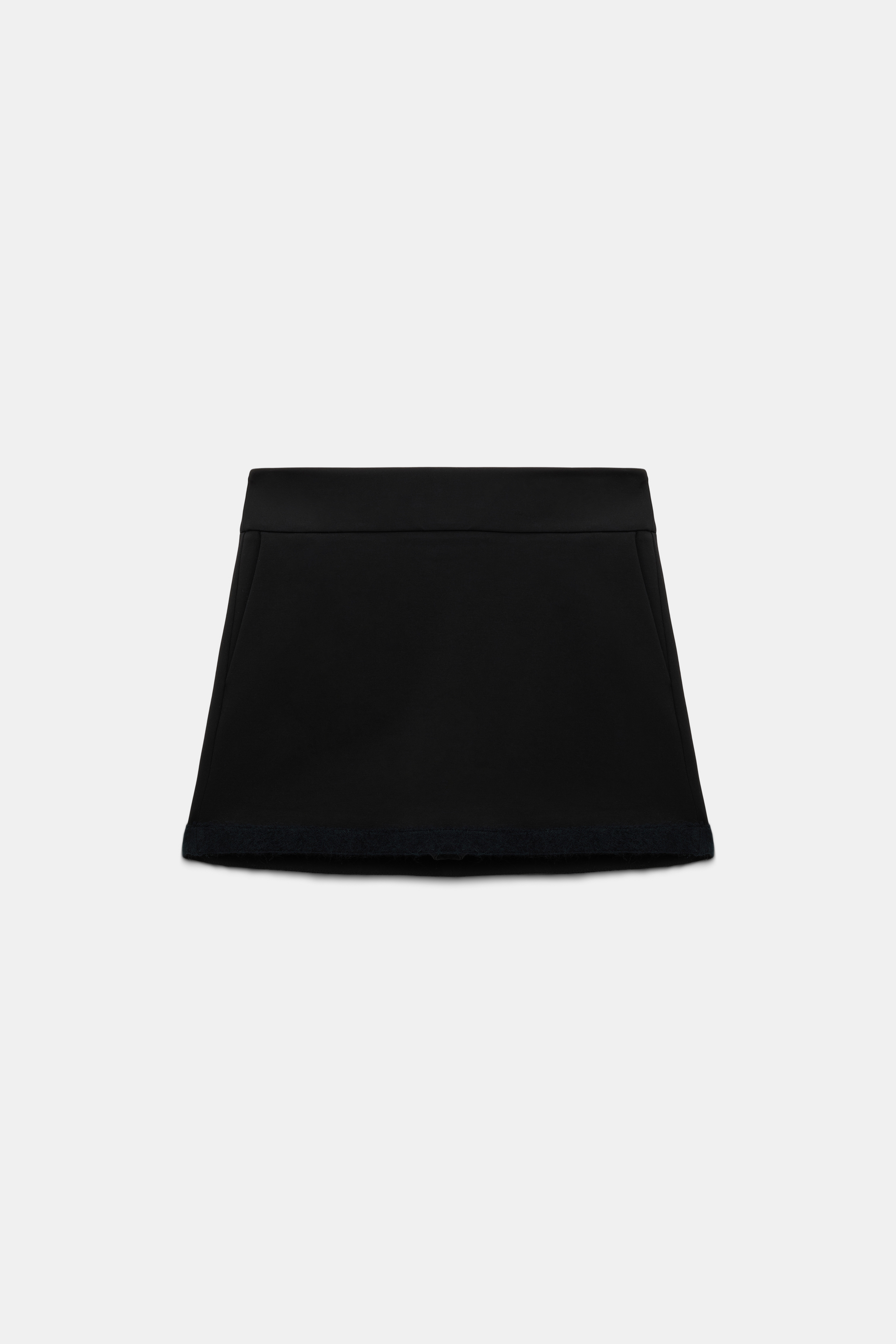 The miniskirt is detailed in our forever favorite Punto Milano with tonal fluffy knit trim on the hem.