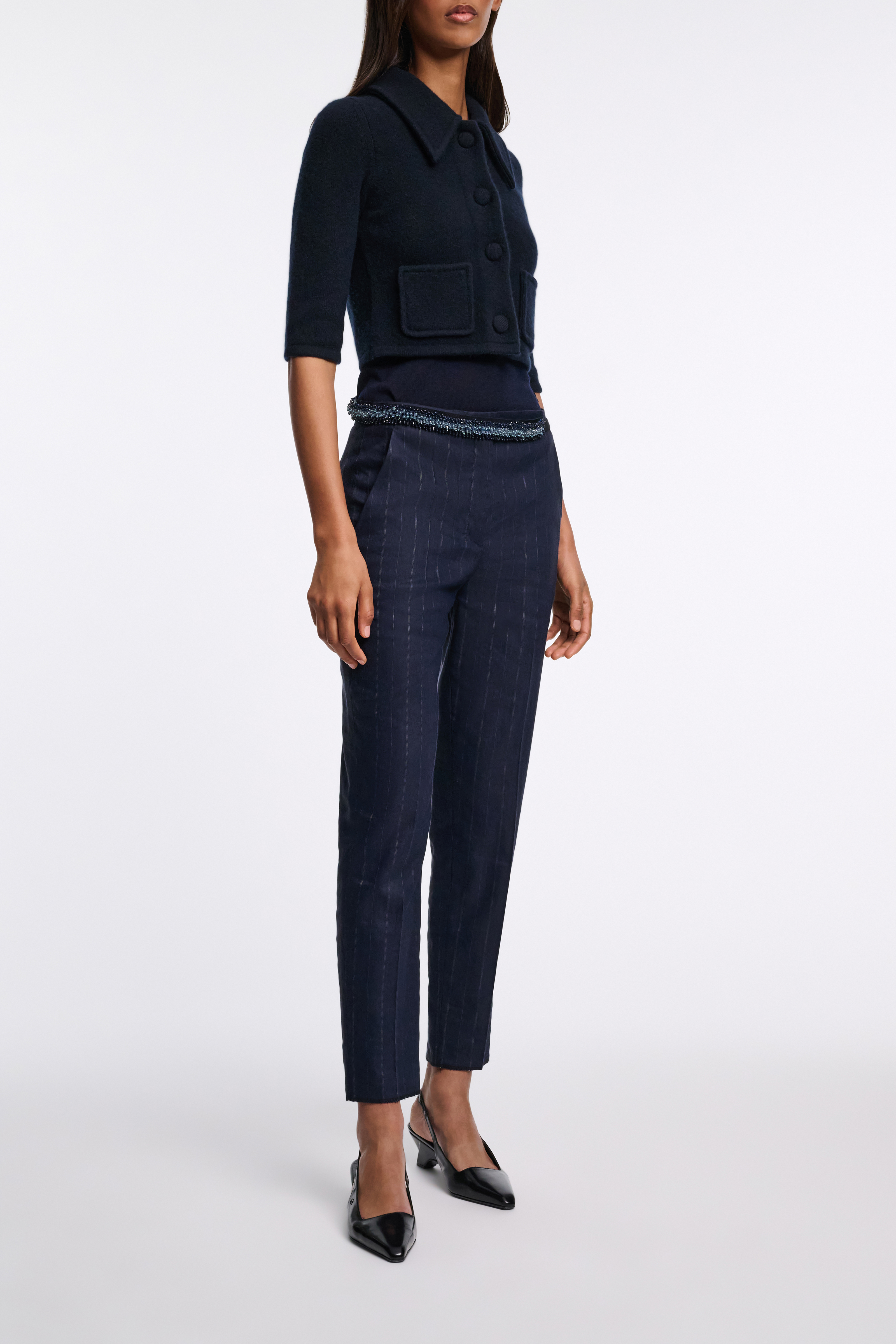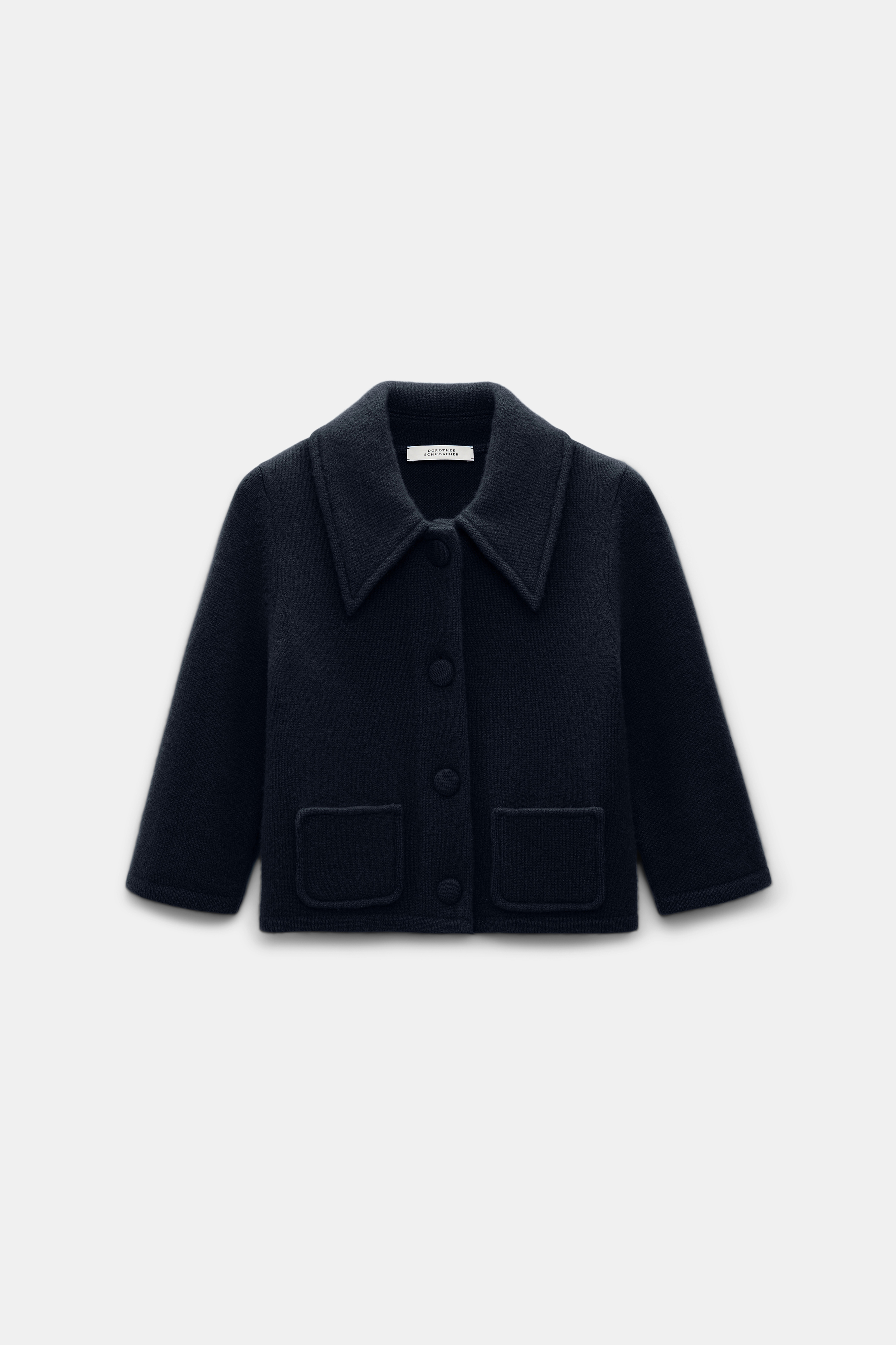The cropped jacket is made from a soft Merino-cashmere mix and has an oversized collar.