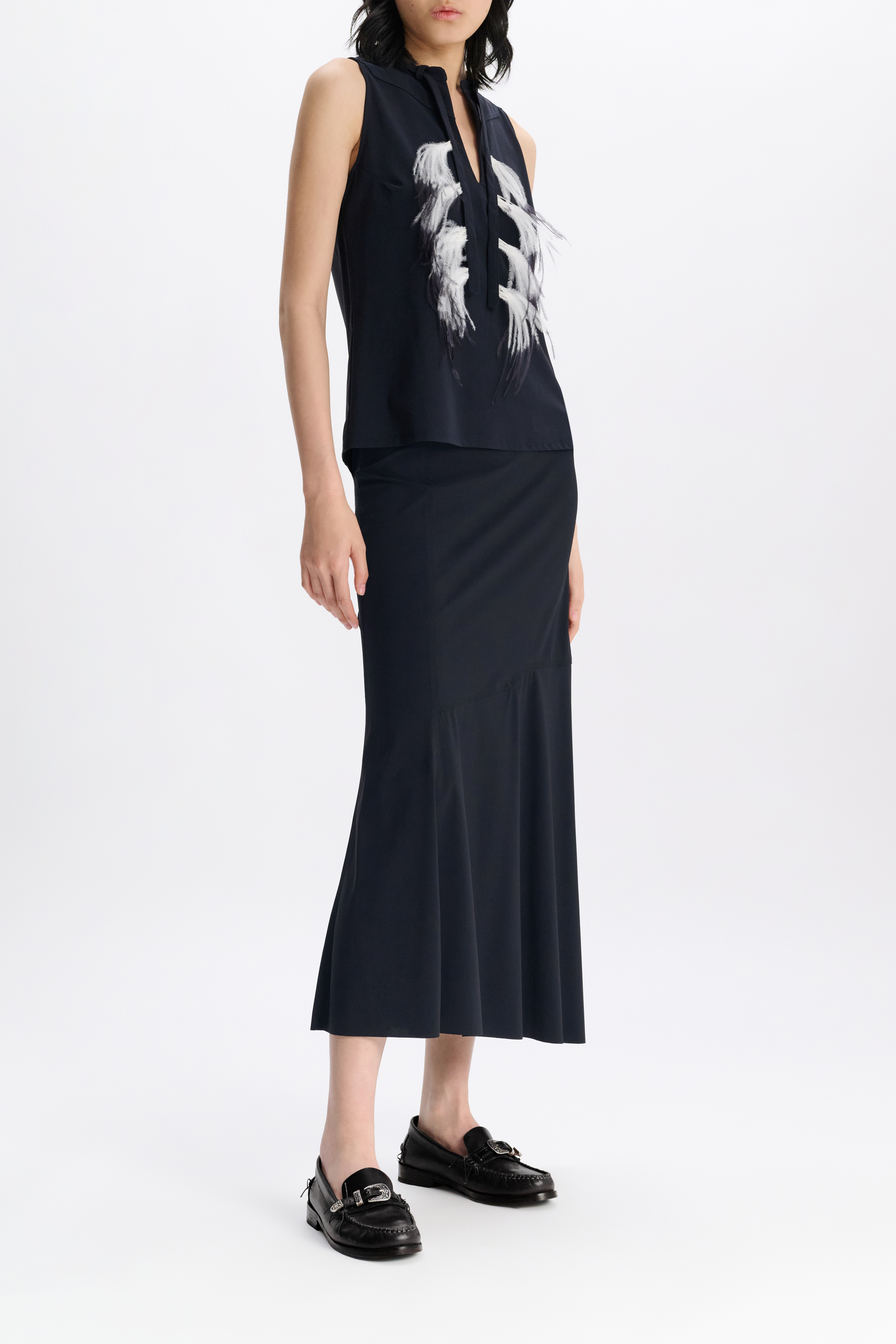 Der Rock ist aus einem Jersey-Stretch gefertigt, der besonders knitterfreie Eigenschaften hat - daher ist der Rock auch perfekt zum Reisen geeignet.