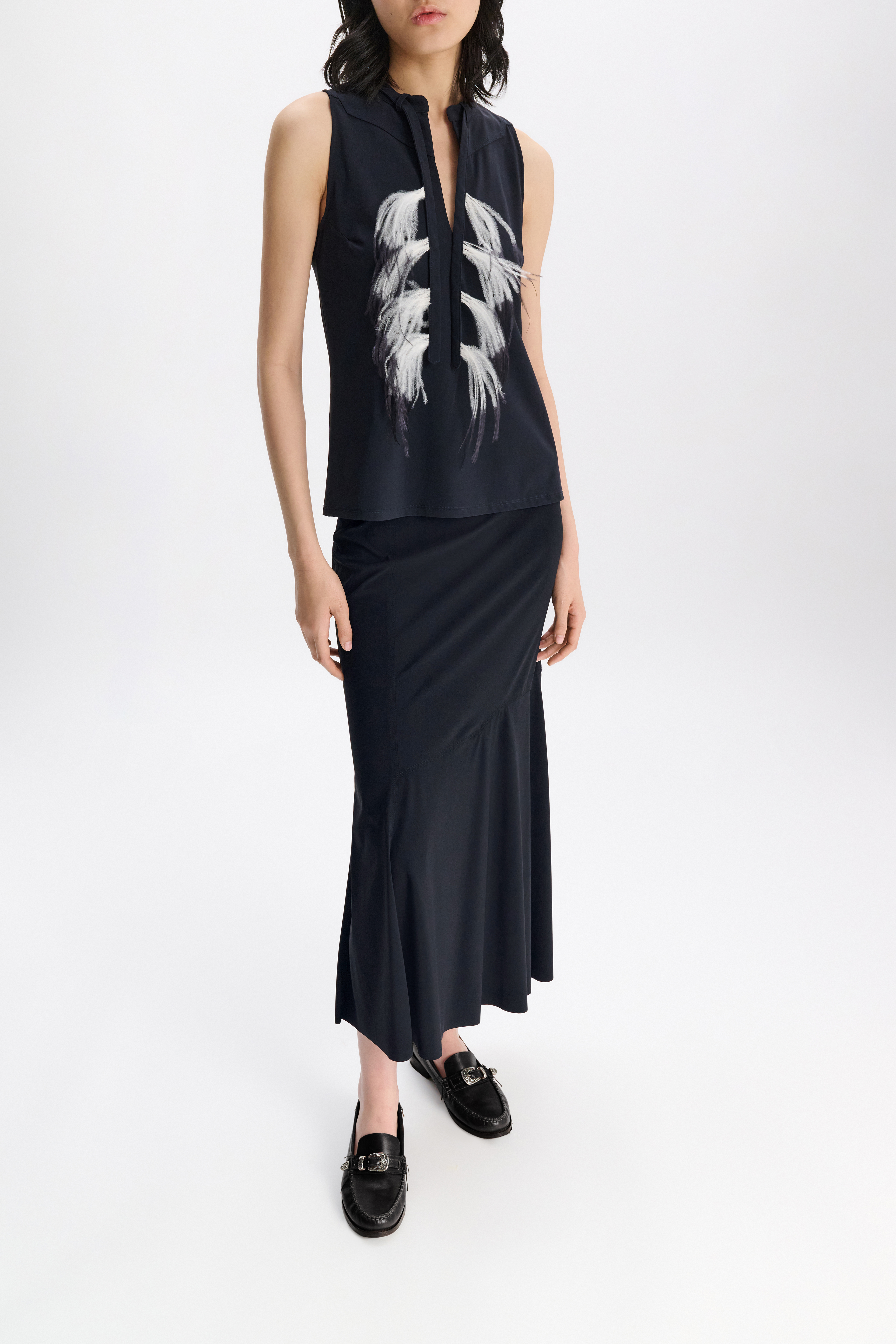 Der leicht asymmetrische Saum wird durch offene Kanten ergänzt.