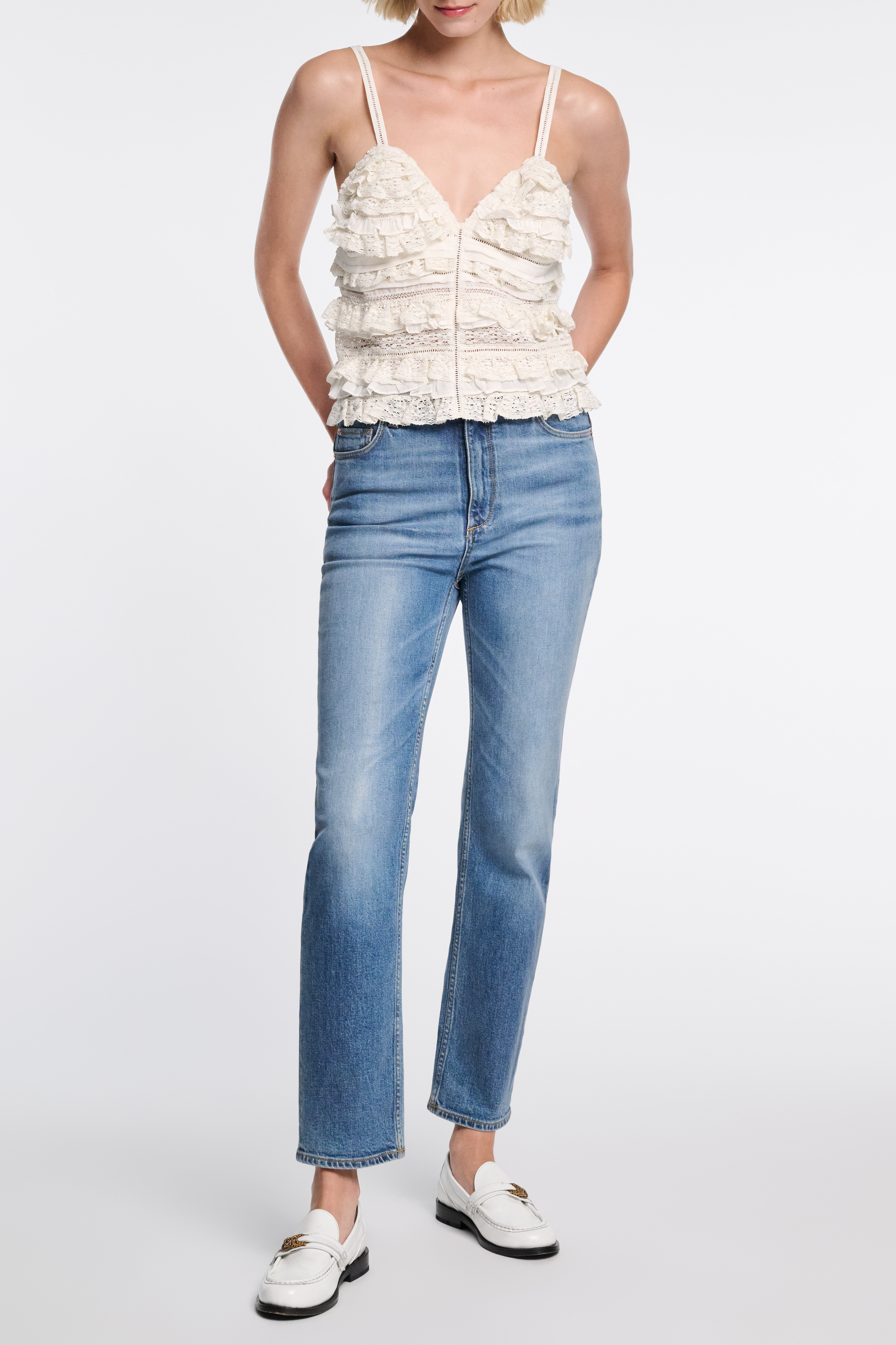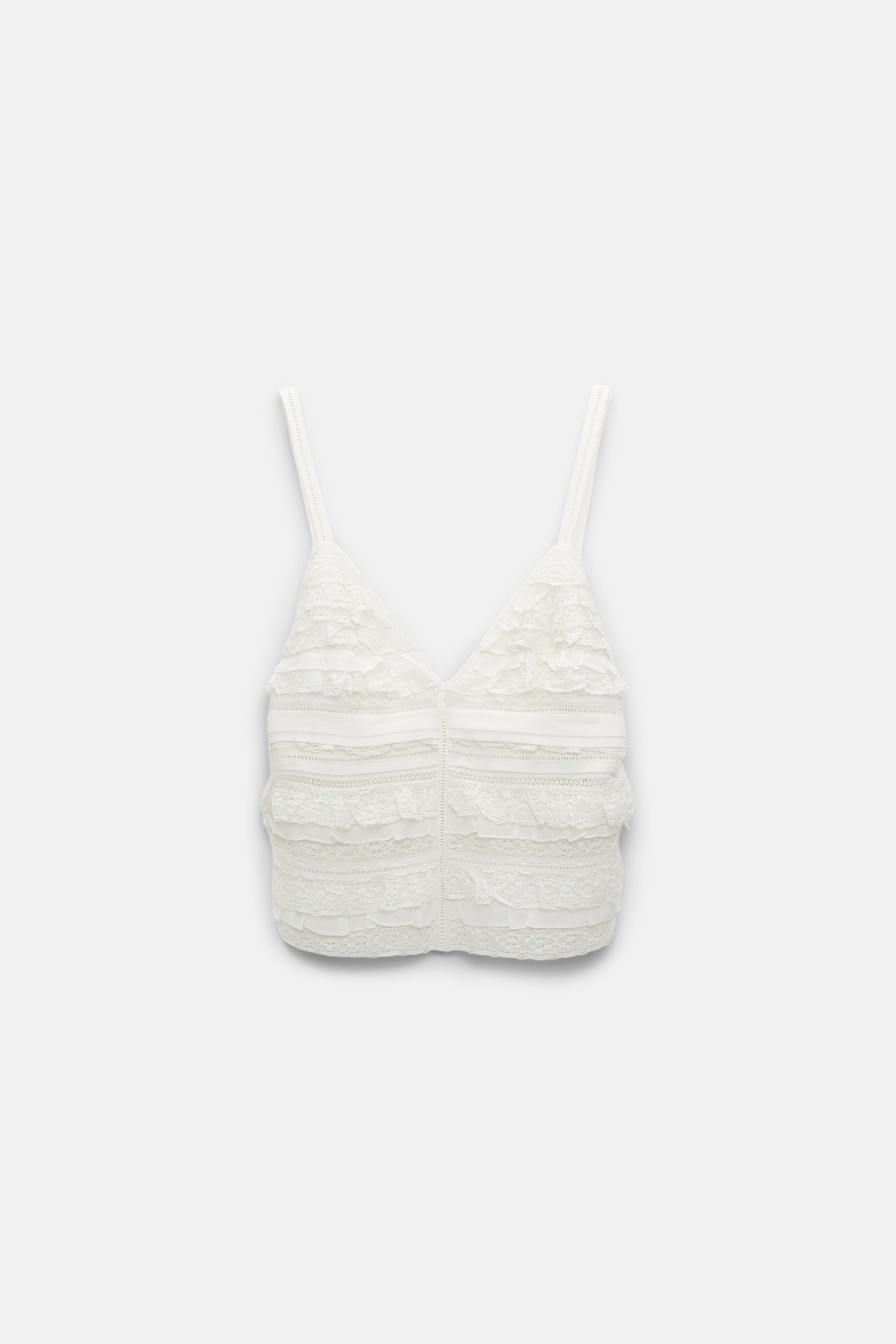 Das V-Neck Top ist unglaublich aufwendig mit Bändern aus Spitze, Tüll und Seiden Crêpe de Chine gefertigt.