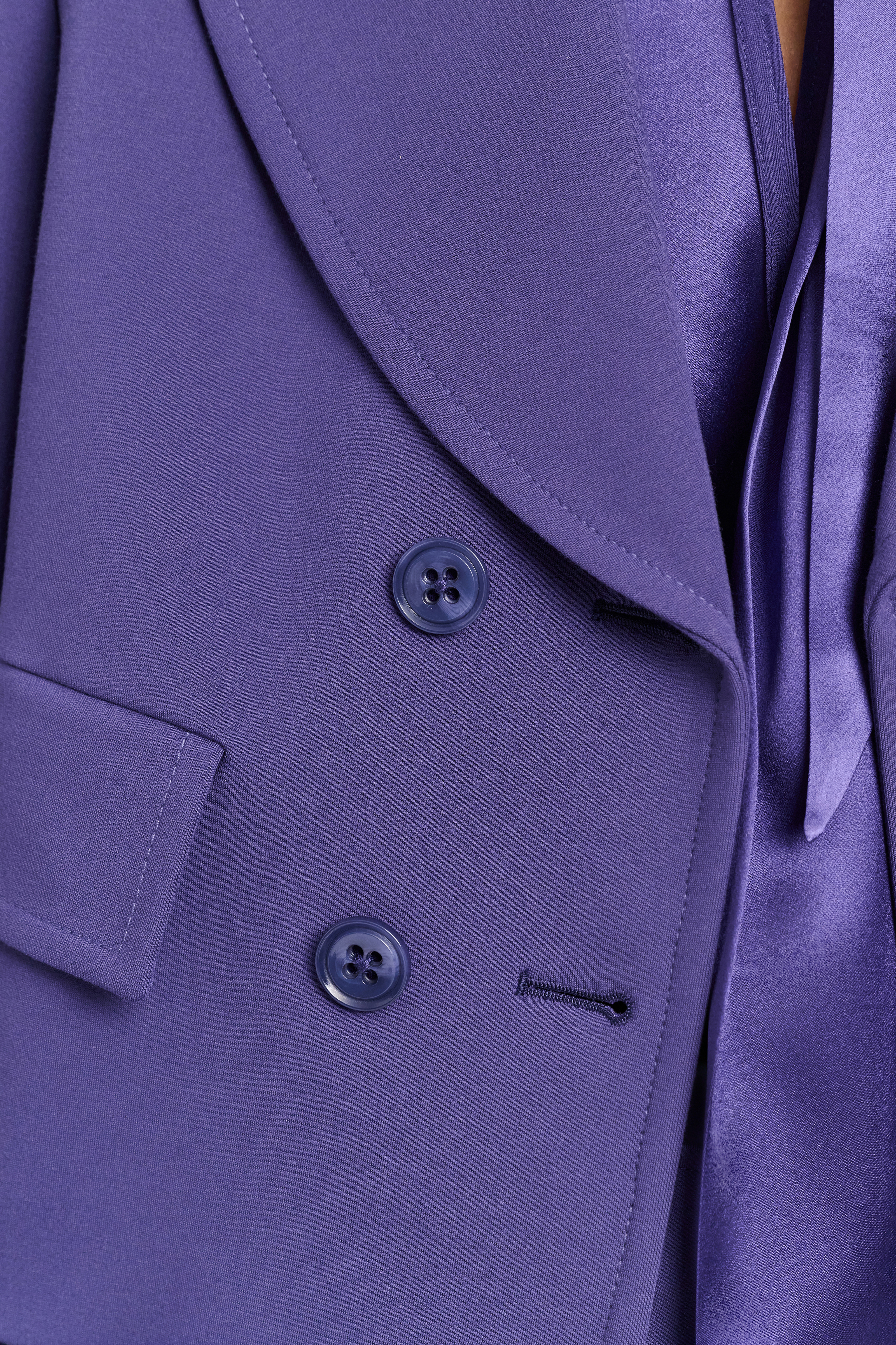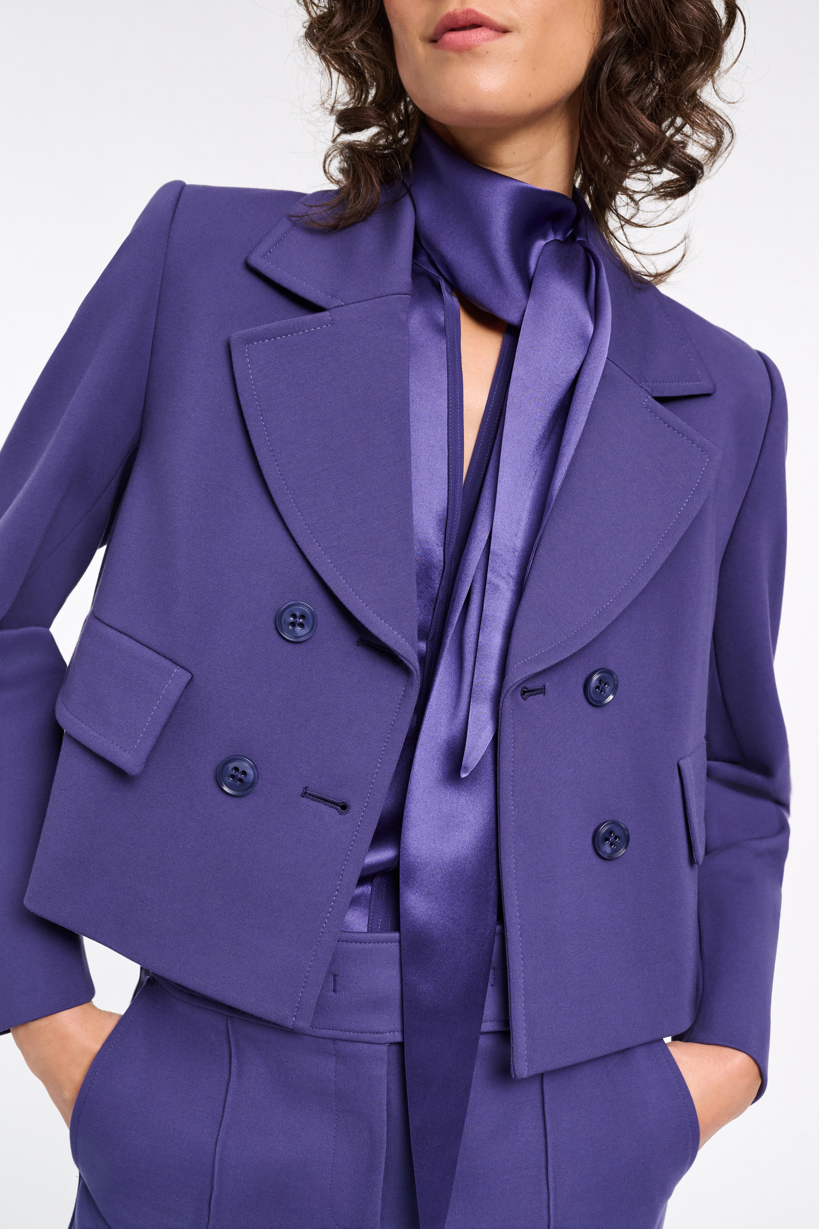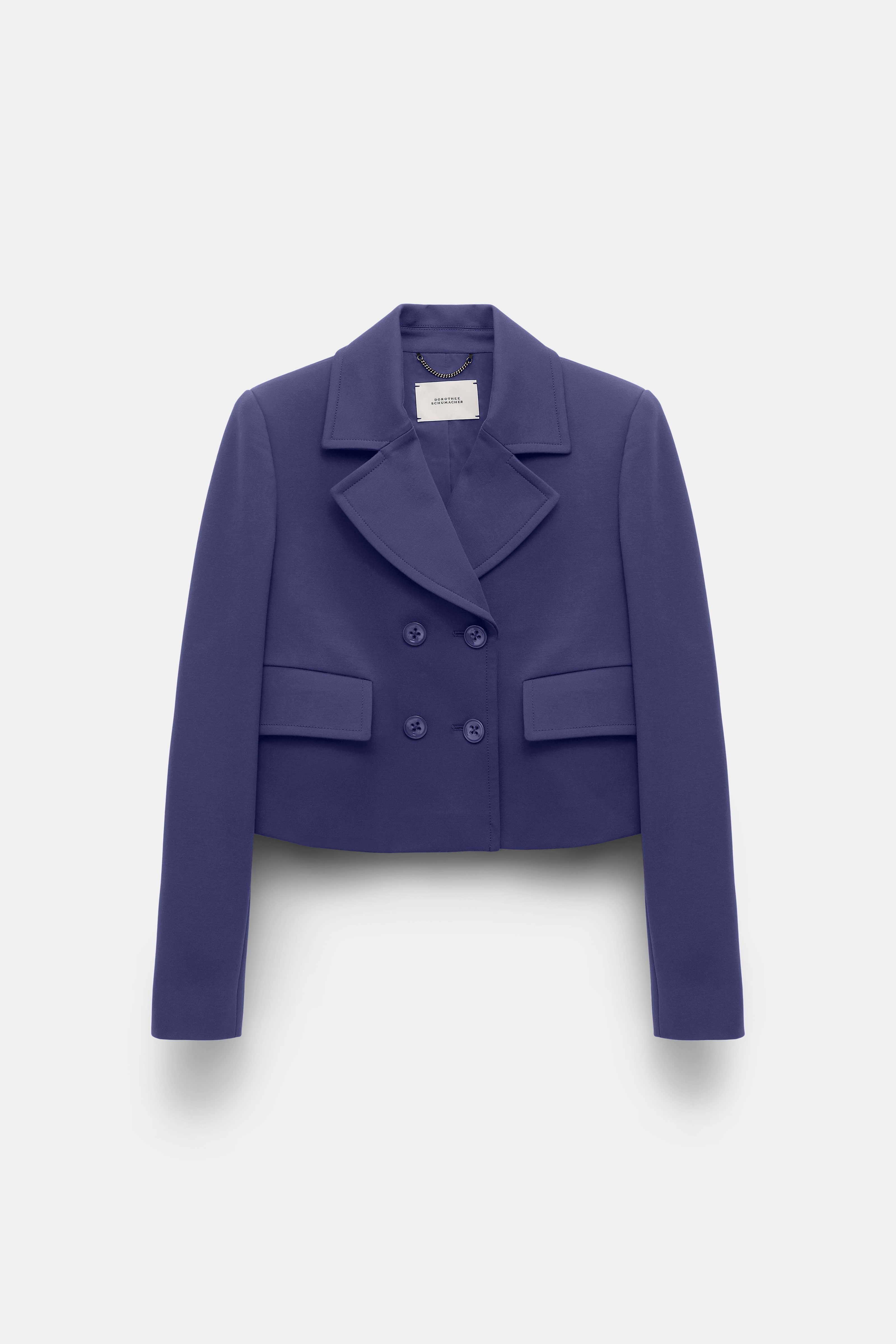 Der zweireihige Blazer ist aus softem Punto Milano gefertigt und hat eine verkürzte Silhouette.