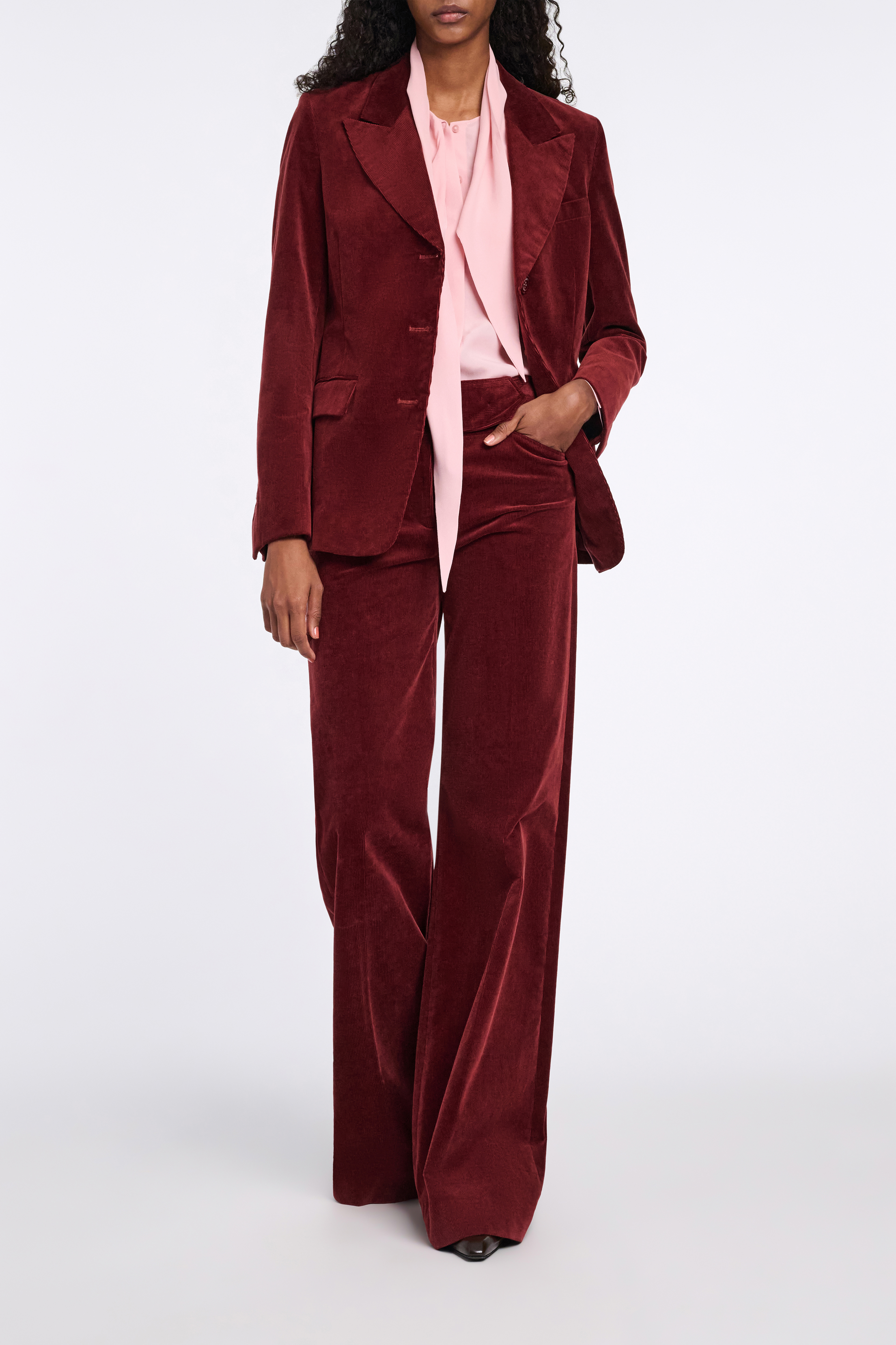 Ein angesetztes Schal-Element und die verdeckte Knopfleiste zeichnen das Design aus.