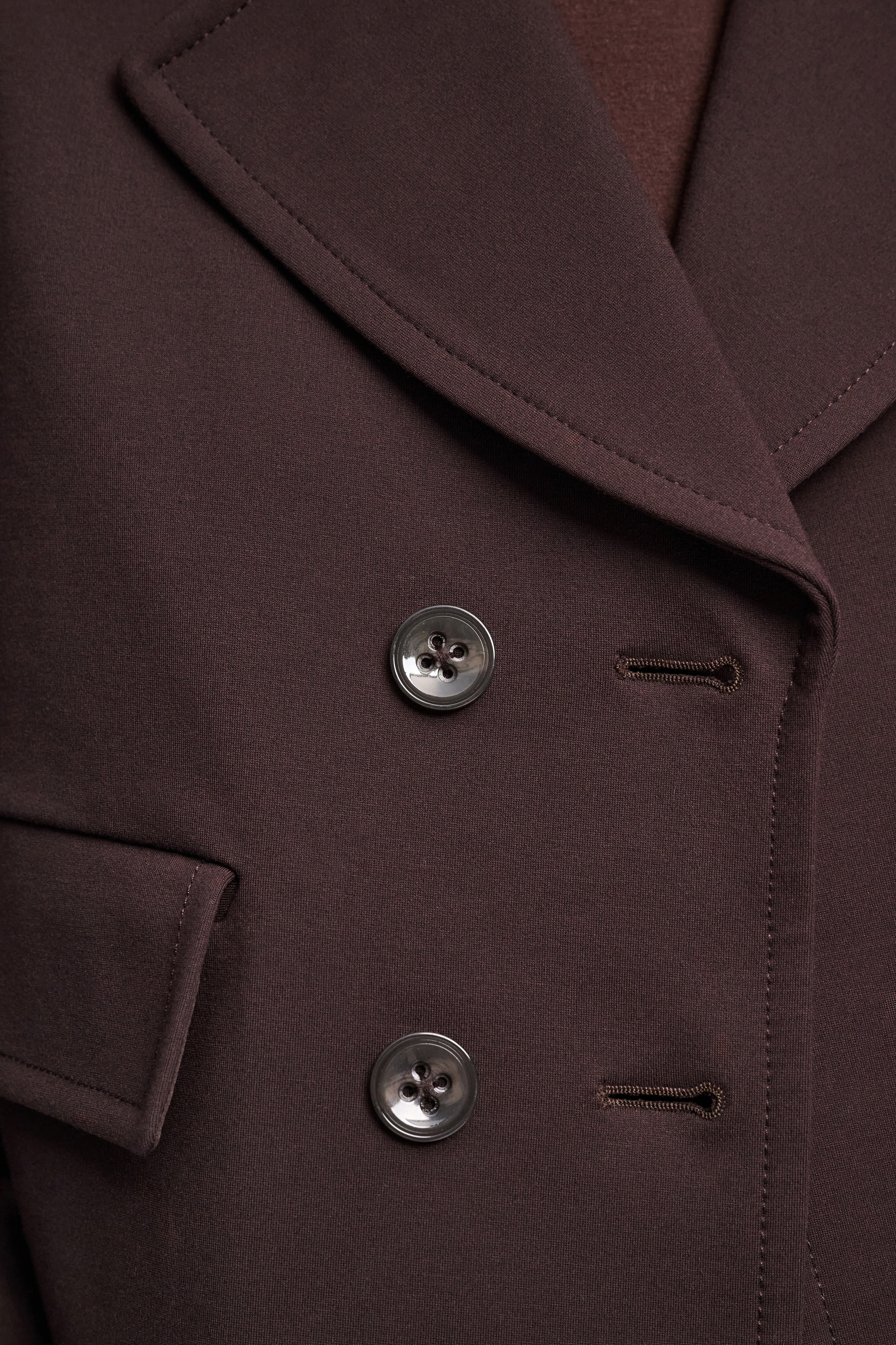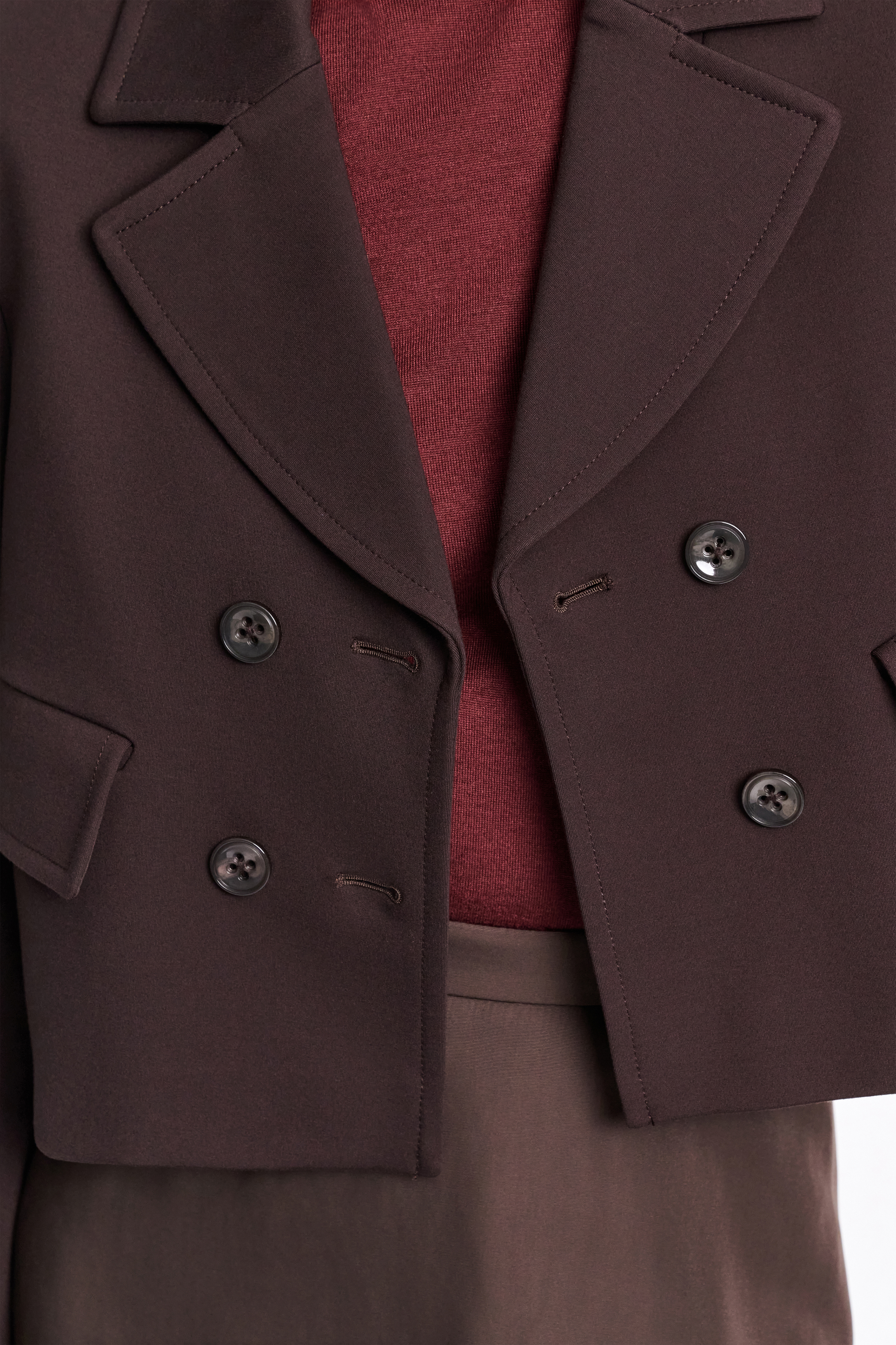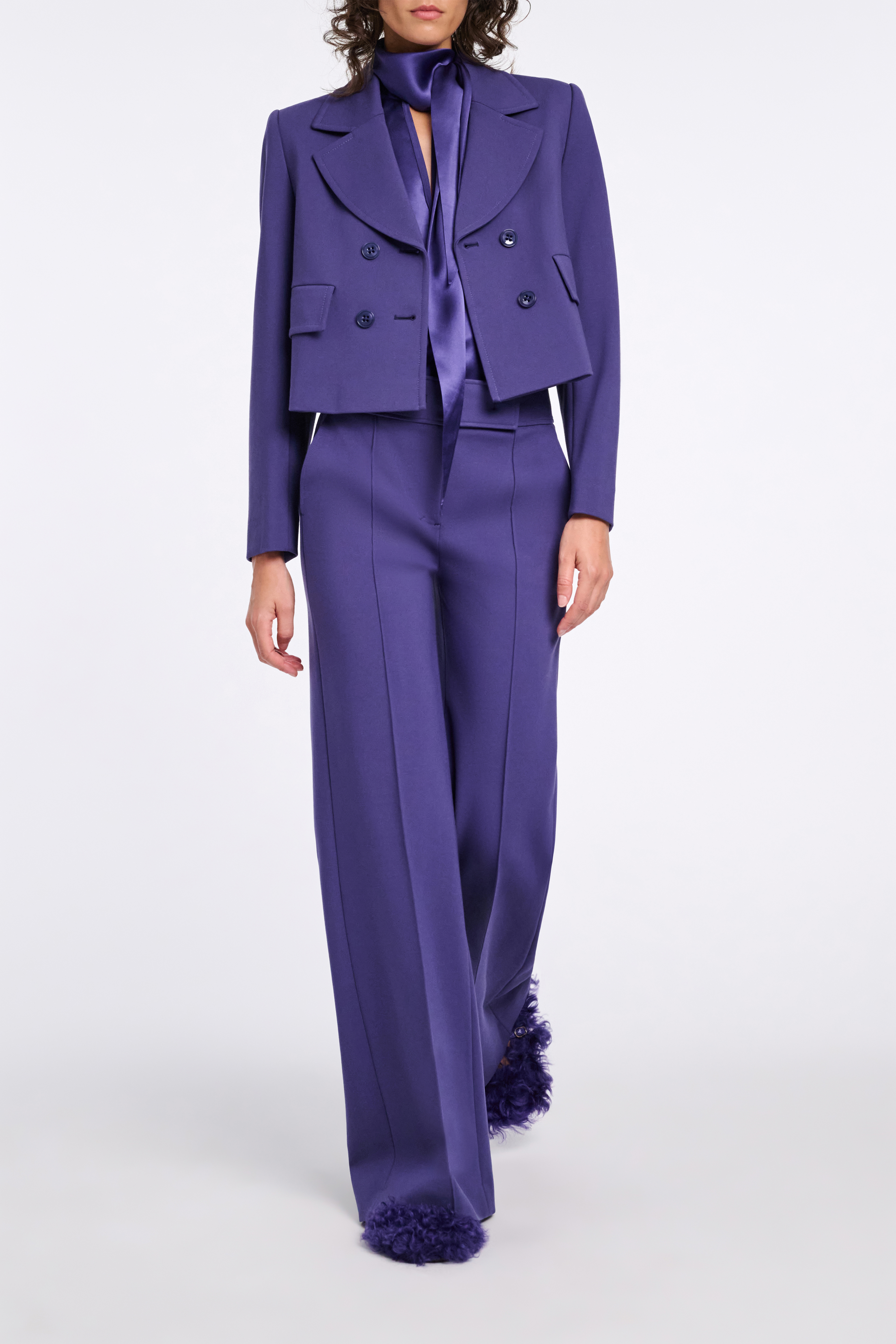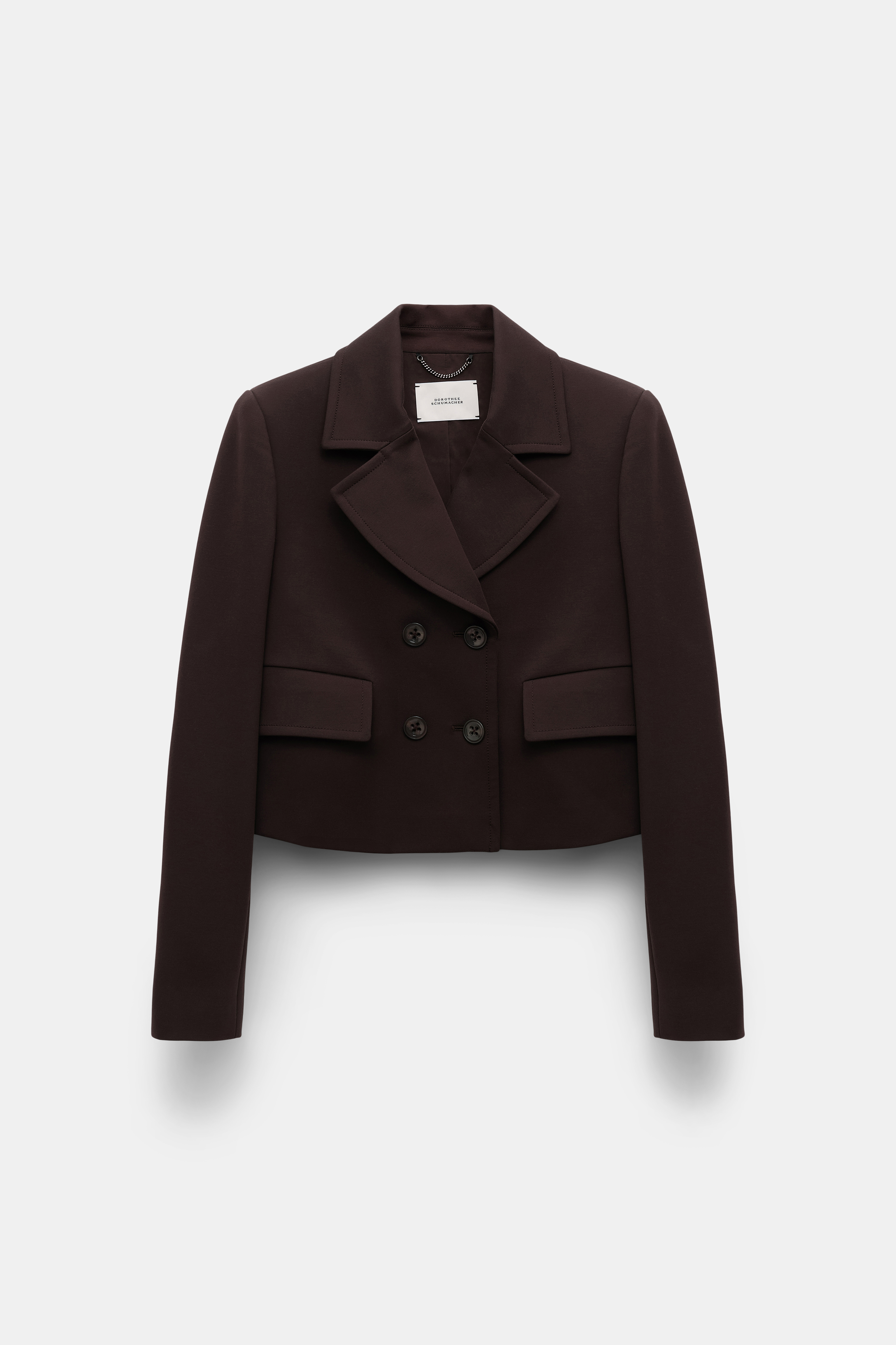 Der zweireihige Blazer ist aus softem Punto Milano gefertigt und hat eine verkürzte Silhouette.