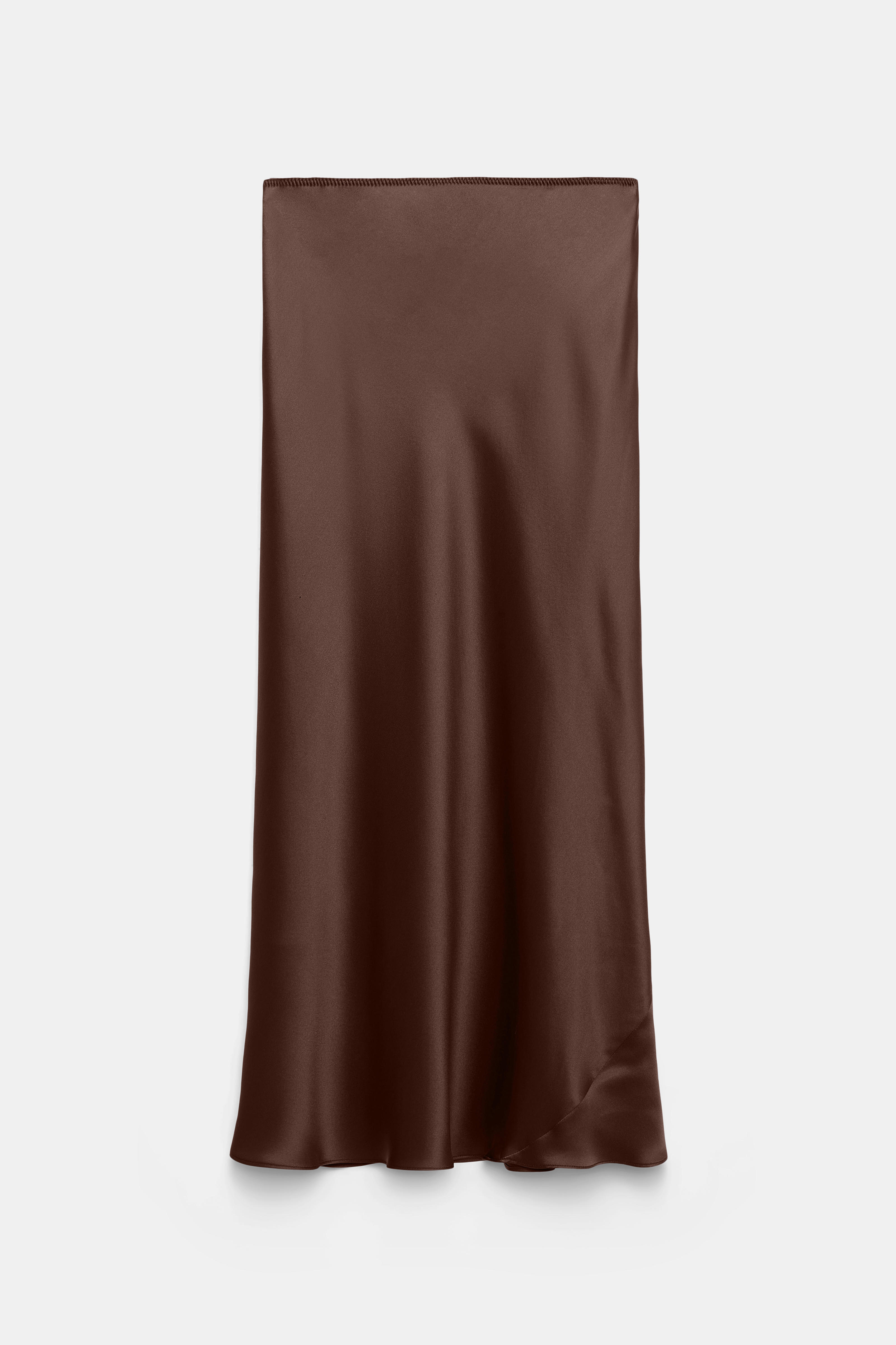 Der Rock ist aus Seidensatin gefertigt und überzeugt mit einem eleganten Bias-Cut.