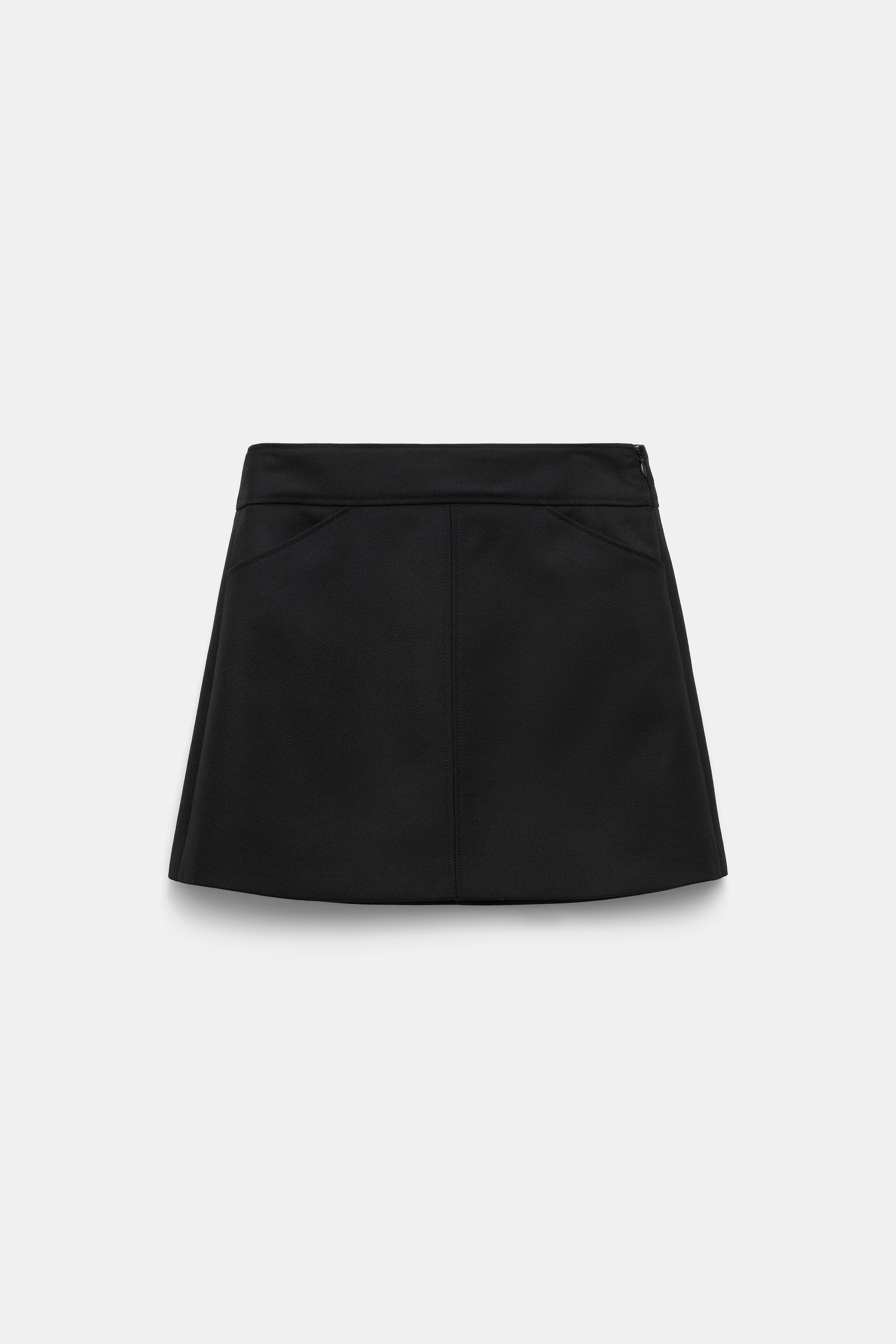 Ein breiter Bund und schräge Eingrifftaschen ergänzen das Design.