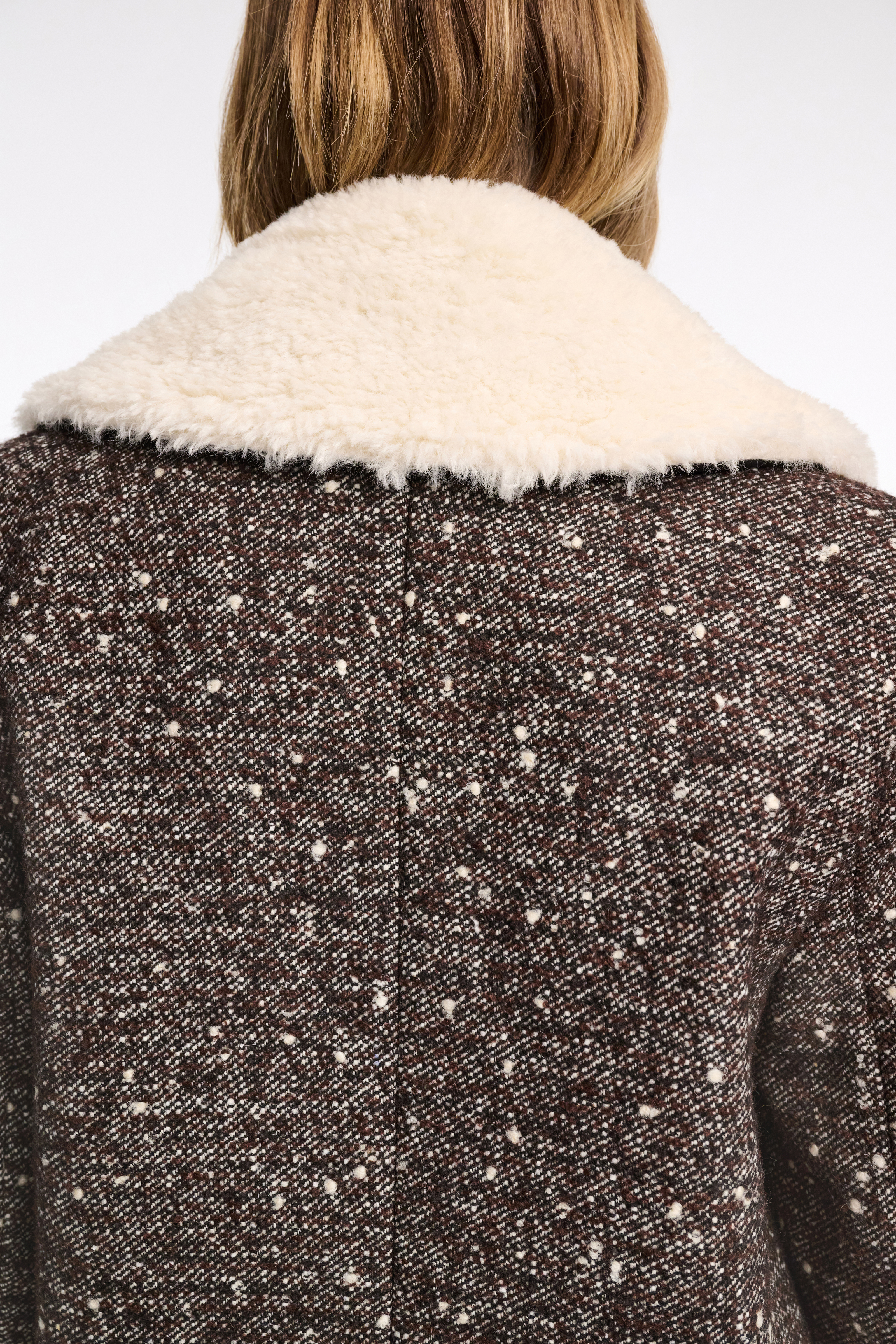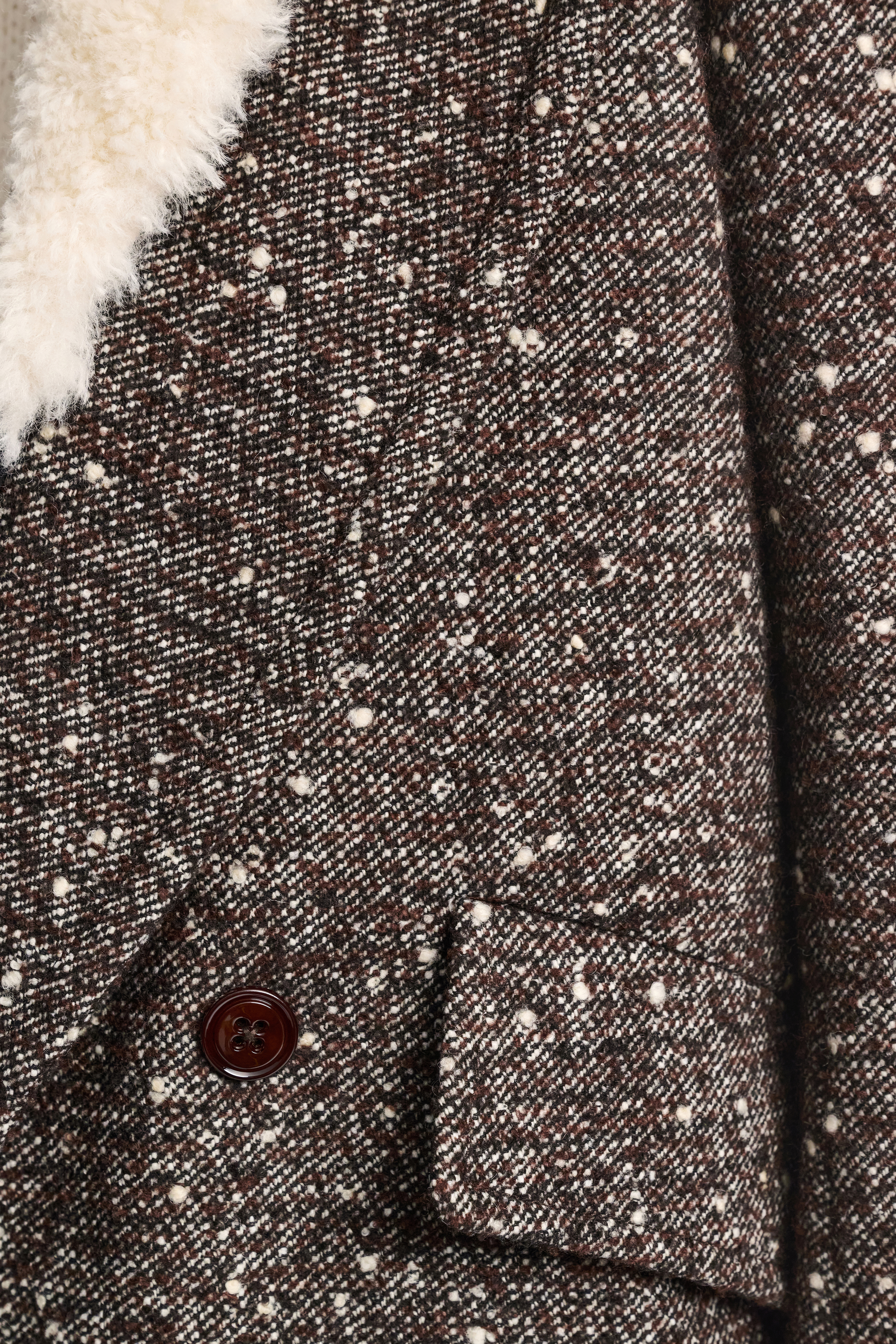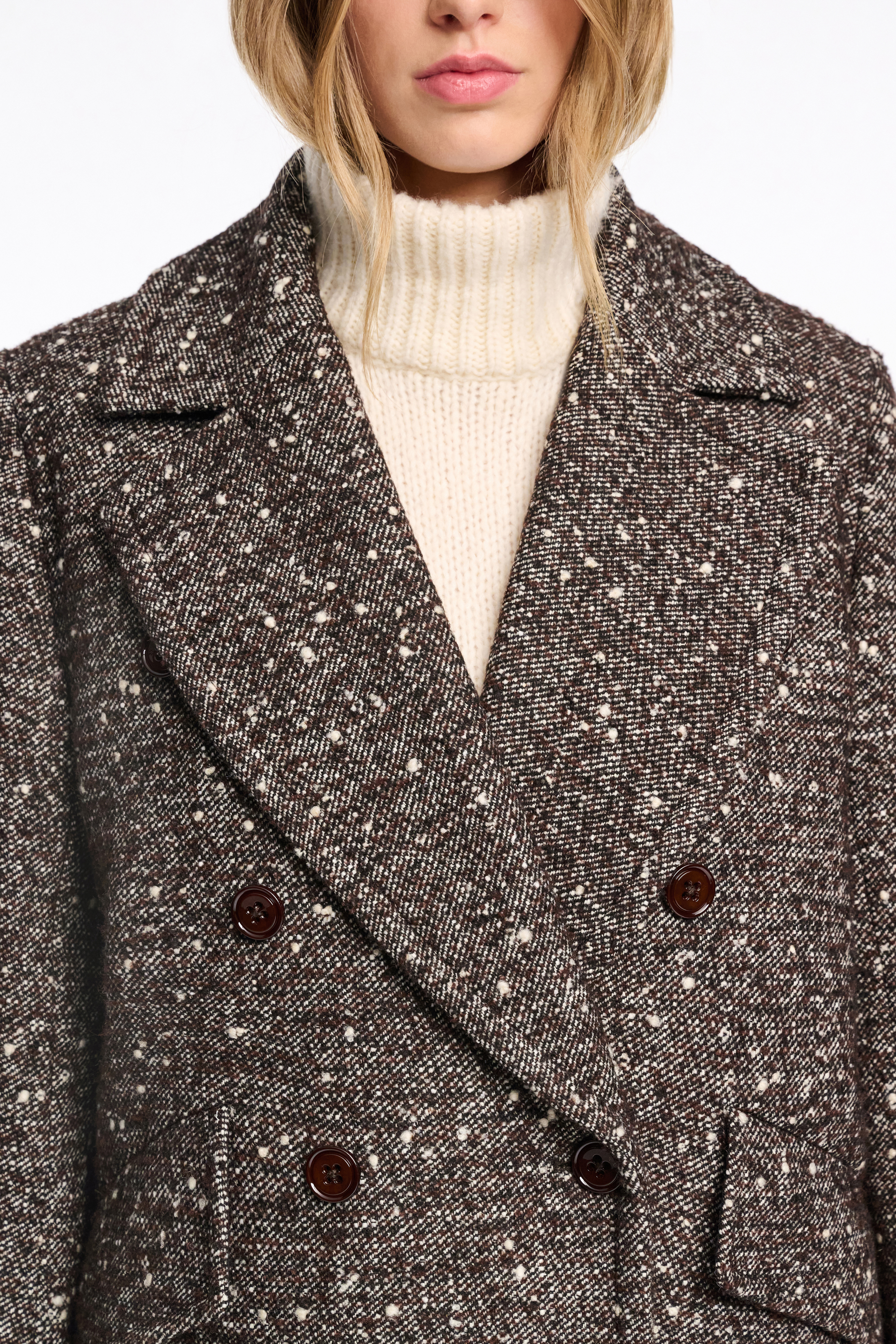 Der zweireihige Mantel ist aus strukturiertem Tweed gefertigt und vollständig gefüttert.