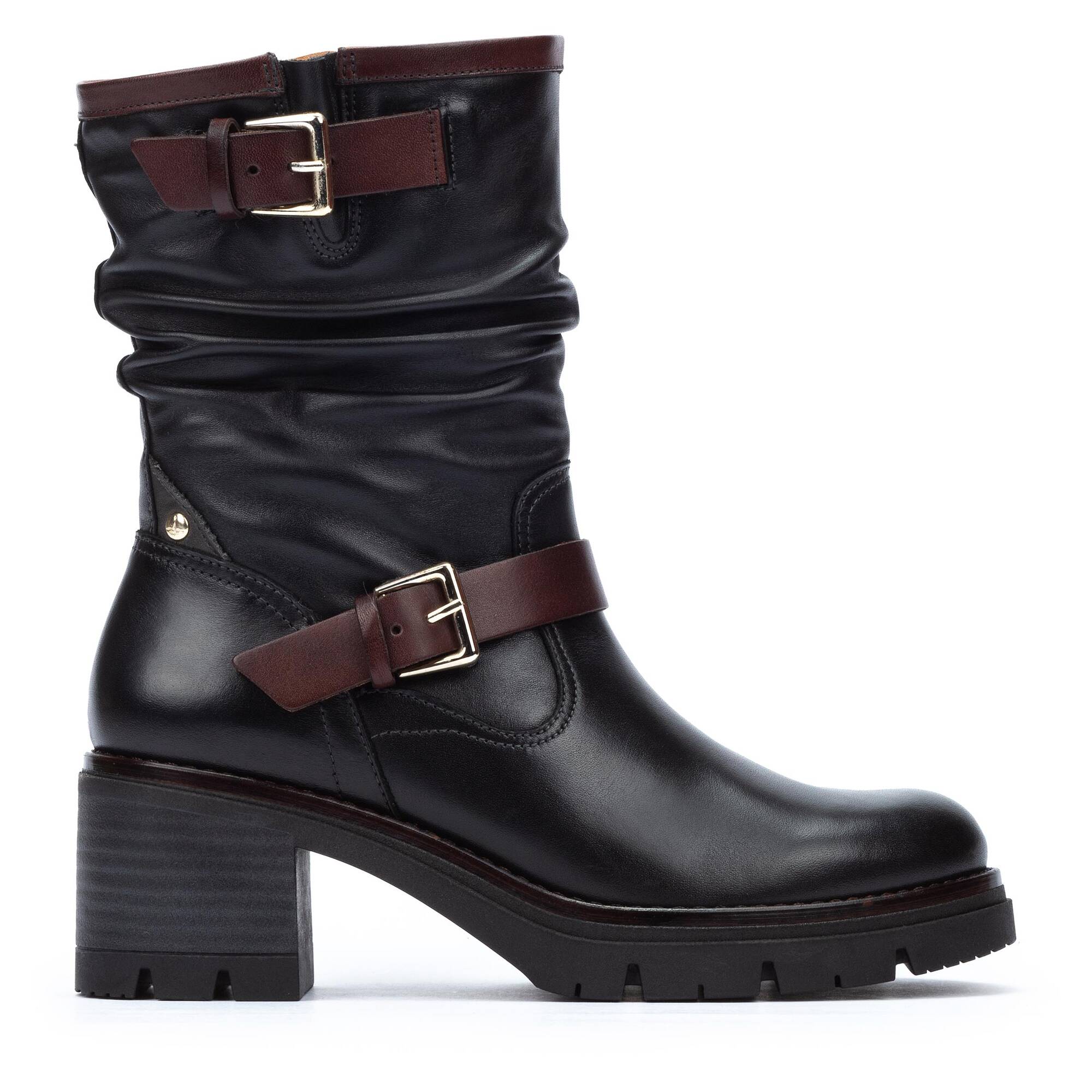 Biker-Stiefel mit abgerundeter Zehenpartie, halbgekräuseltem Obermaterial, klobigem Absatz und gezackter Sohle.