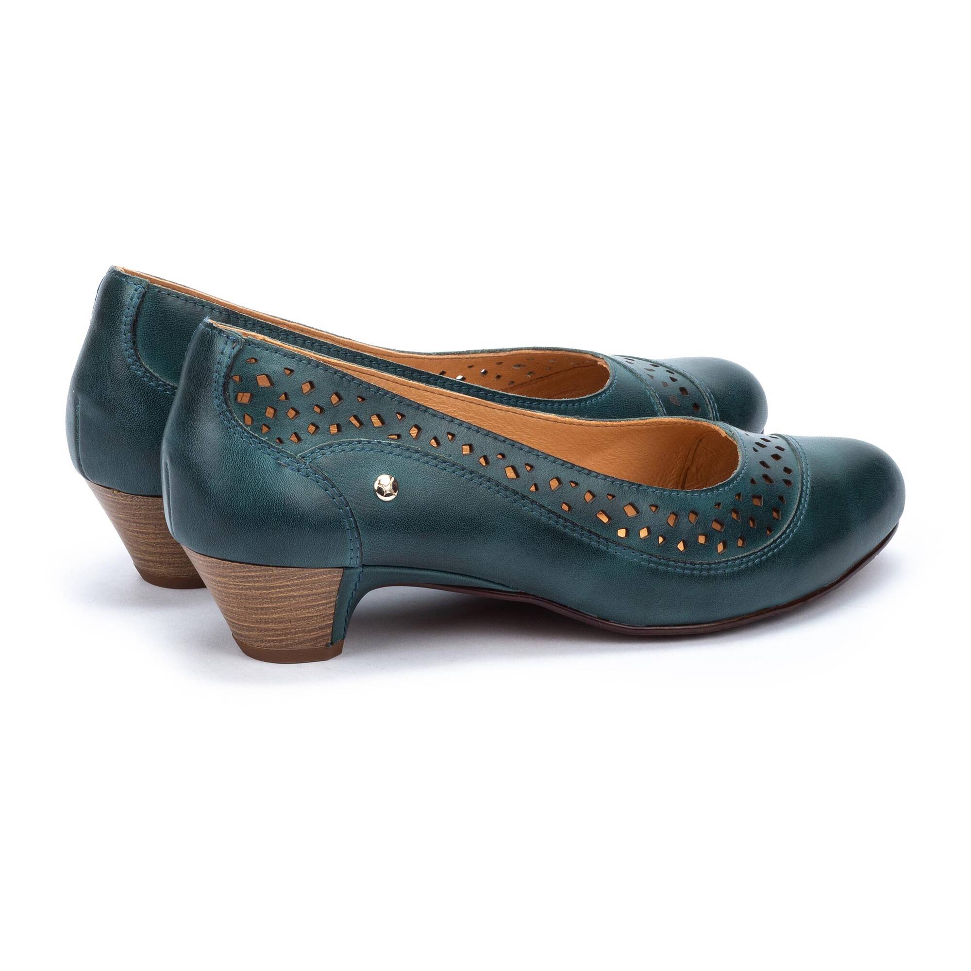 Sie haben ein gestanztes Oberteil und einen kontrastierenden Absatz in Holzoptik.