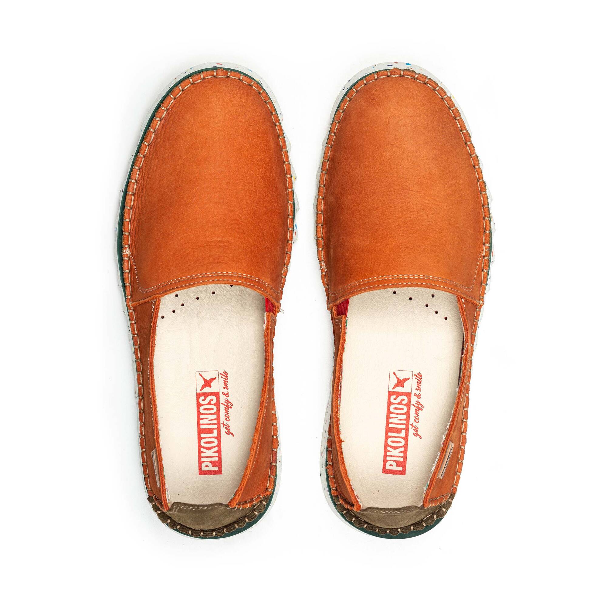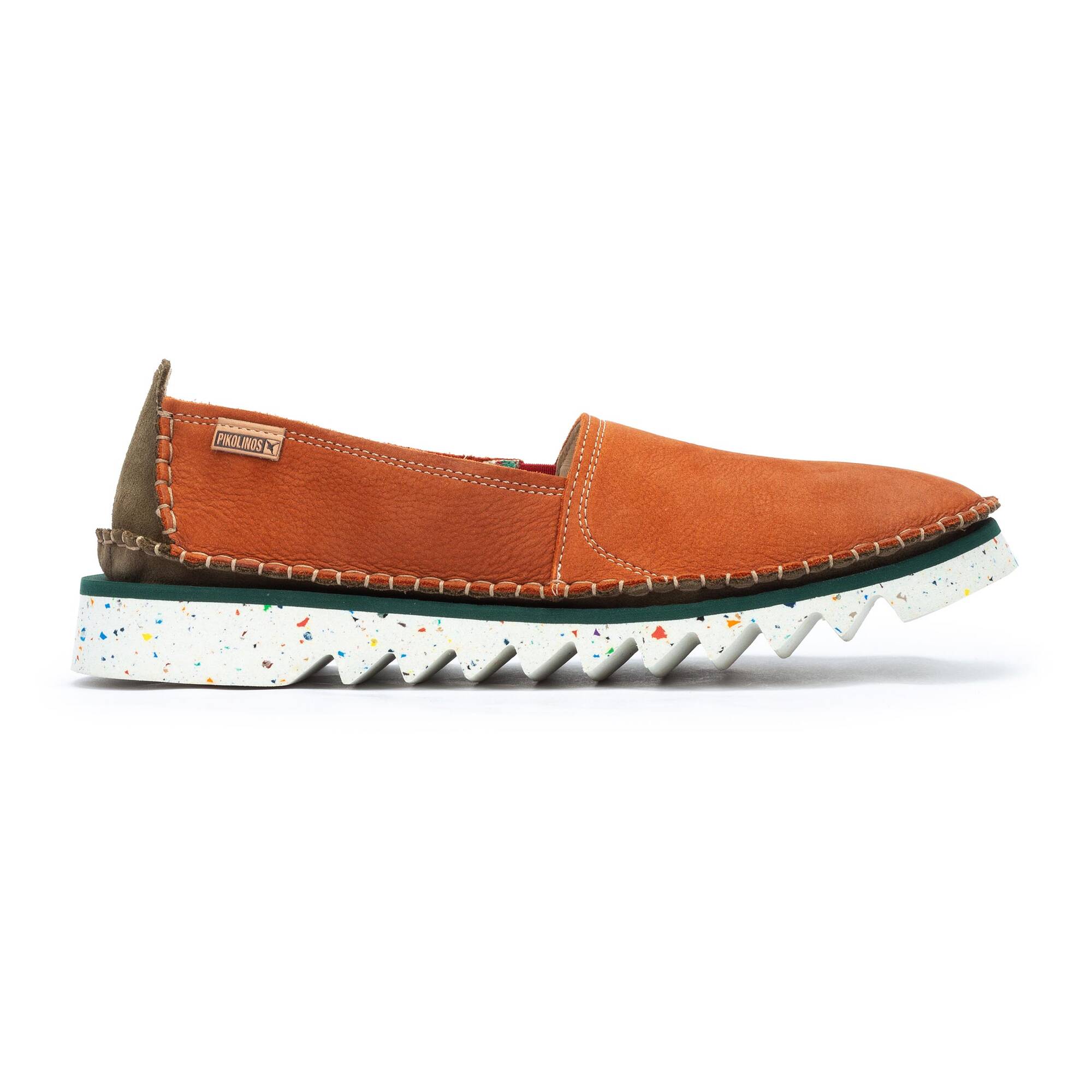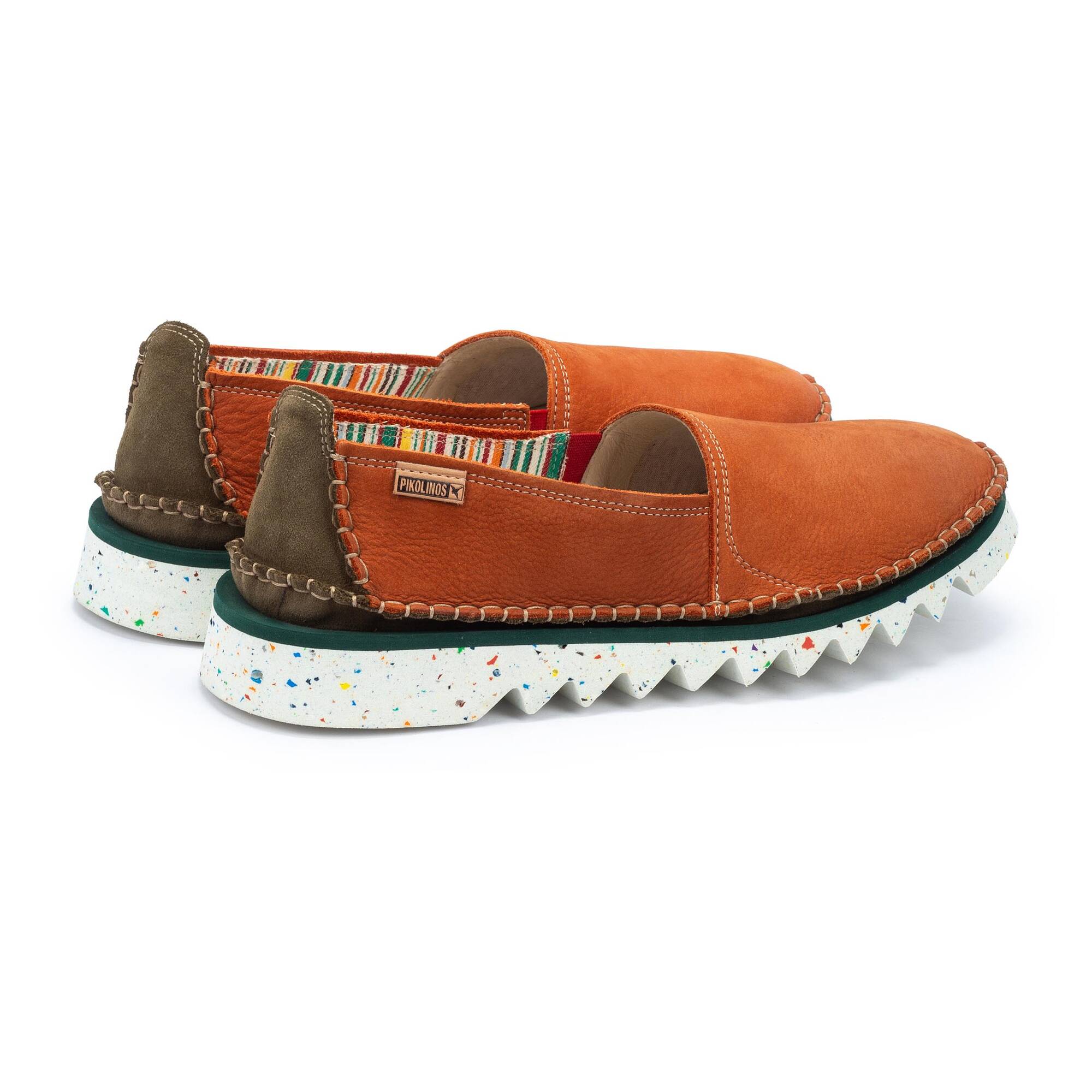 Le damos un giro al clásico mocasín incorporando en la gama Villena componentes sostenibles y detalles que lo hacen único, como un forro multicolor de estilo étnico y una suela dentada con efecto de gotas de pintura.