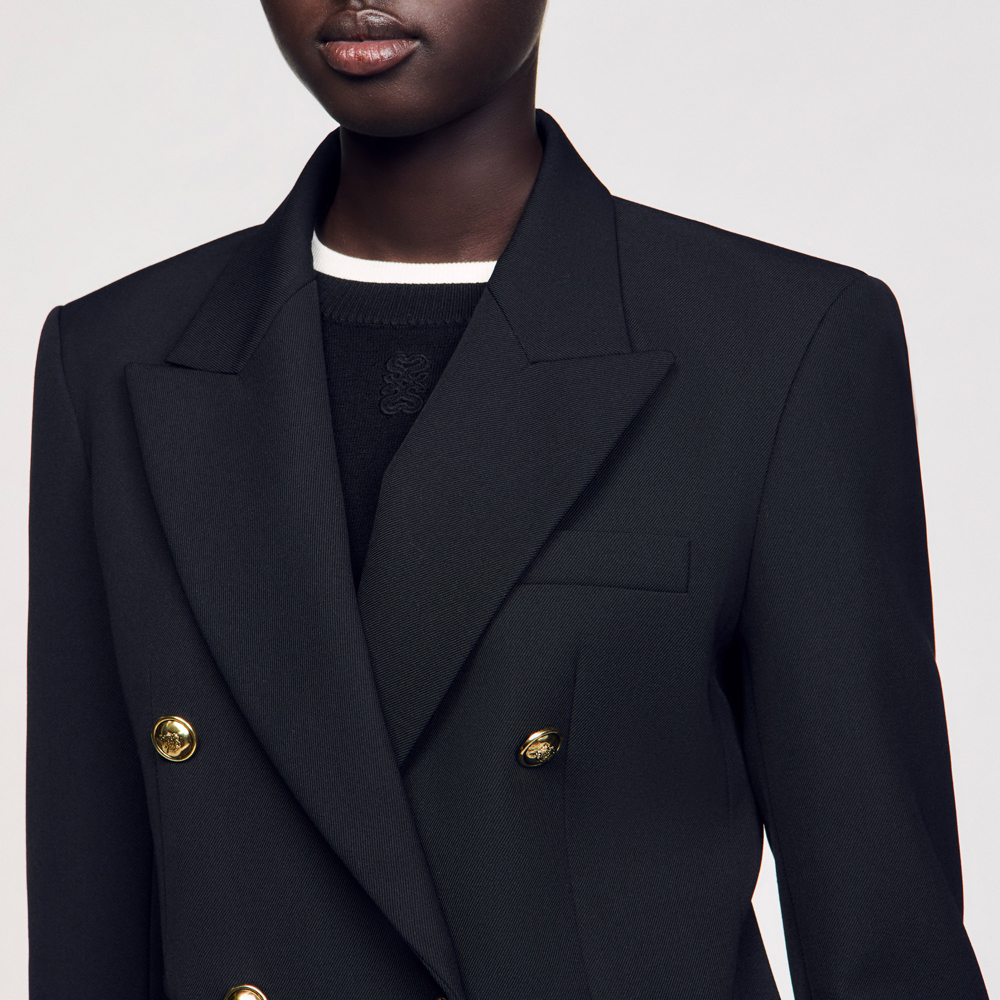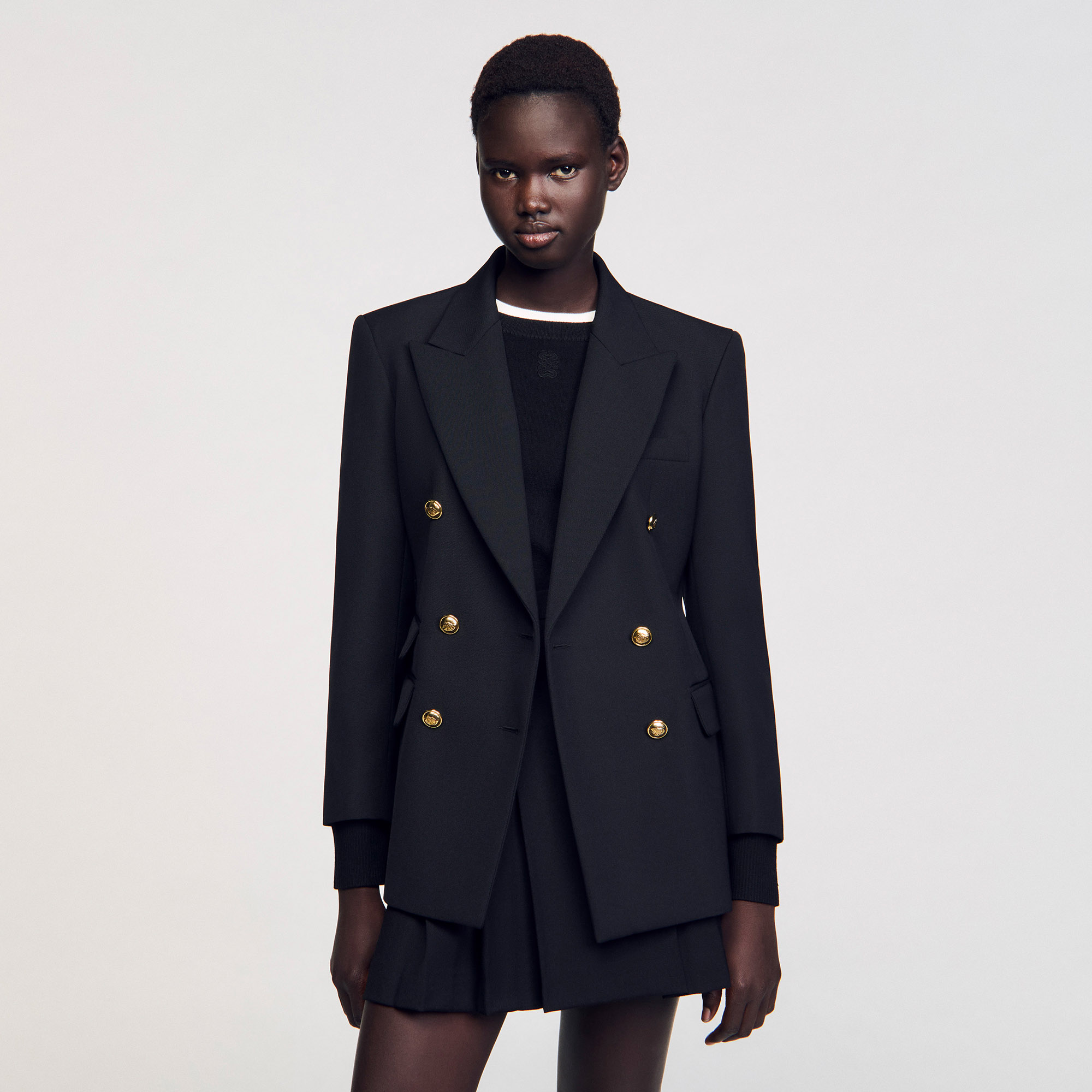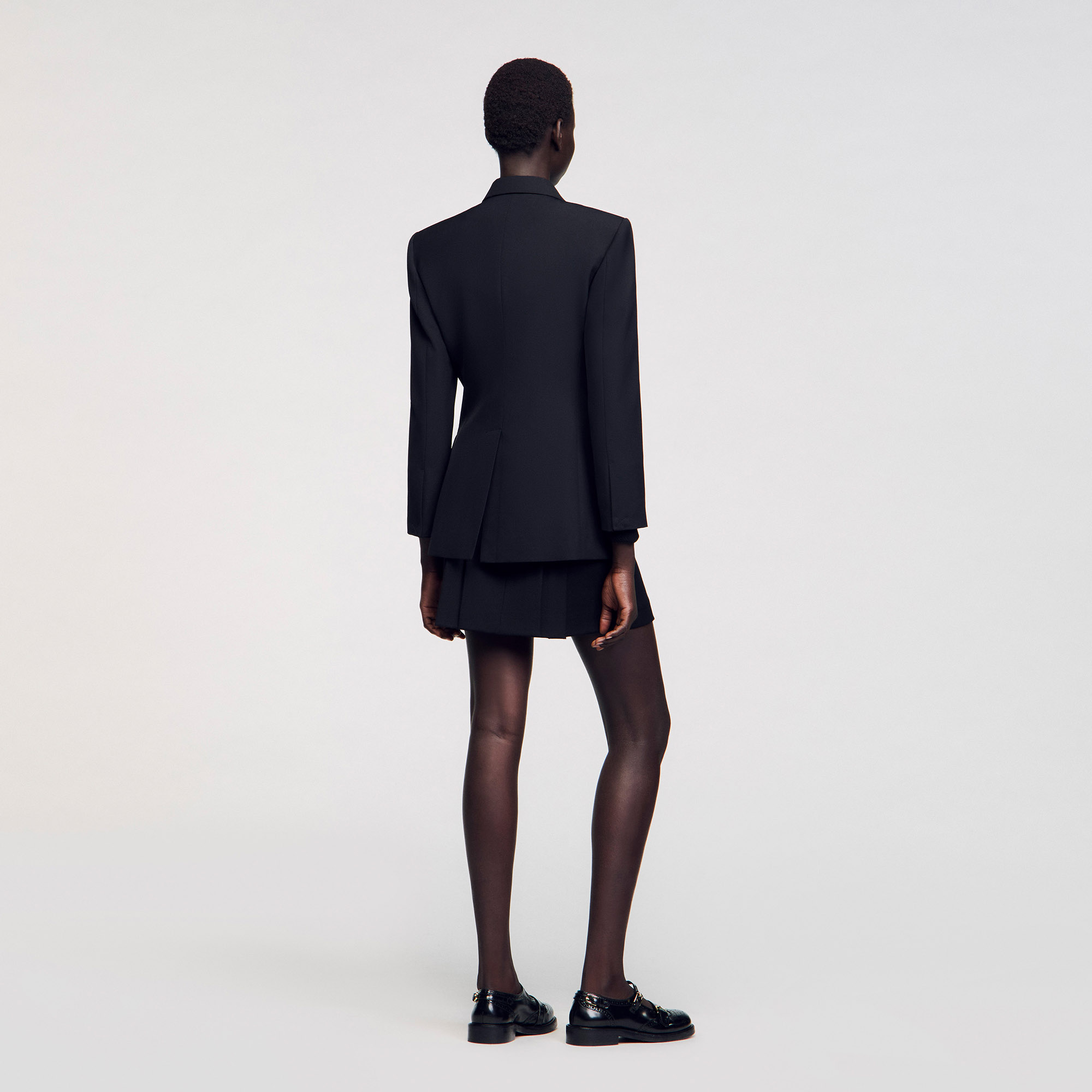Sandro polyester Slim-fit double-breasted suit jacket with lapel collar, long sleeves and flap pockets Sandro Women's suit jacket Lapel collar Long sleeves Welt flap pockets Front darts This jacket matches the trousers.