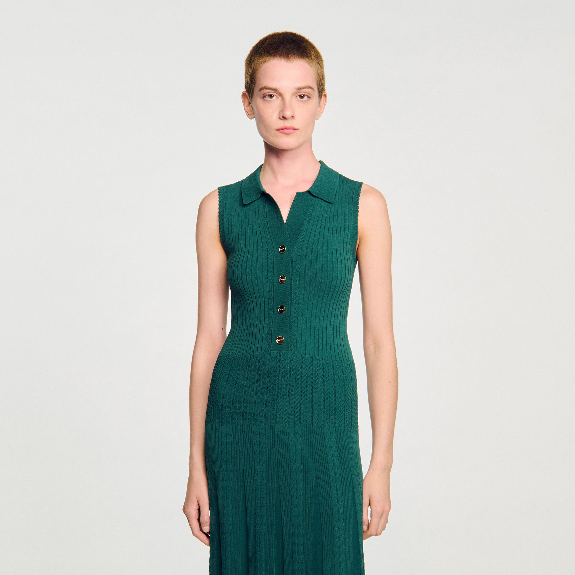Sandro Women's maxi knit dress Polo collar V-neckline Front button fastening Sleeveless Designed for a flared fit.