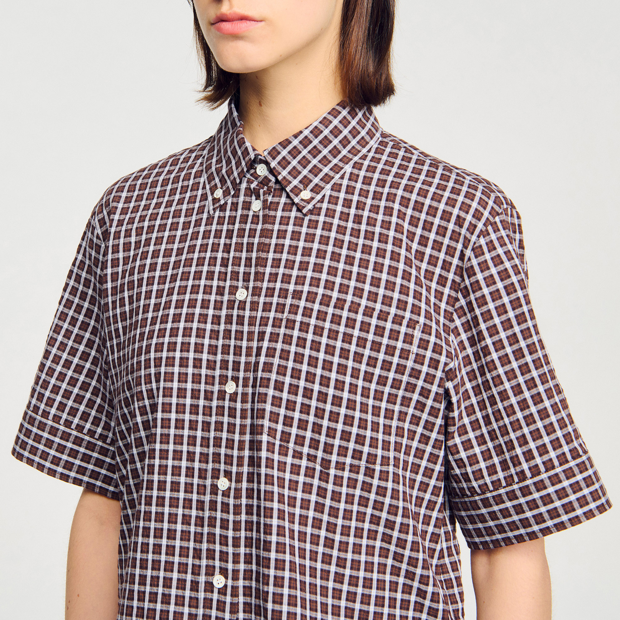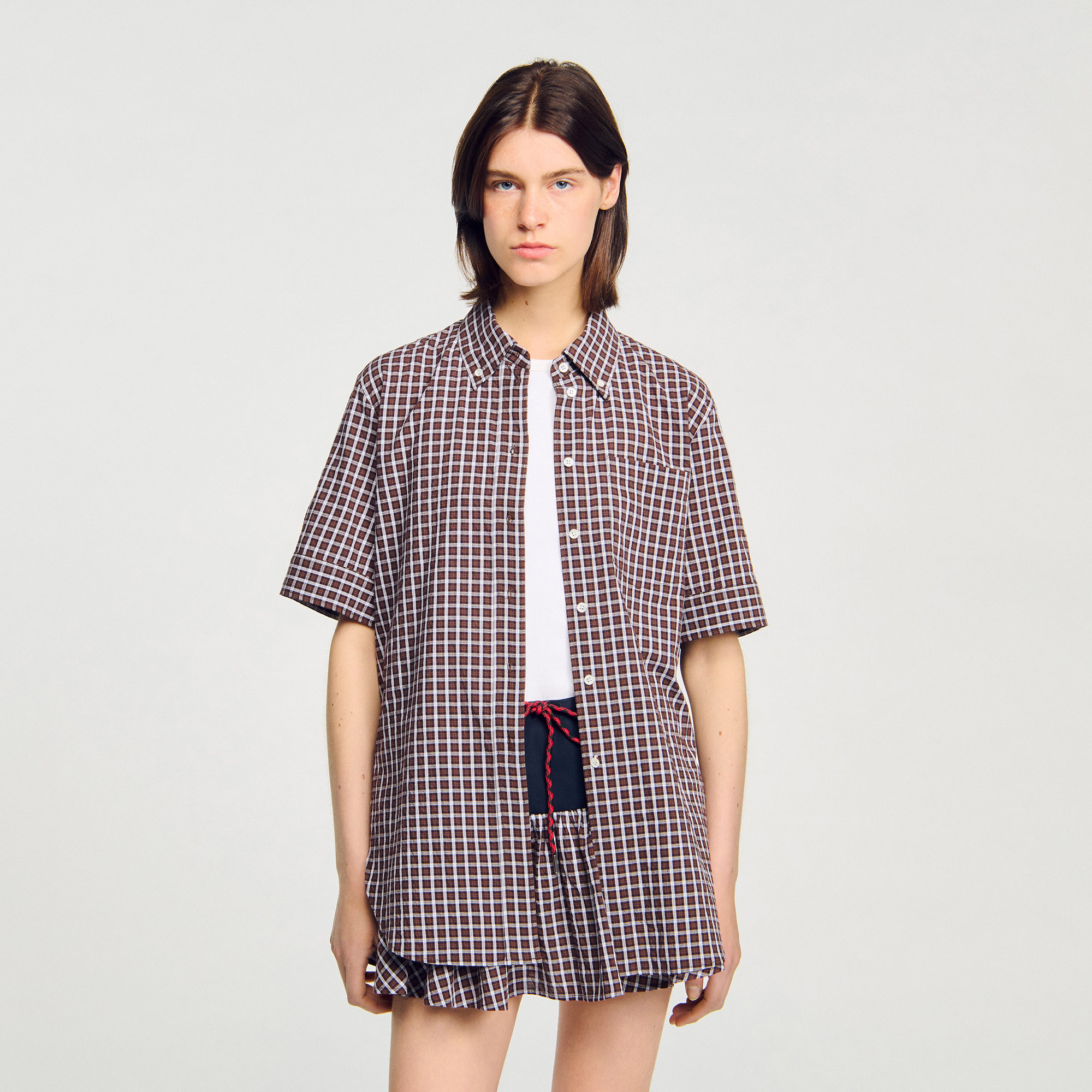 Sandro cotton Oversized checkered shirt with a longer back, featuring a shirt collar and short sleeves.