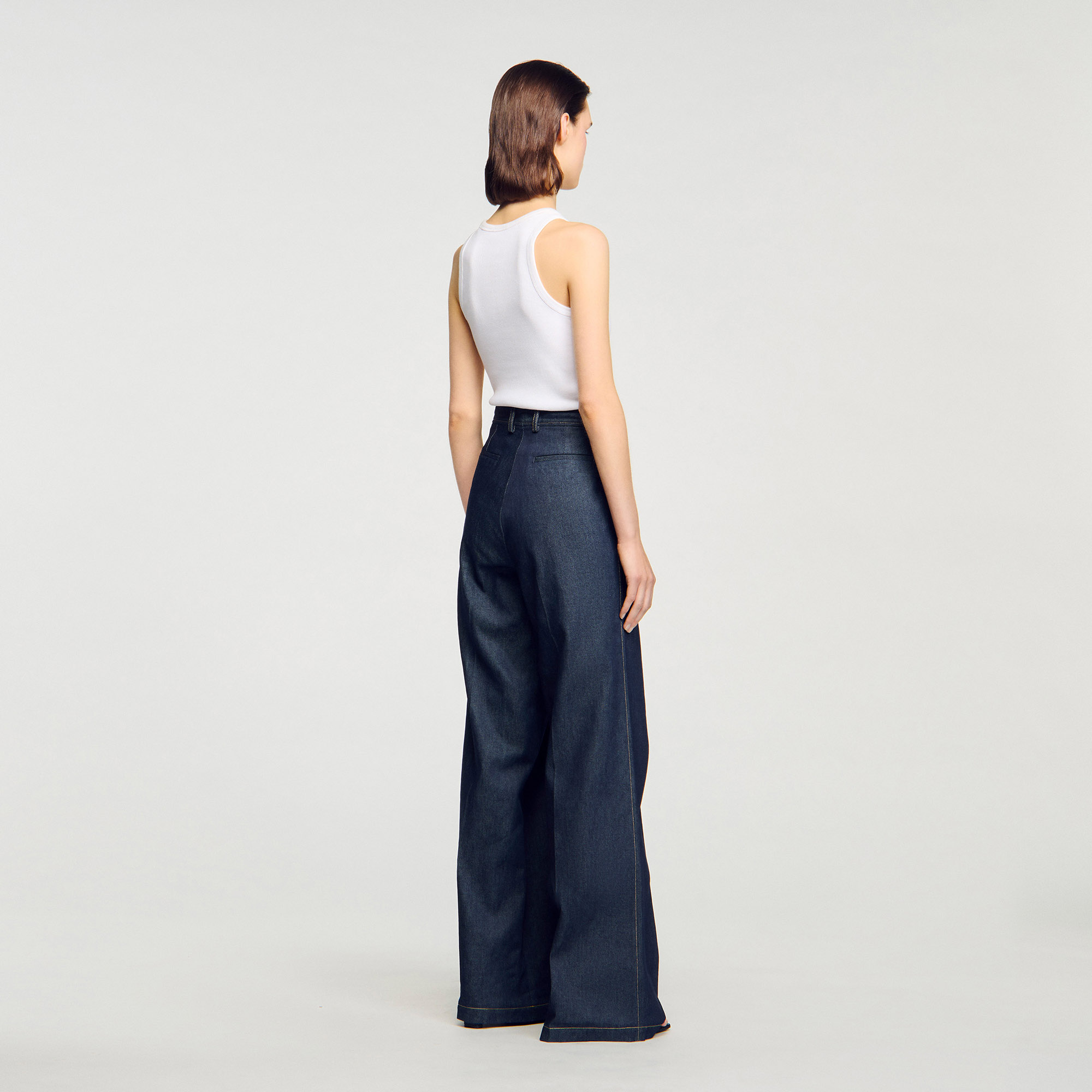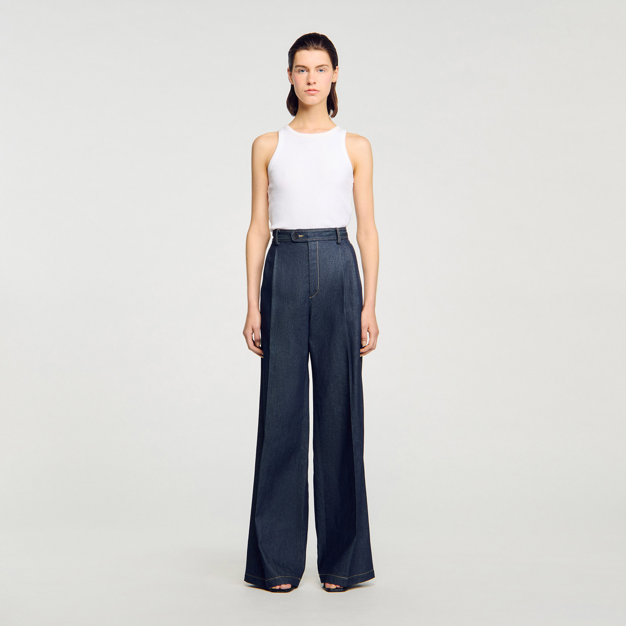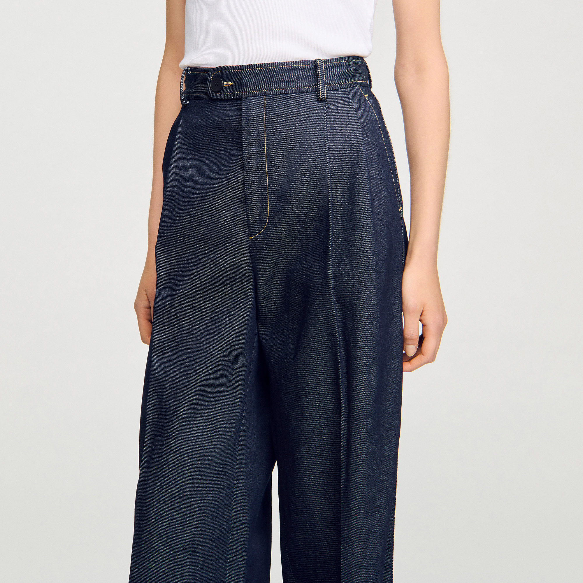 Sandro Women's wide-leg denim trousers Button fastening Italian pockets Welt pockets on the back Pleats on the front and back Designed for a boxy fit.