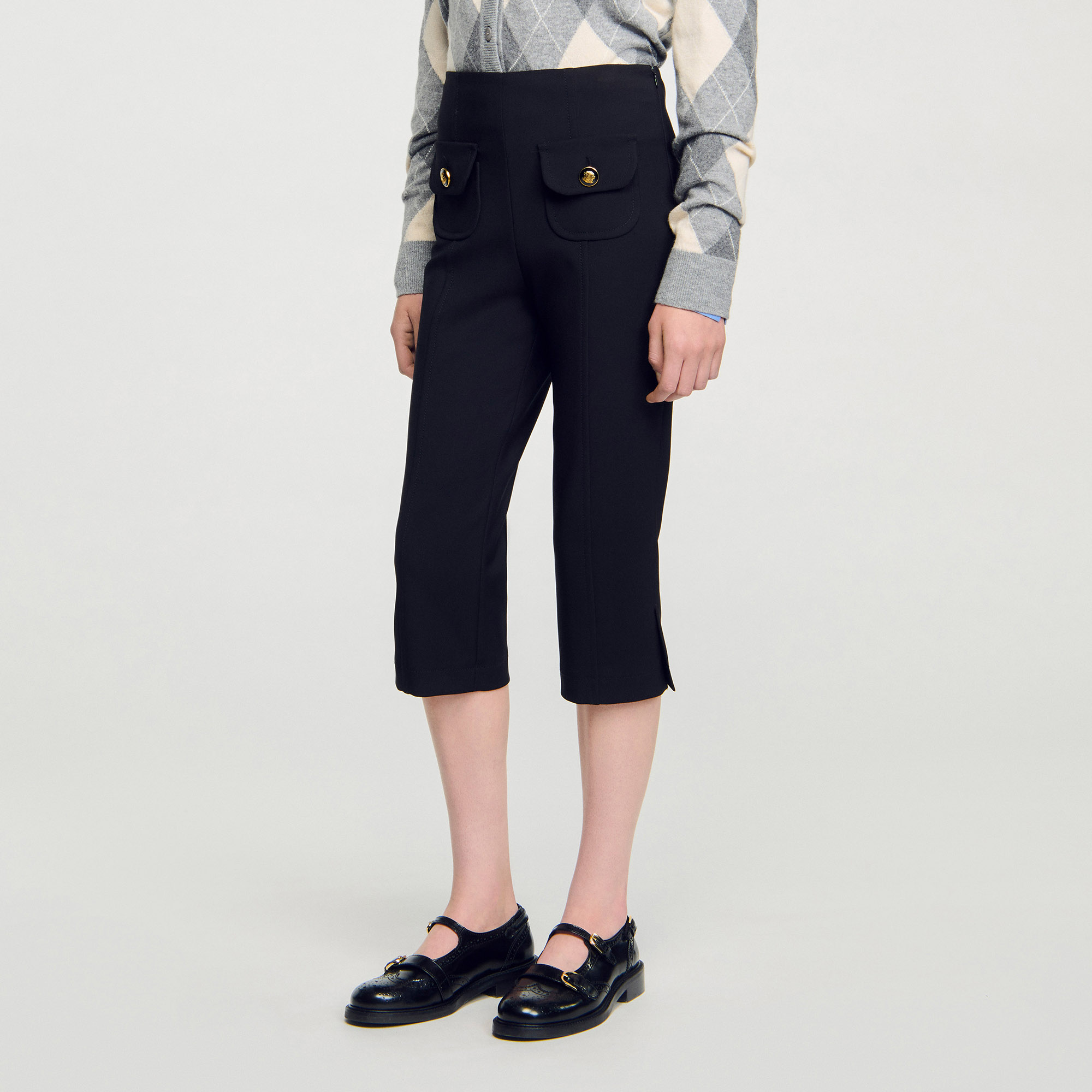 Sandro polyester Stretch capri trousers with side slits at the hem, featuring buttoned flap patch pockets and a side zip fastening.