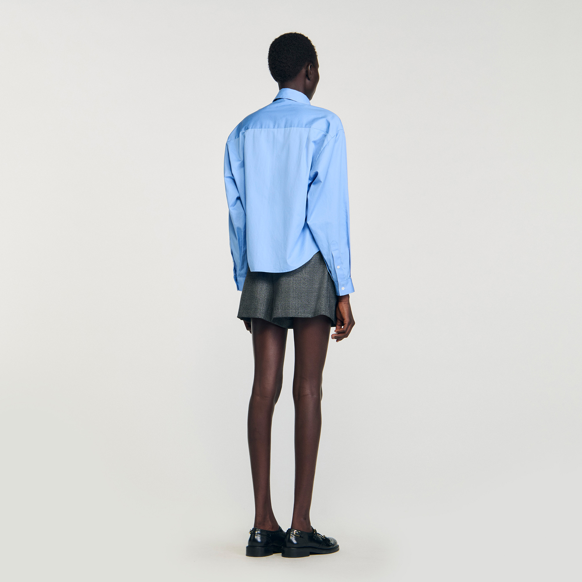 Sandro cotton Oversized cropped plain shirt with a shirt collar featuring a removable contrasting tie, long sleeves with buttoned cuffs, button fastening and an asymmetric hem.