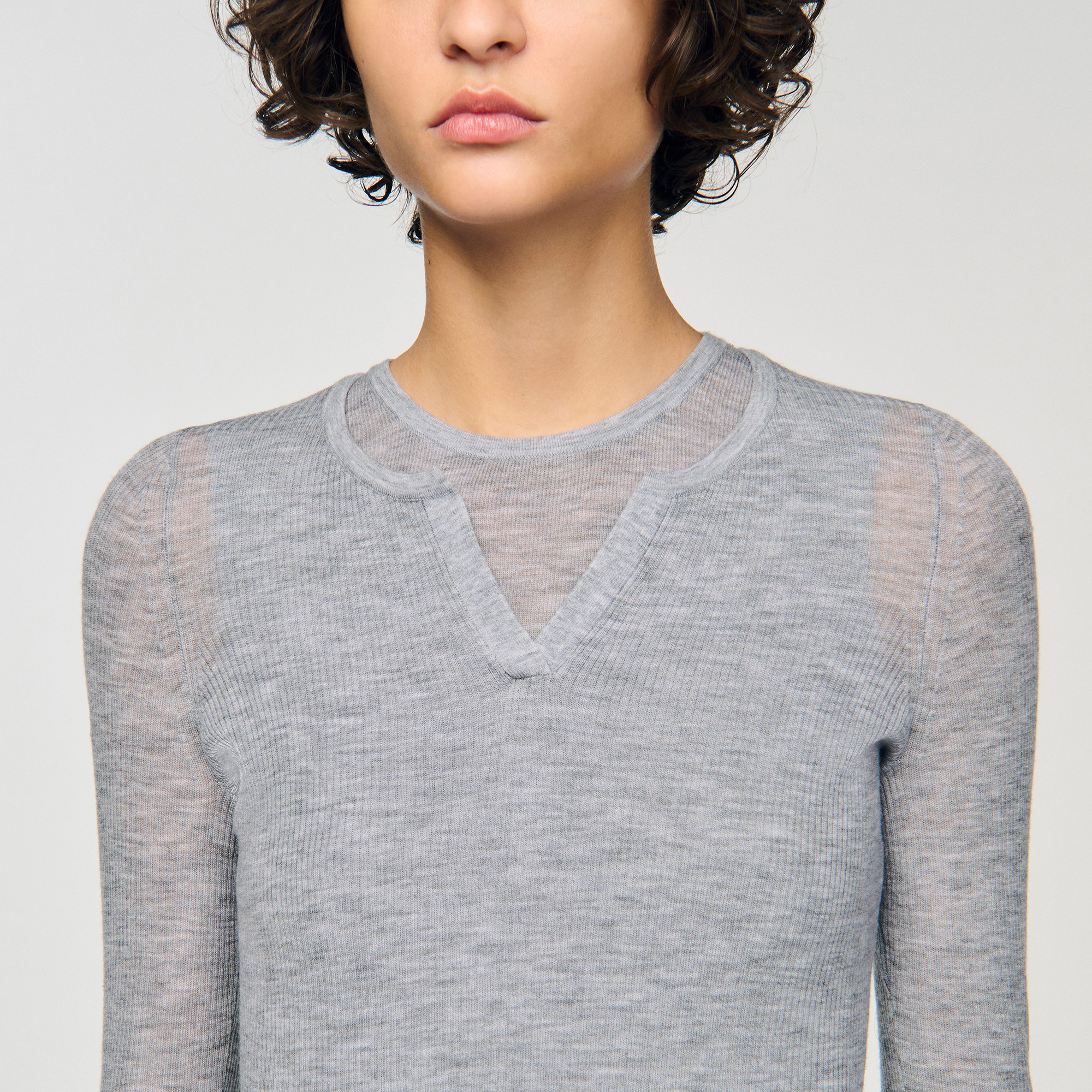 Sandro wool Layered-effect long-sleeved sweater made of a 100% wool fine rib knit and with tone-on-tone Sandro embroidery on the bottom.