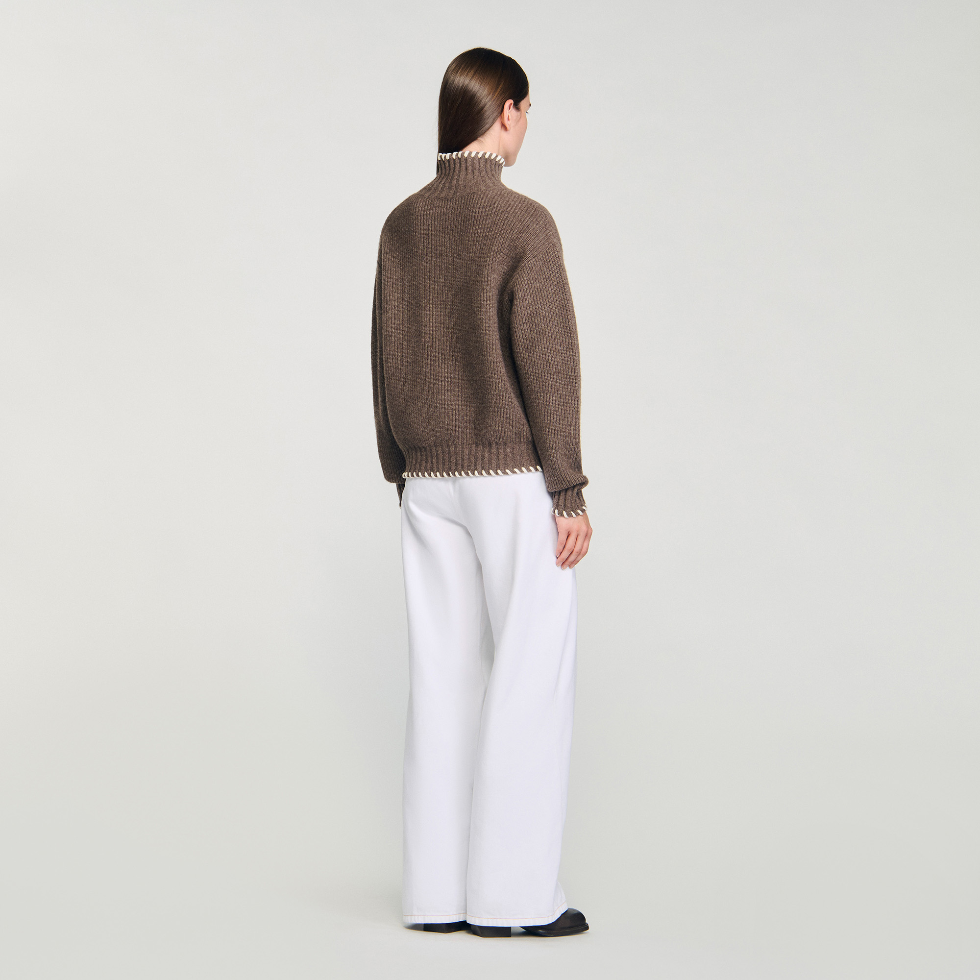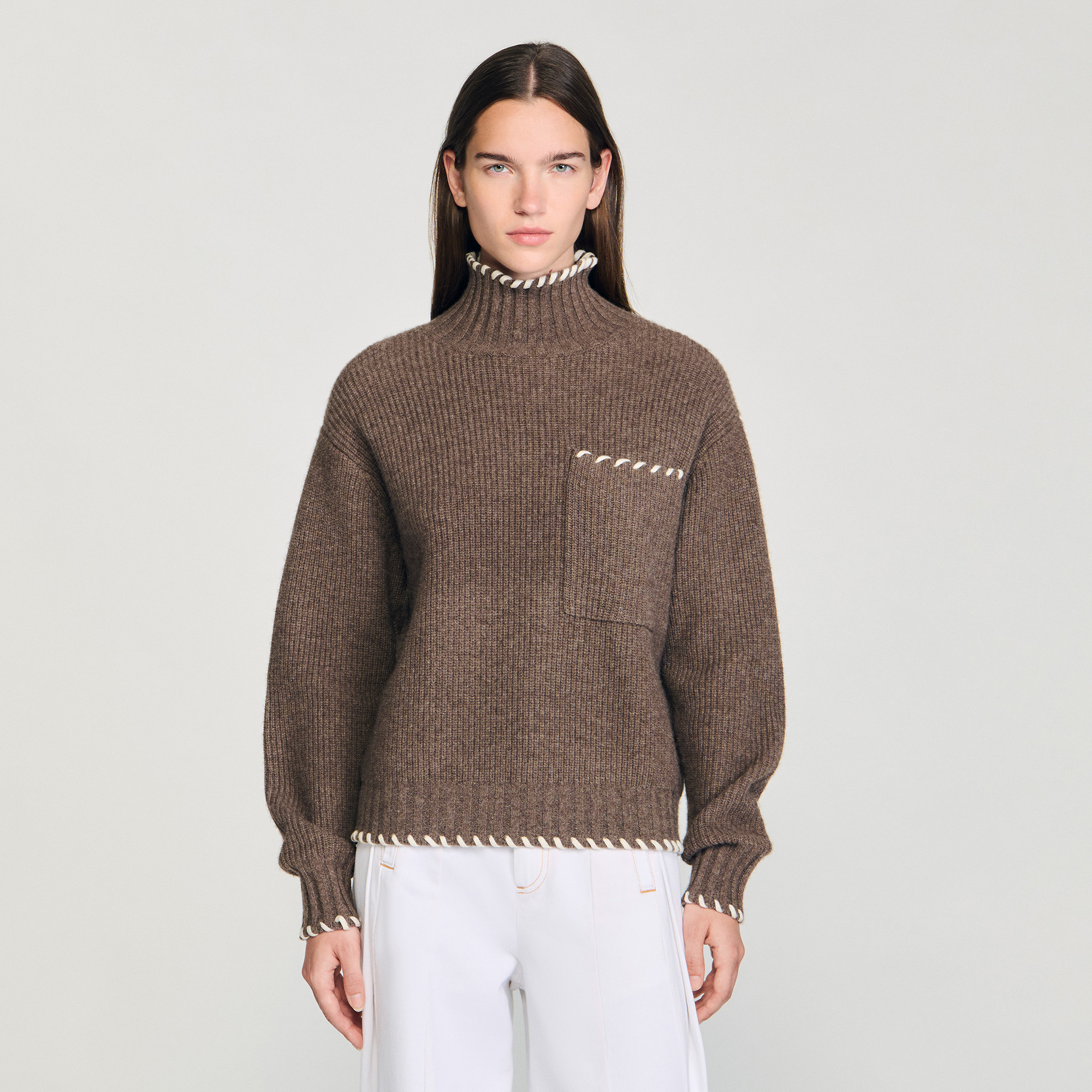 Sandro wool Oversized turtleneck sweater with long sleeves in fine rib knit, featuring contrasting trims and a patch pocket on the chest.