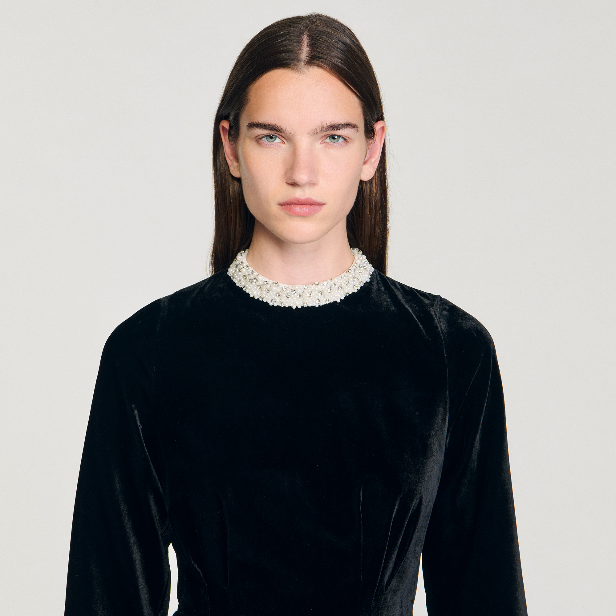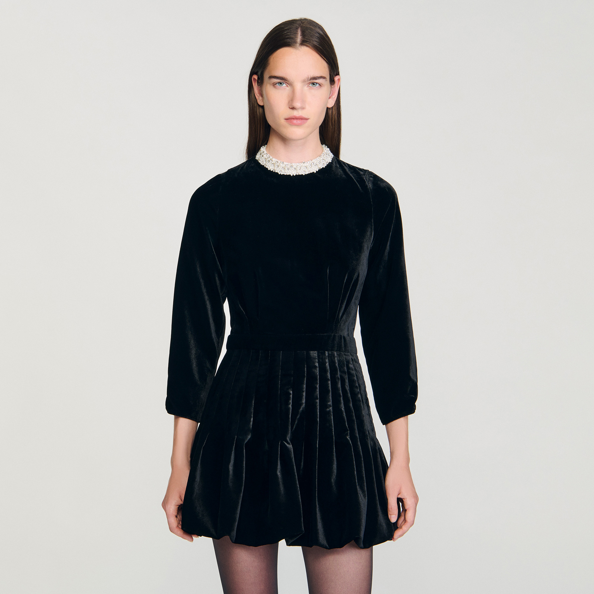 Sandro Women's mini velvet dress Embroidered contrasting high collar Inlaid waistband with pleats Pleated bubble skirt Invisible zip fastening at the back Lined Designed for a tailored fit.
