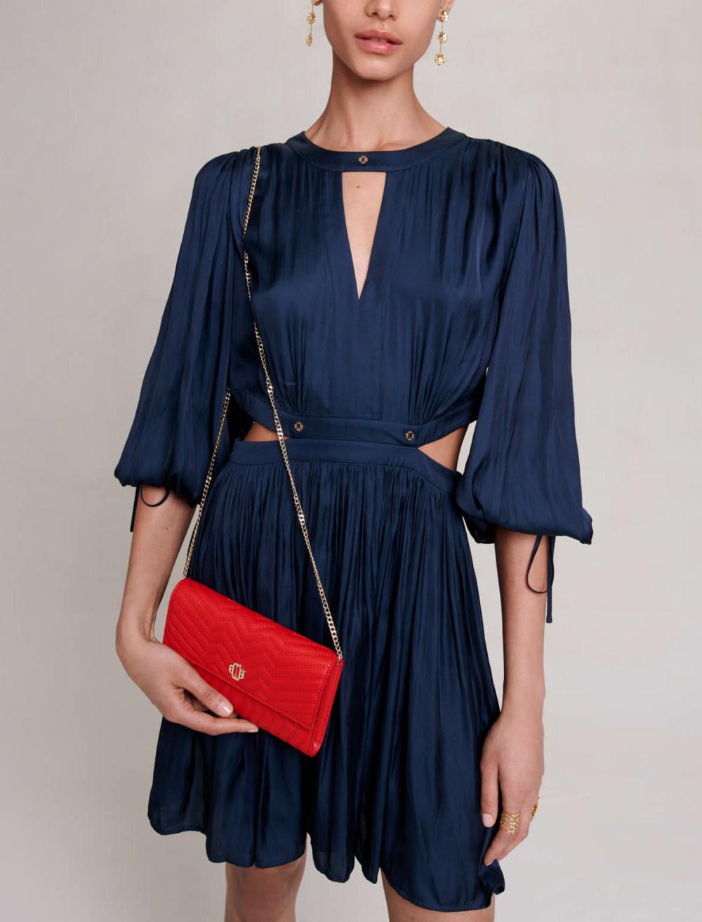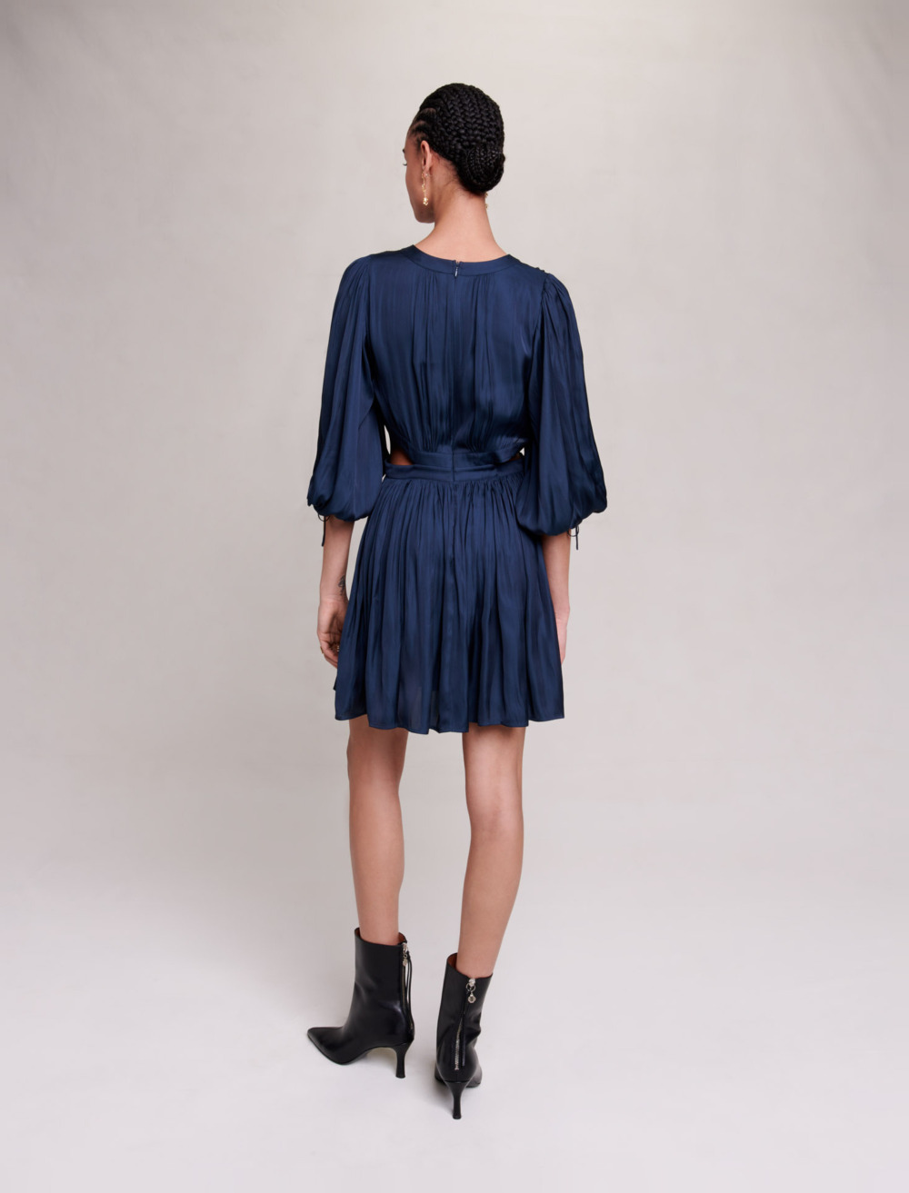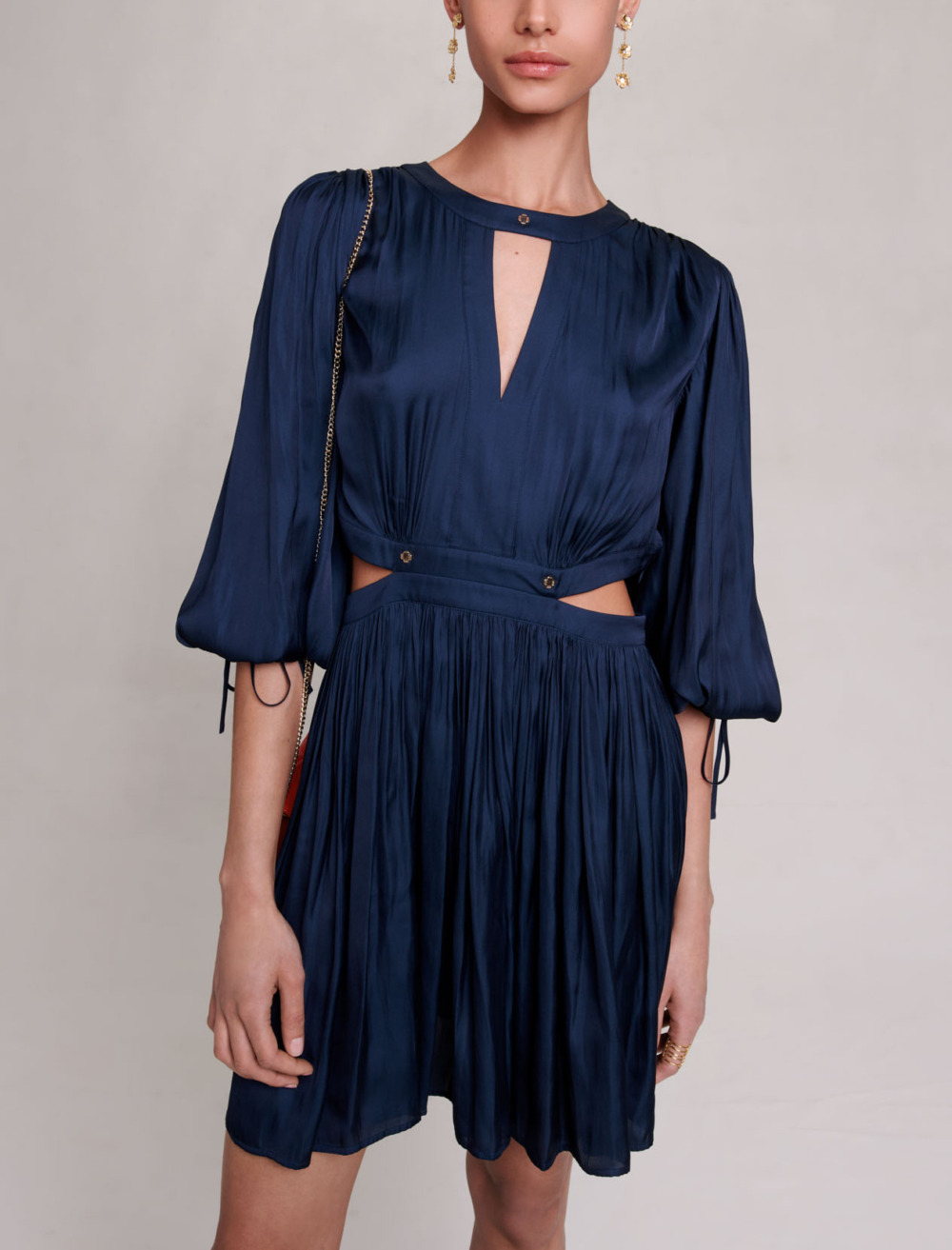 Short satin shift dress Cutaway sides Pleated skirt.