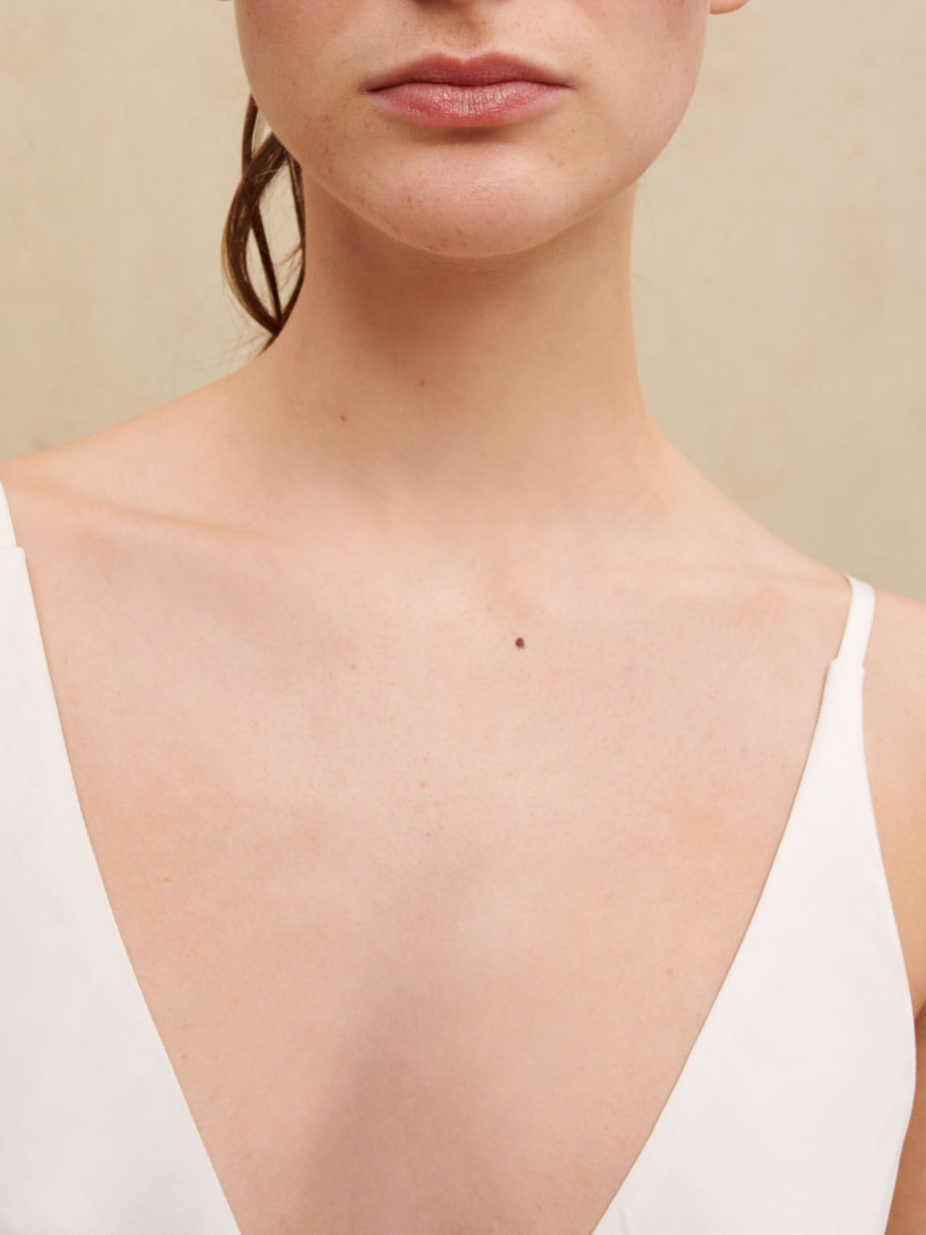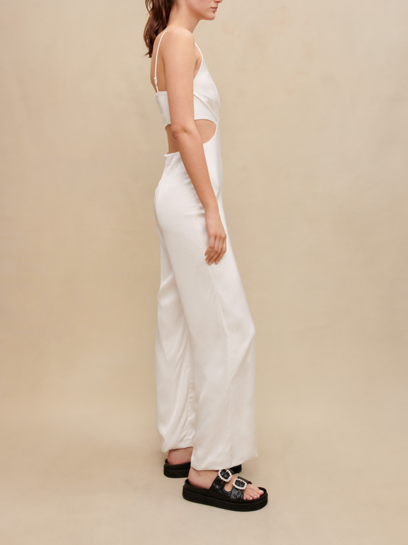 Featuring thin adjustable straps and a zip fastening on the trousers, it has a cutaway waist, for a subtle glimpse of skin.