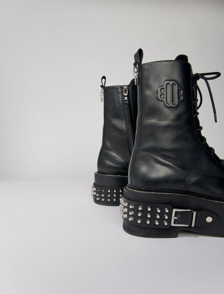 Maje Woman's leather Combat boots with punk details for Fall/Winter, in color Black / Black