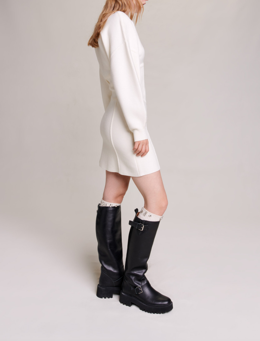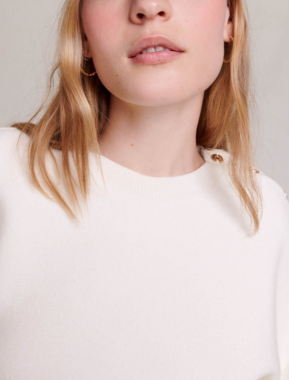 Short knit jumper dress Corset effect at the waist Round neck with gold buttons.