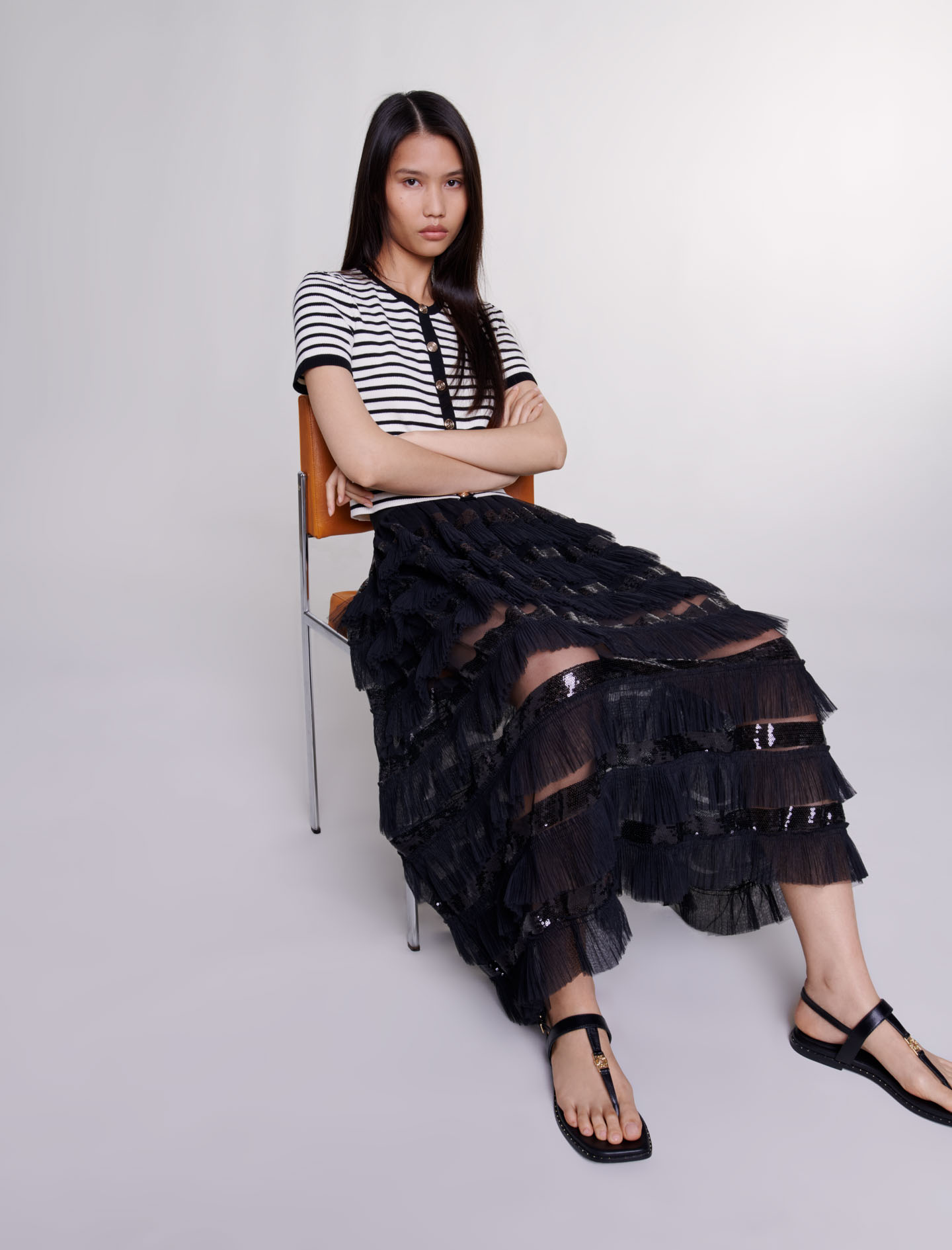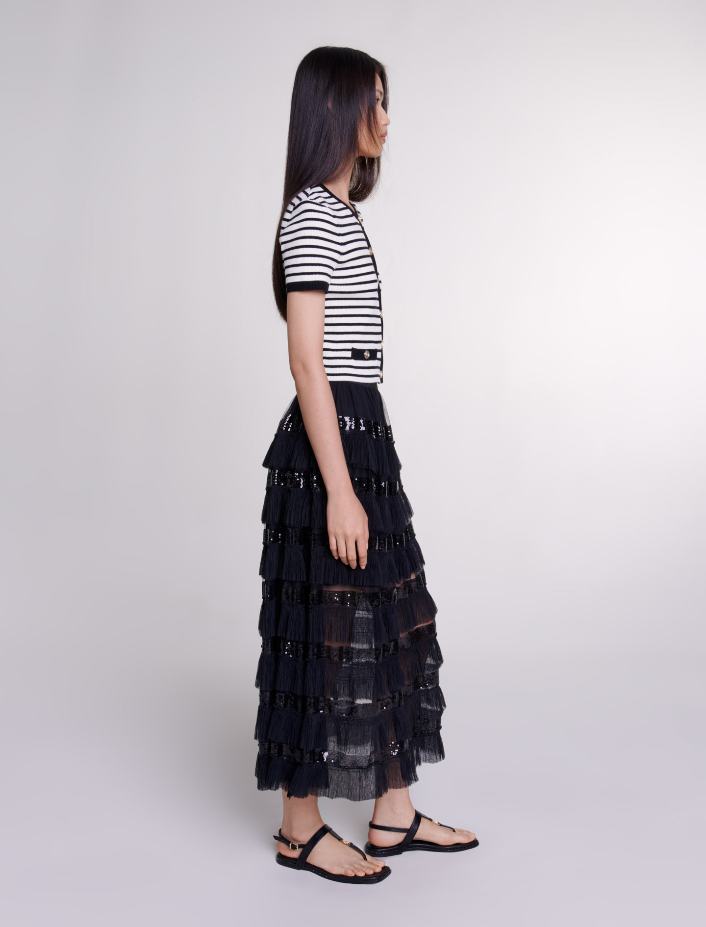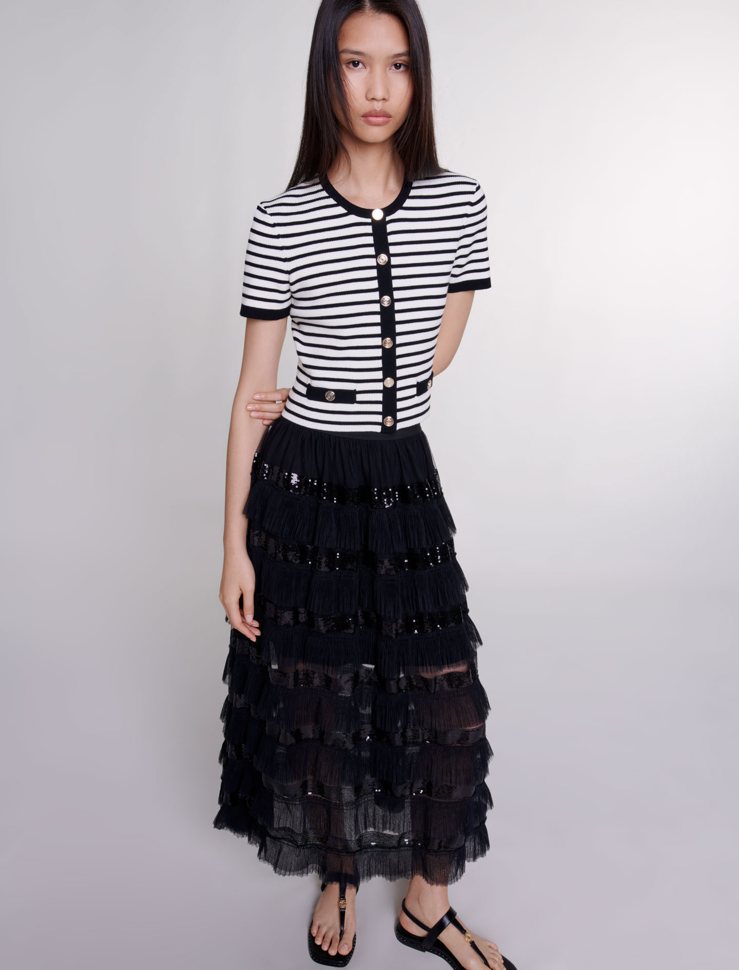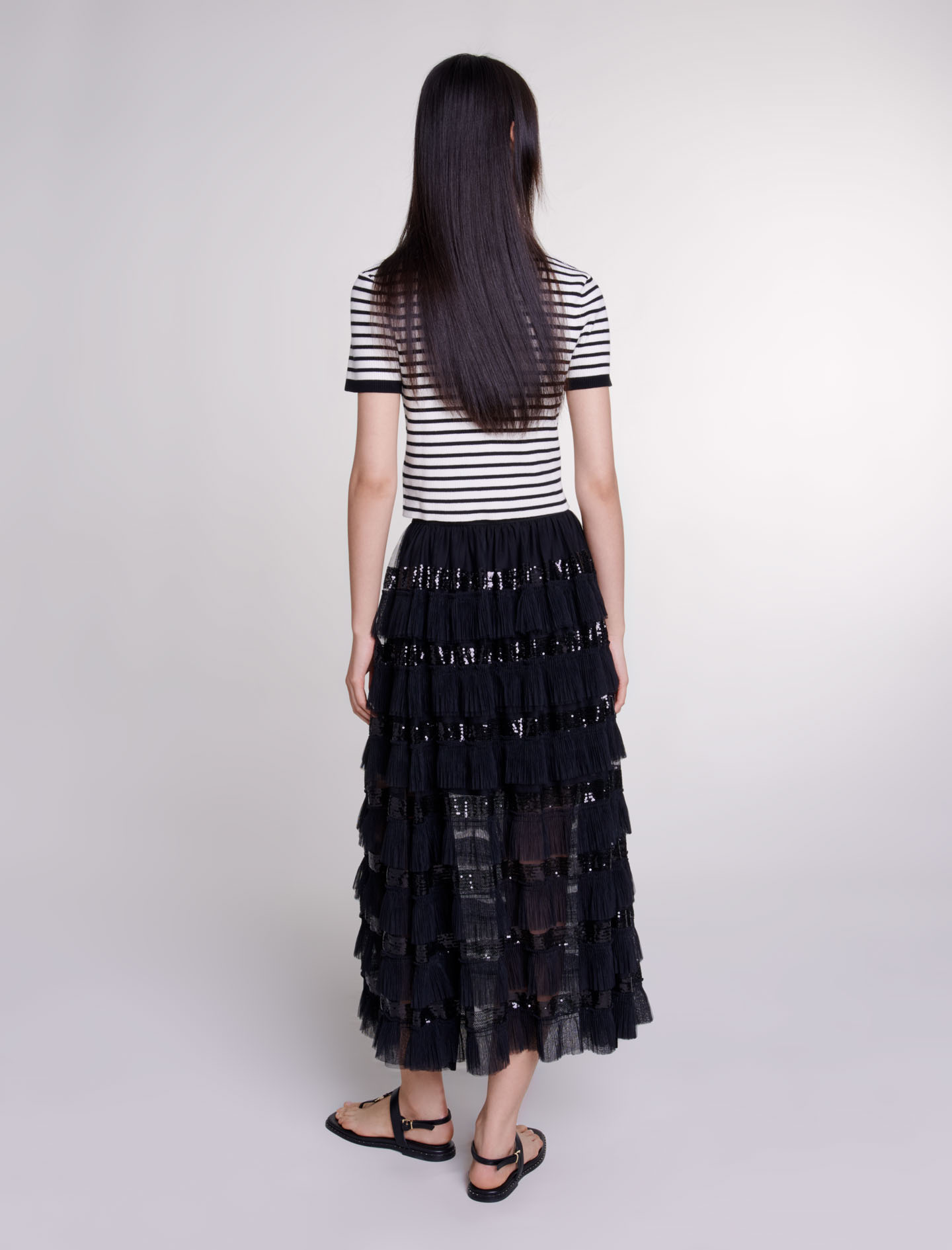 Maxi skirt Pleated tulle ruffles Sequinned bands.