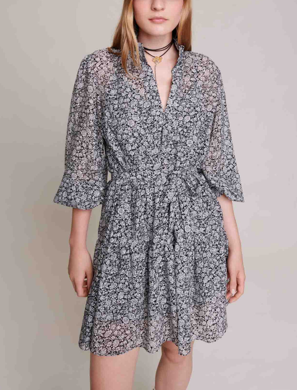 Accentuated at the waist with a tone-on-tone tie belt, it has a floaty, flared babydoll-effect skirt.