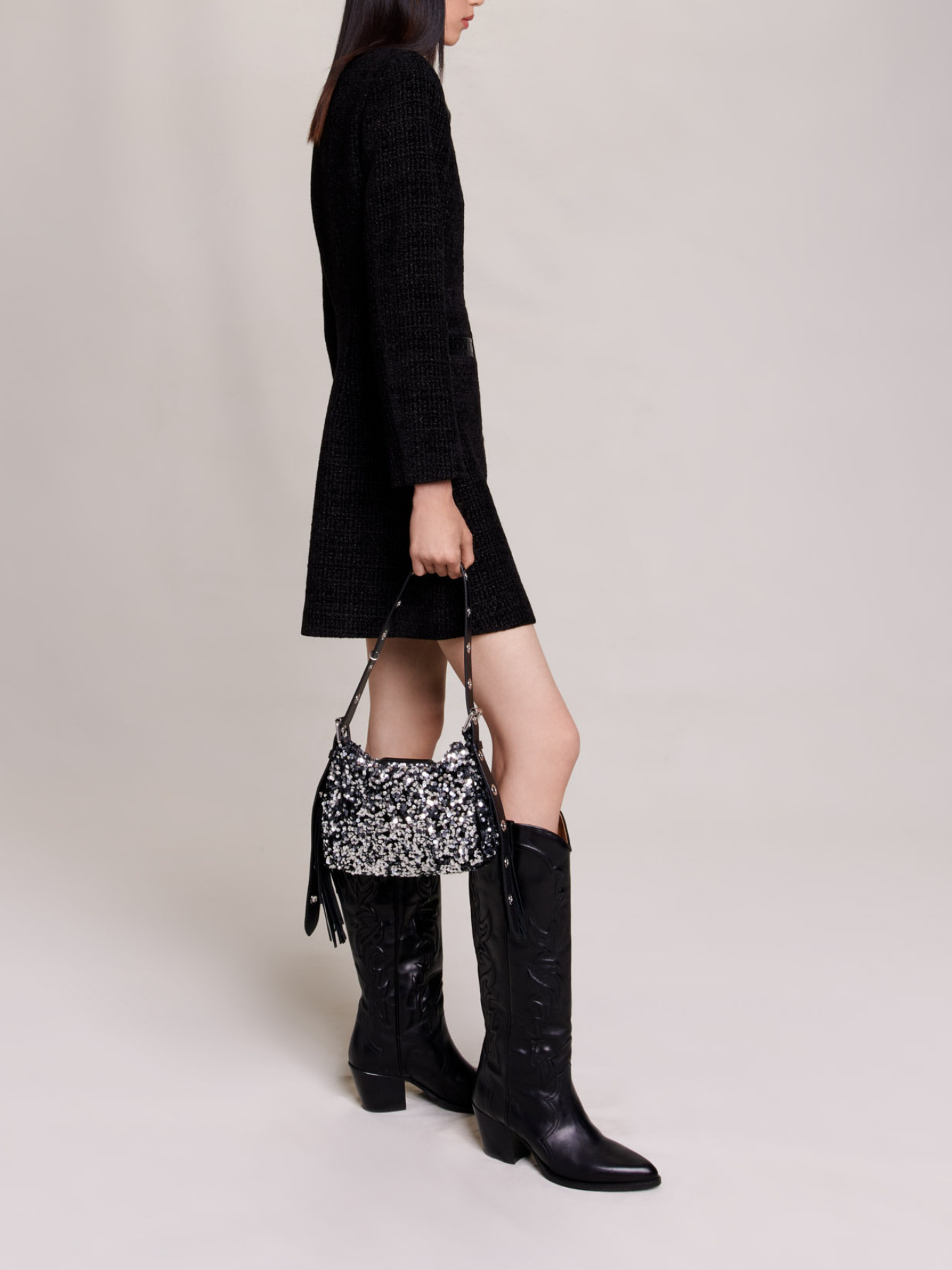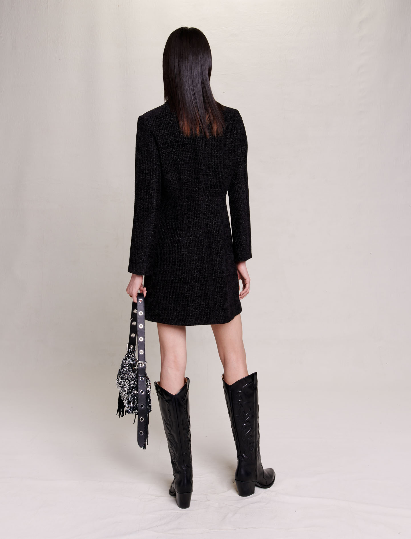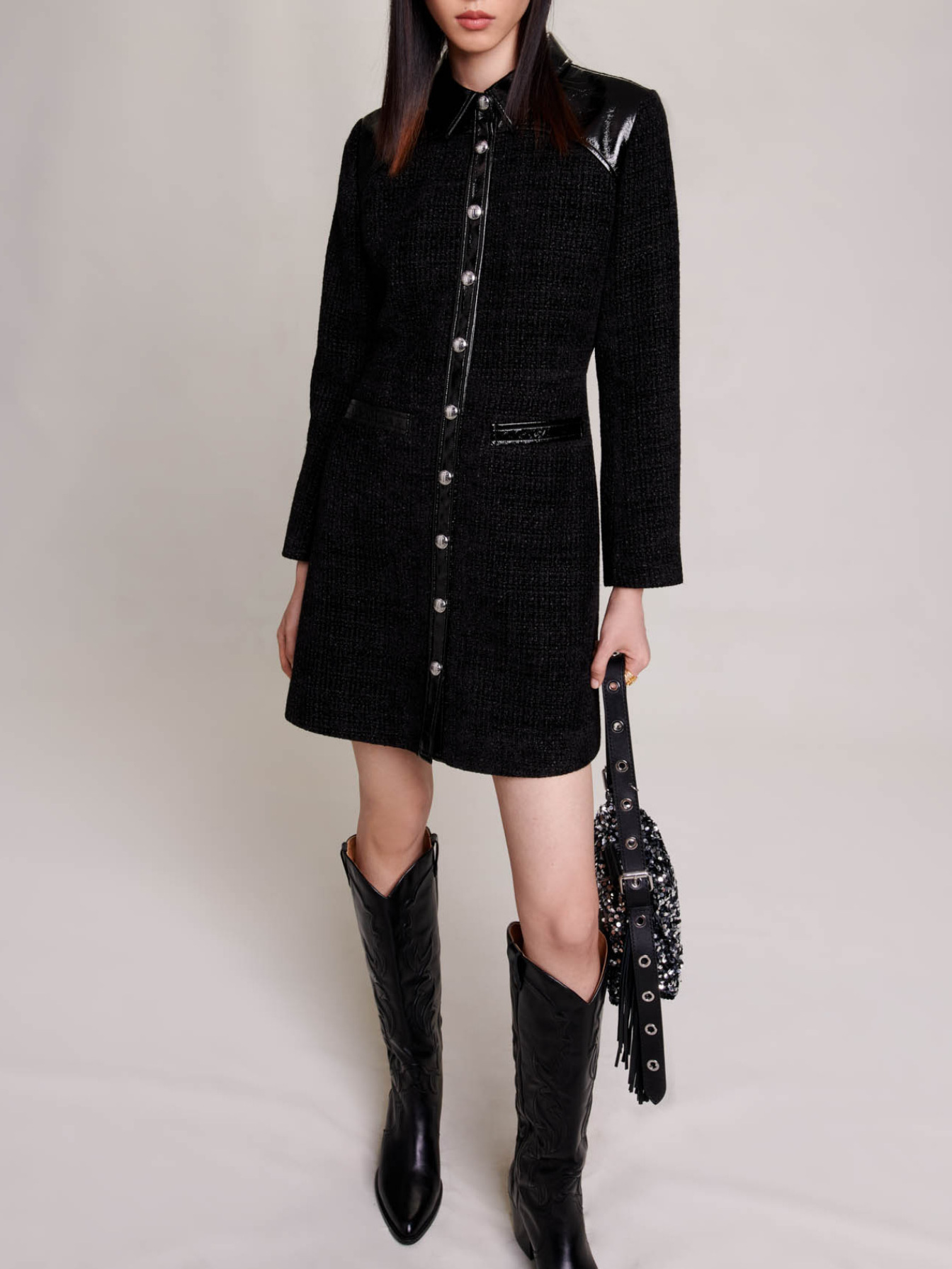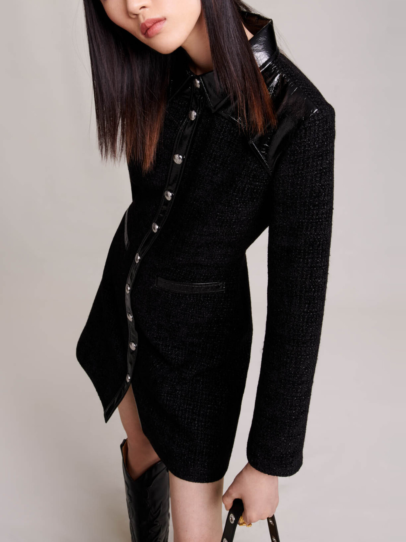 Short dress in velvet tweed Vinyl panels 2 welt pockets.