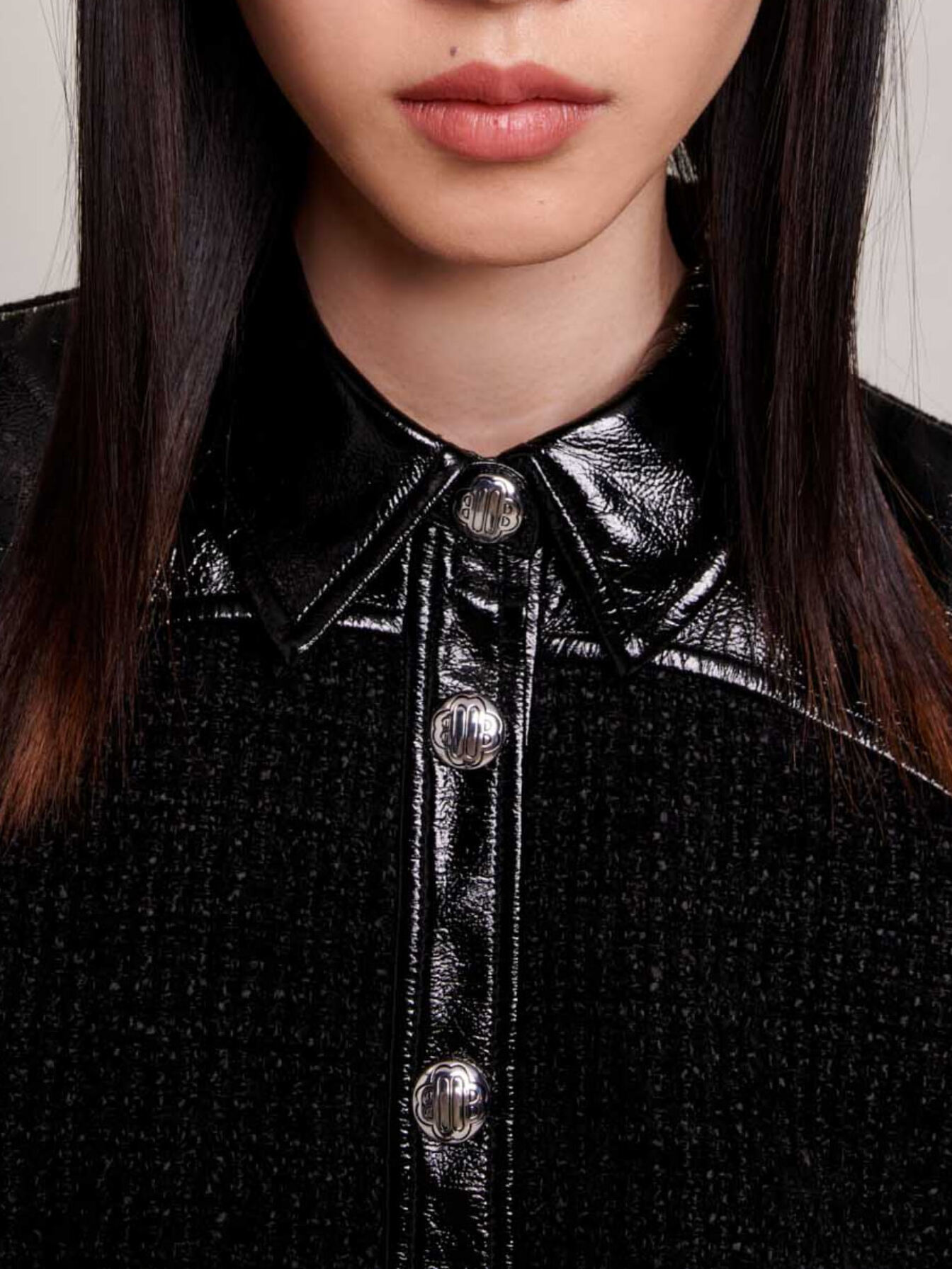 And what makes it so chic? The vinyl panels on the shoulders and button placket endow your look with a touch of daring.