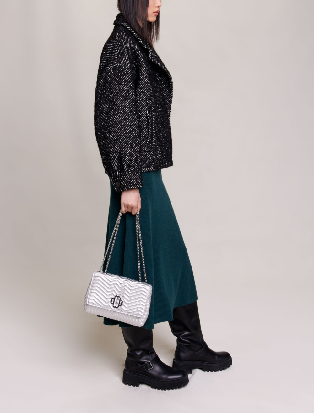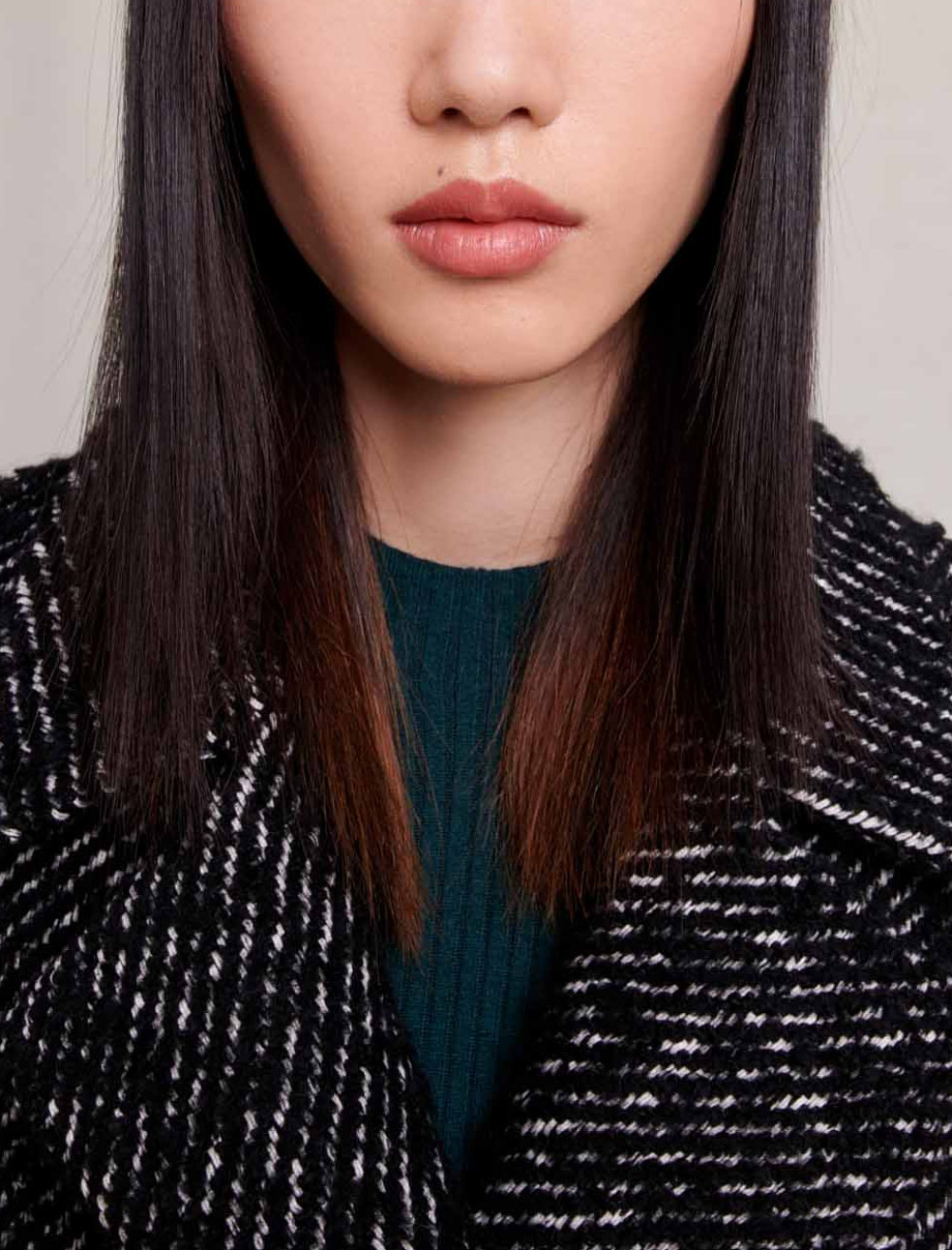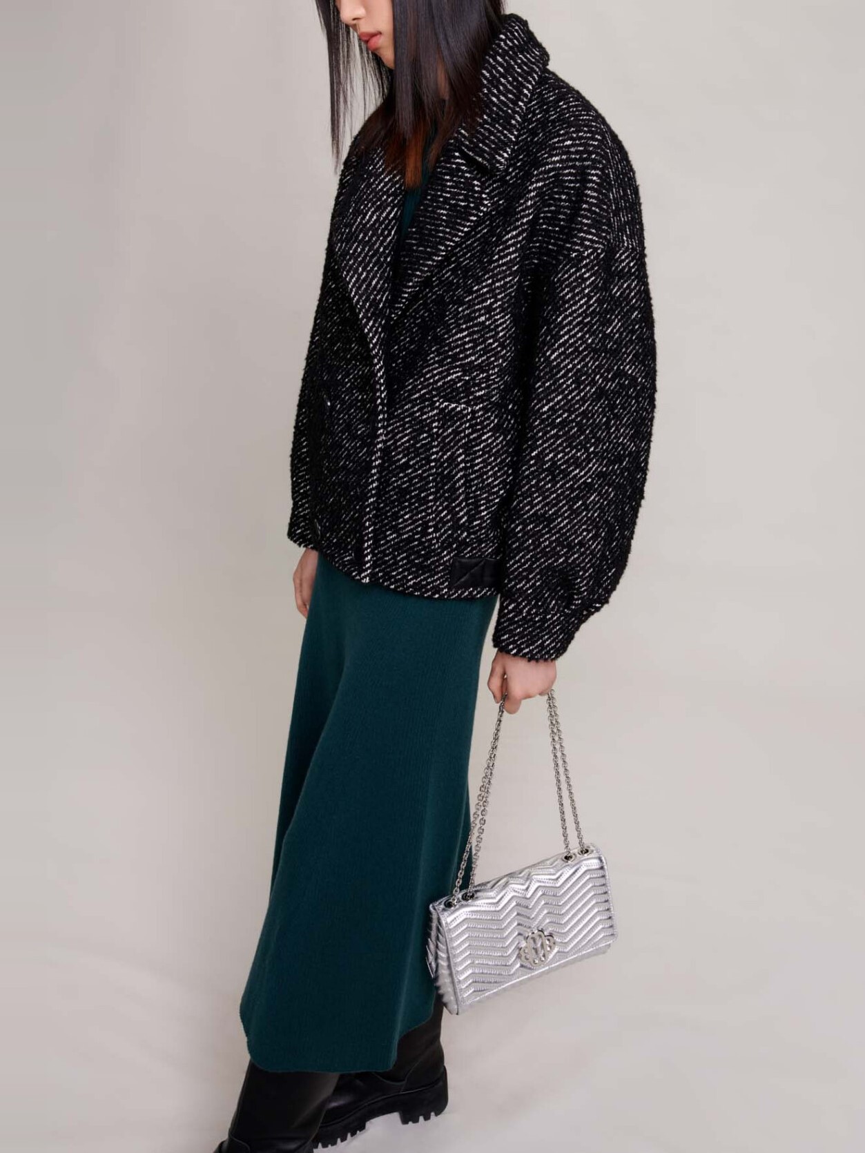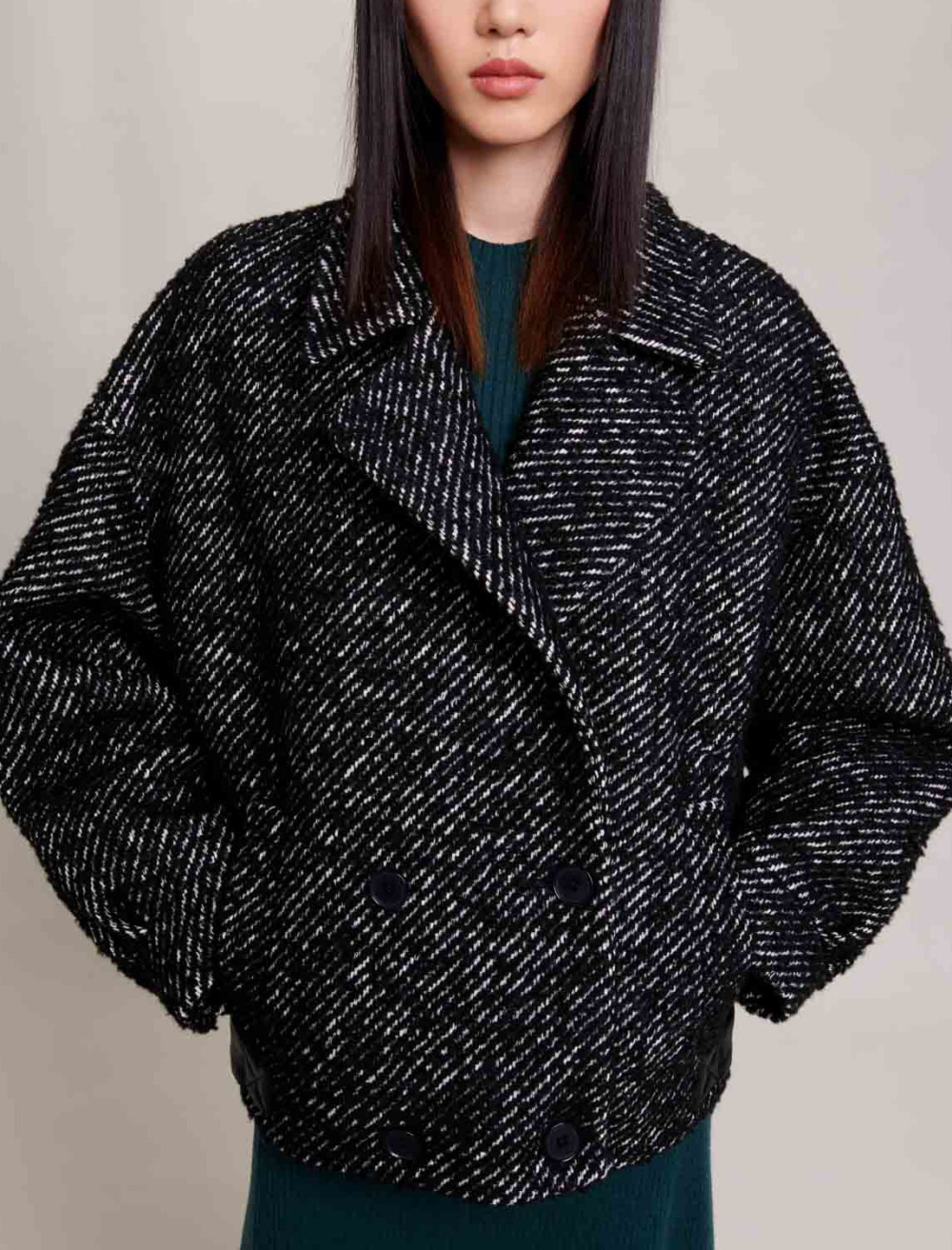 Fully lined, this cropped coat is inspired by pea coats and features a herringbone print.