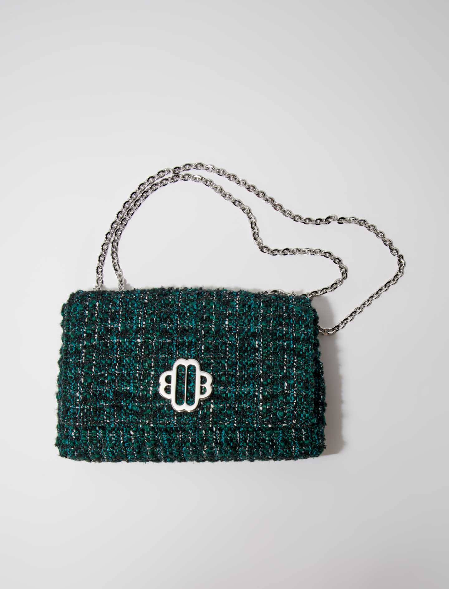 Adorned with a signature clover clasp, this mottled tweed quilted bag has a flap on the front and a gold-tone metal chain shoulder strap.