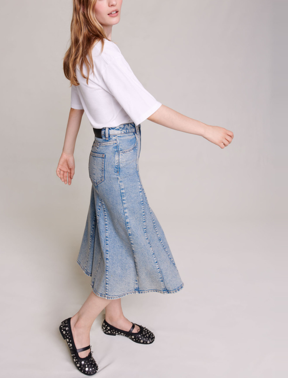 Faded denim midi skirt Mid-rise waist 2 front pockets 2 patch pockets on back.