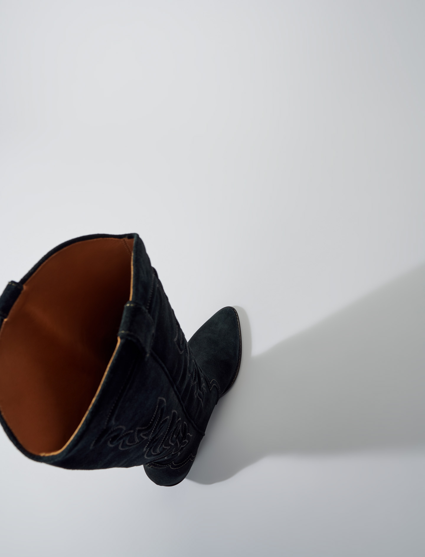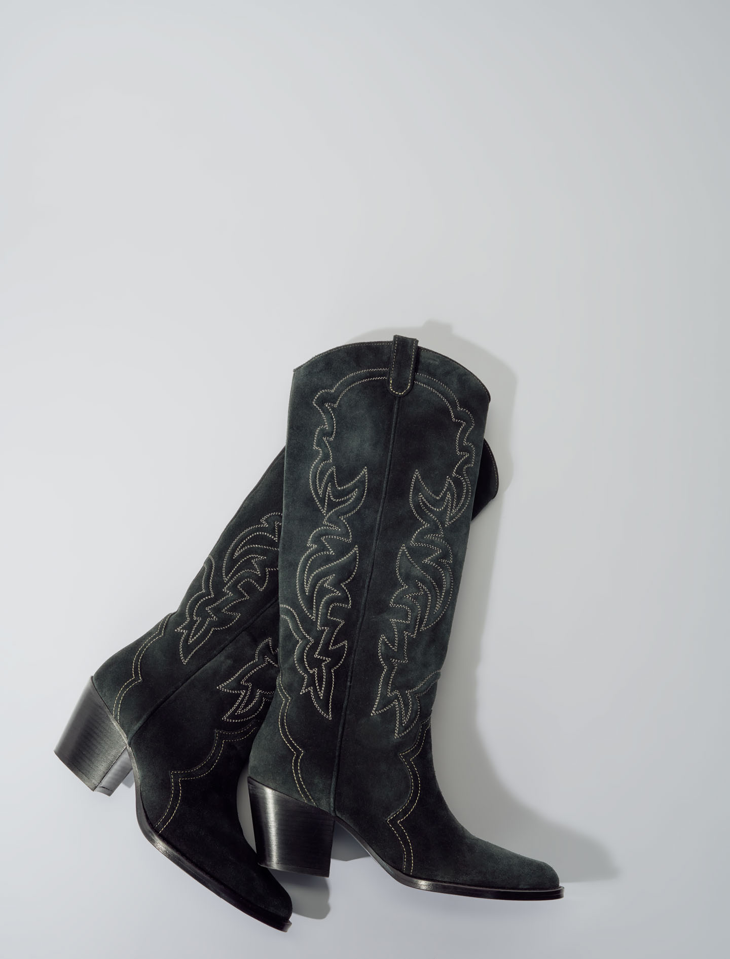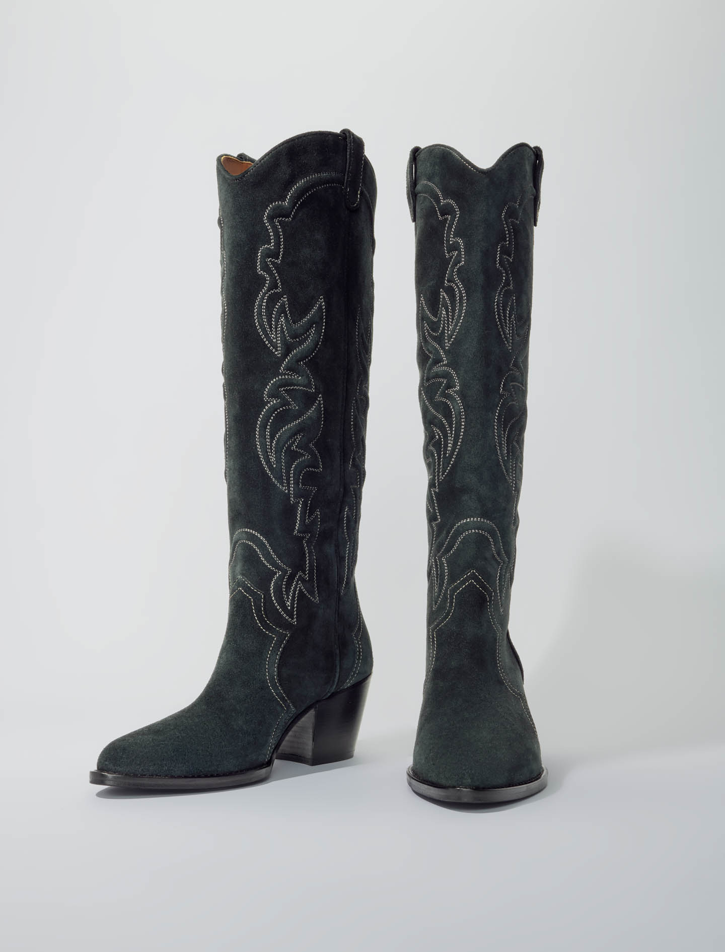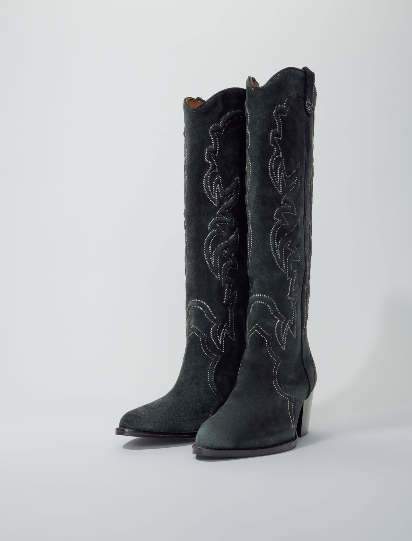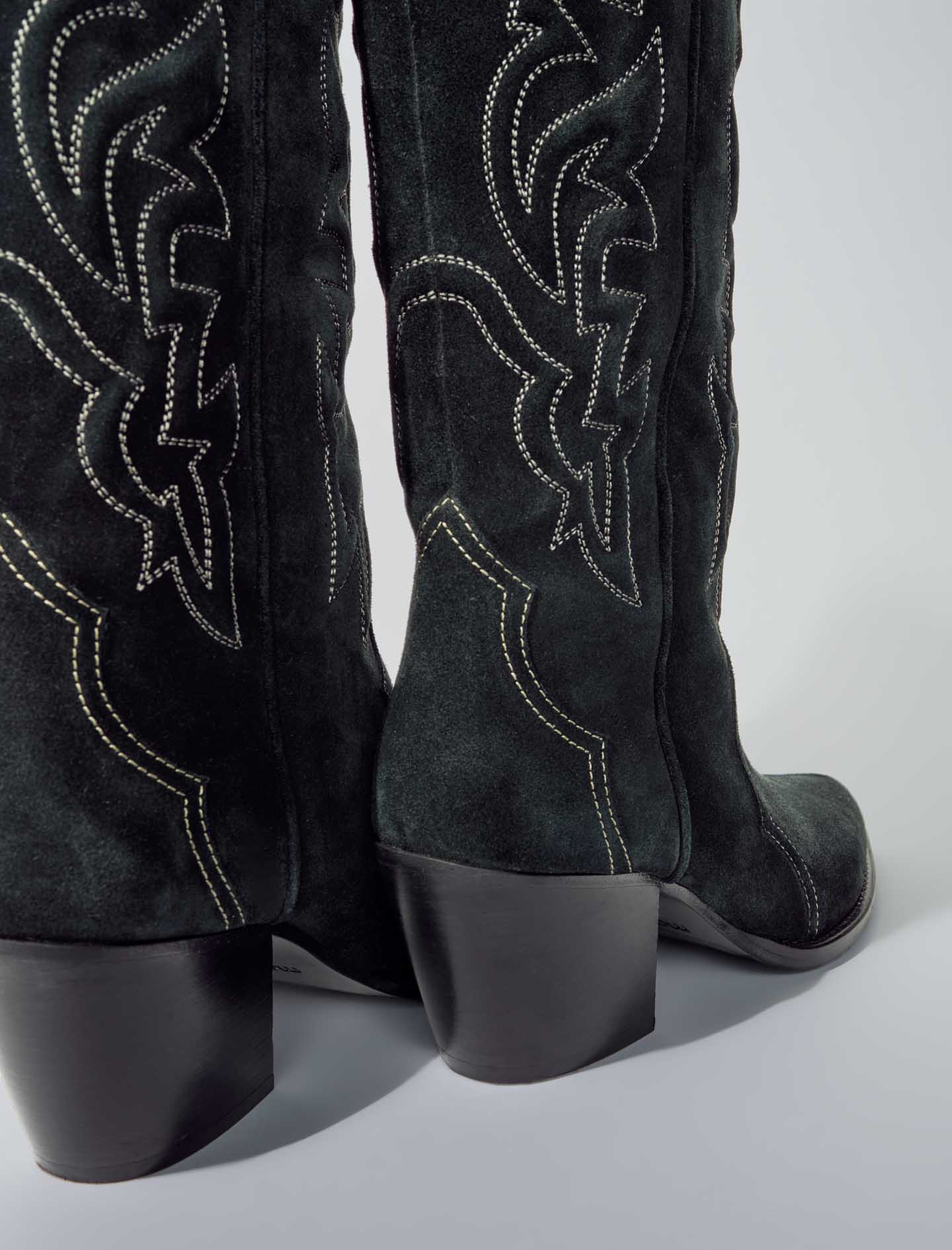 High-leg suede cowboy boots Topstitched detailing Heel height: