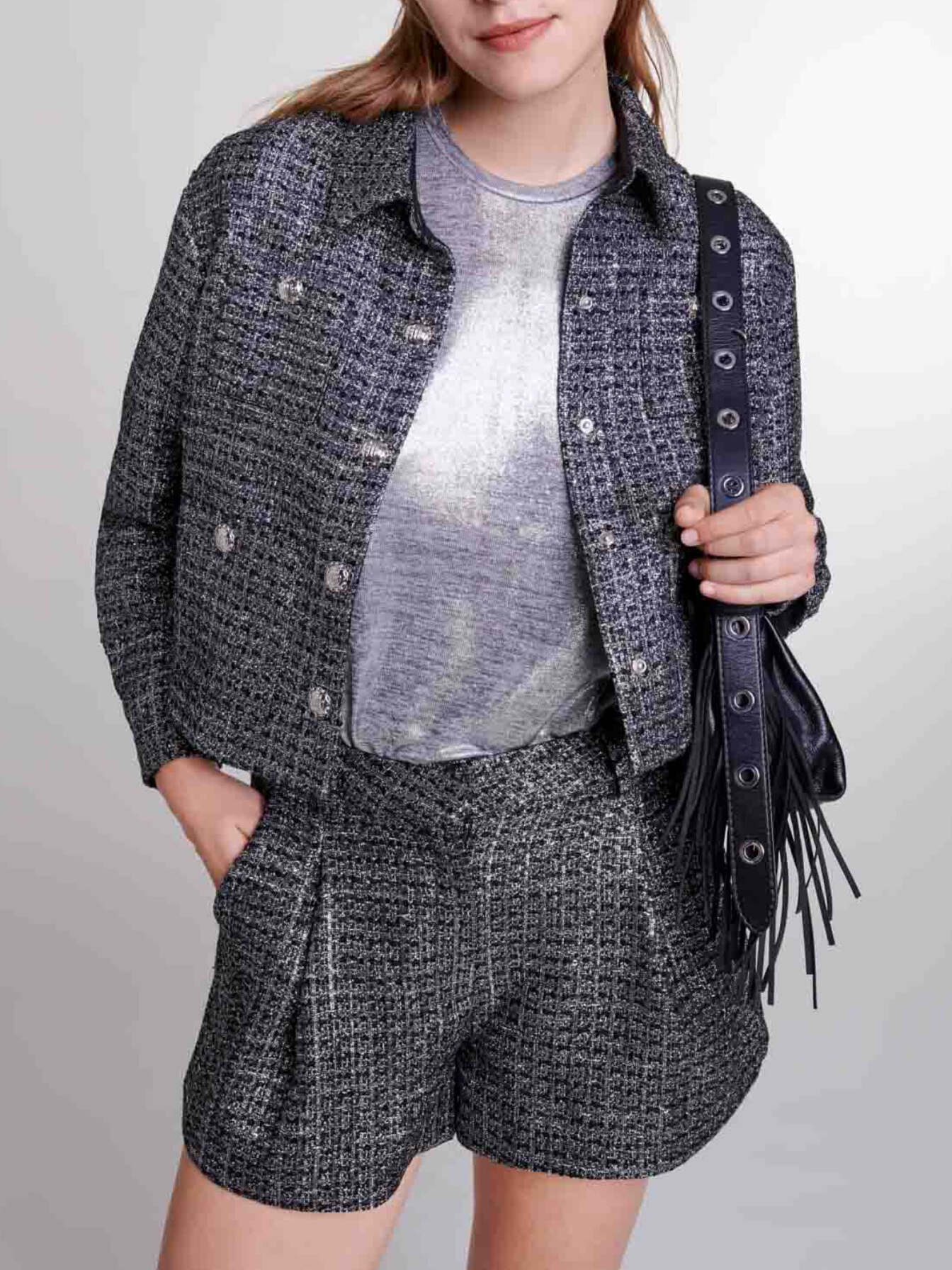 This cropped jacket with metallic tweed detailing and sequins catches the light for a dazzling look.