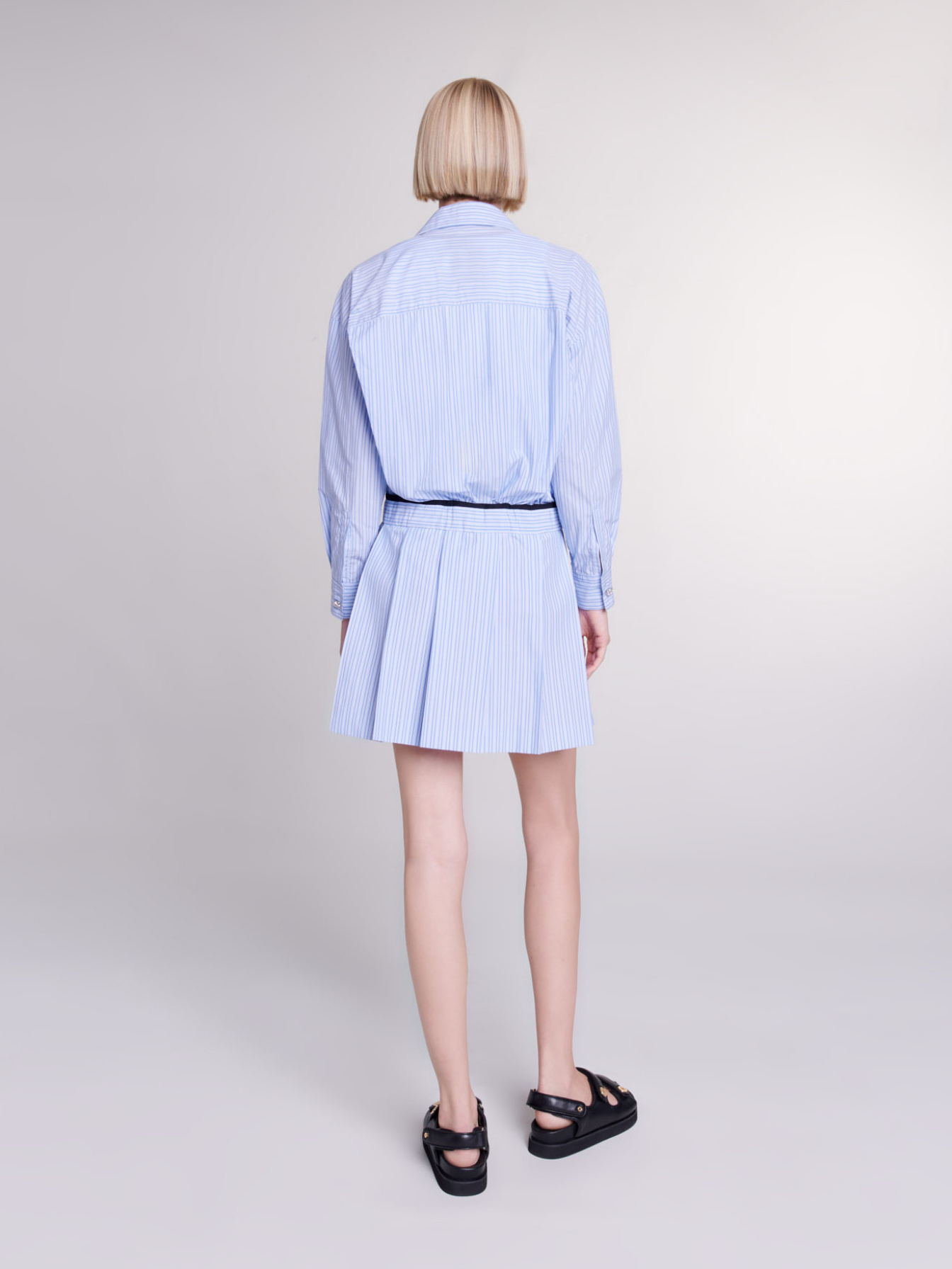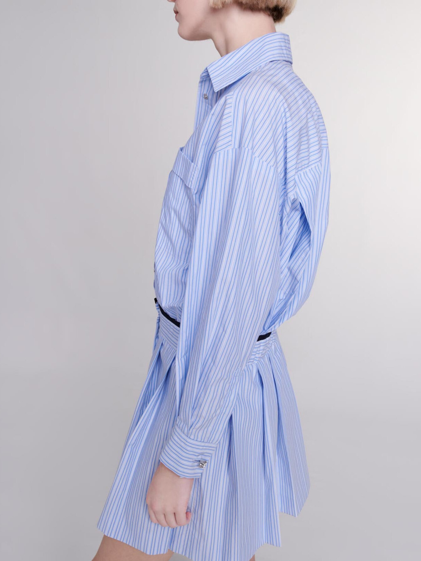 Embellished with stripes, this short shirt dress plays on lines to create a 2-in-