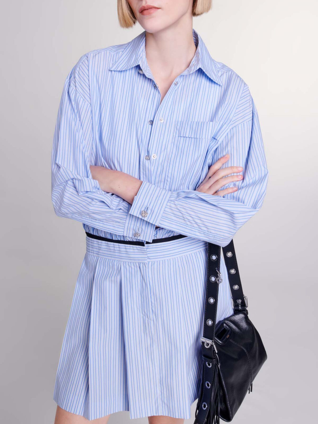 The top is a long-sleeved shirt with a chest pocket and a collar embellished with jewellery buttons.
