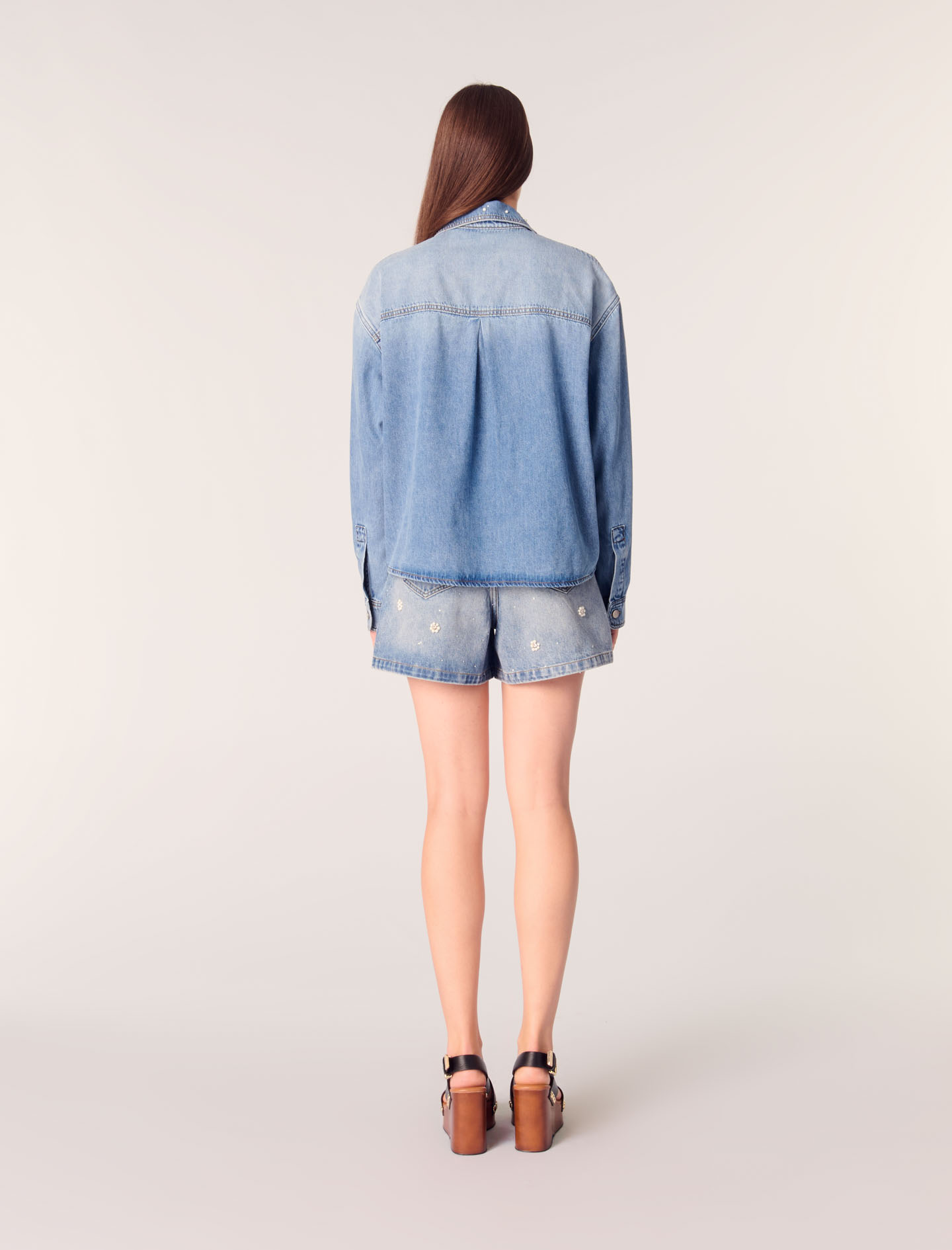 Denim shirt Embroidered bead and rhinestone flowers Chest patch pocket Button fastening Button cuffs Designed for a slightly boxy fit.