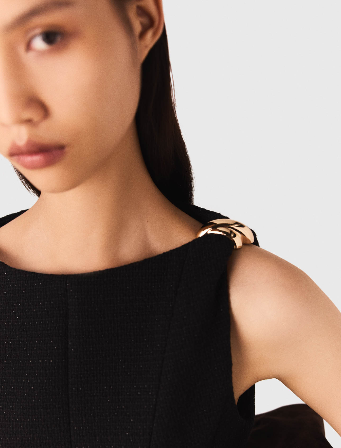 This mini dress is set off by decorative tweed and a piece of gold jewellery on the shoulder.