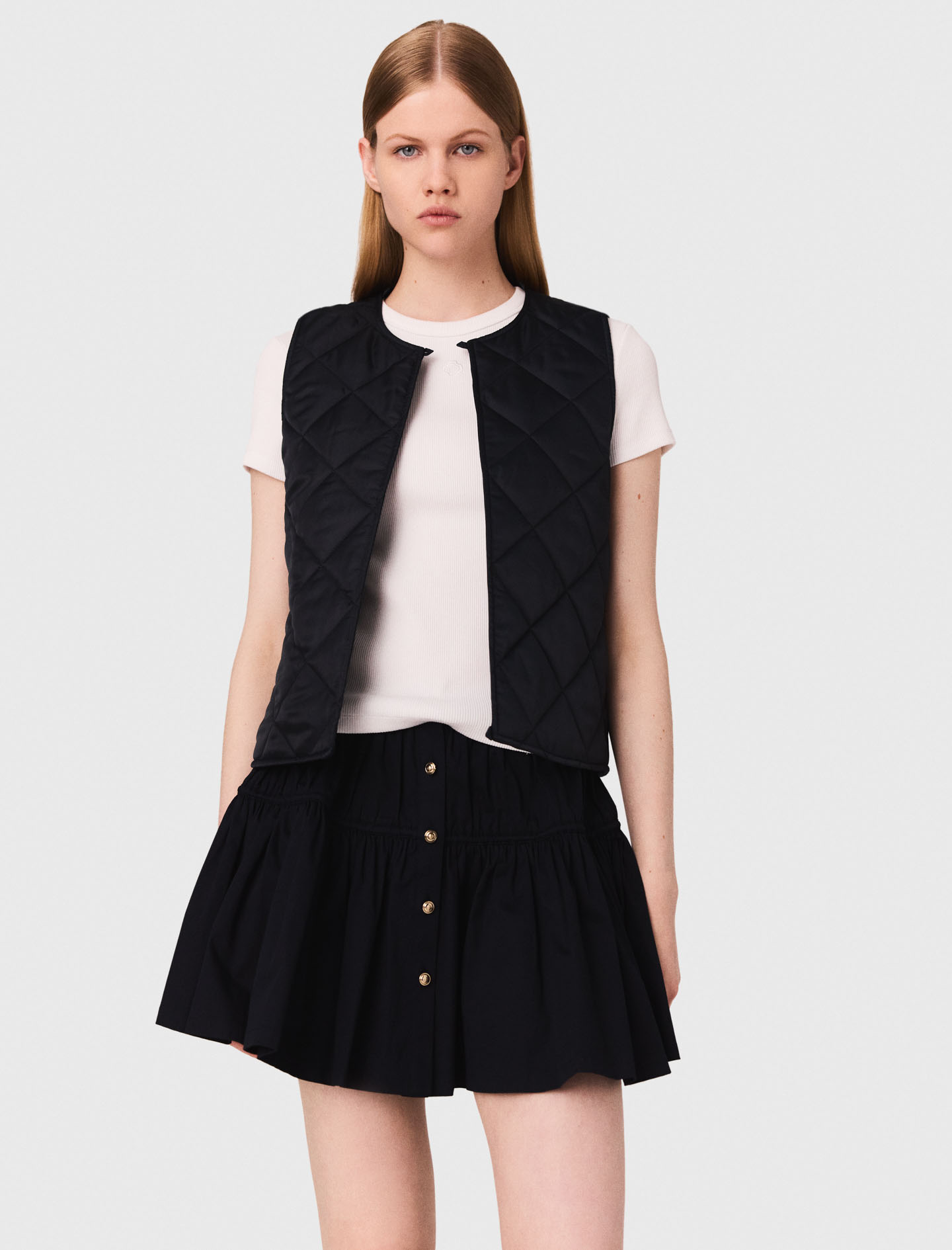 Maje cotton Flared short jacket adorned with studs Corduroy collar with buttoned tab Removable quilted vest lining 2 pockets Designed for a boxy fit This metropolitan collection stands out with modern and assertive pieces, serving as an elegant transition between the softness of summer and the hustle and bustle of the city.