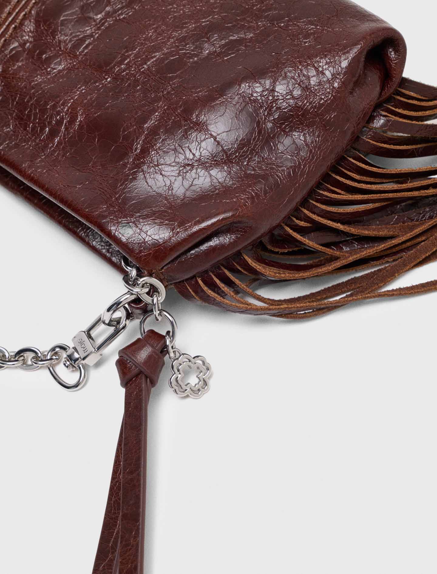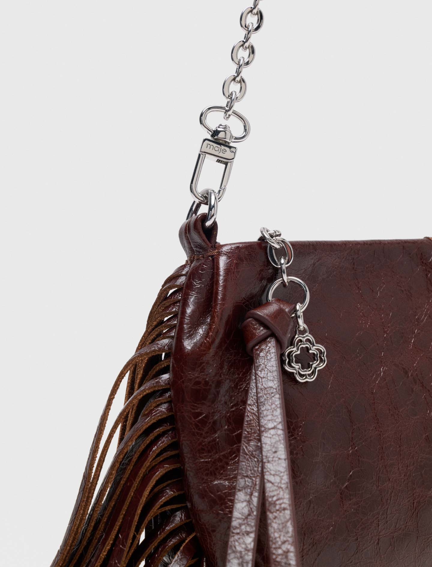 Maje leather Miss M clutch in slightly varnished worn leather Removable chain for hand or shoulder carry Signature side fringes and Clover tassel zip fastening Dimensions:
