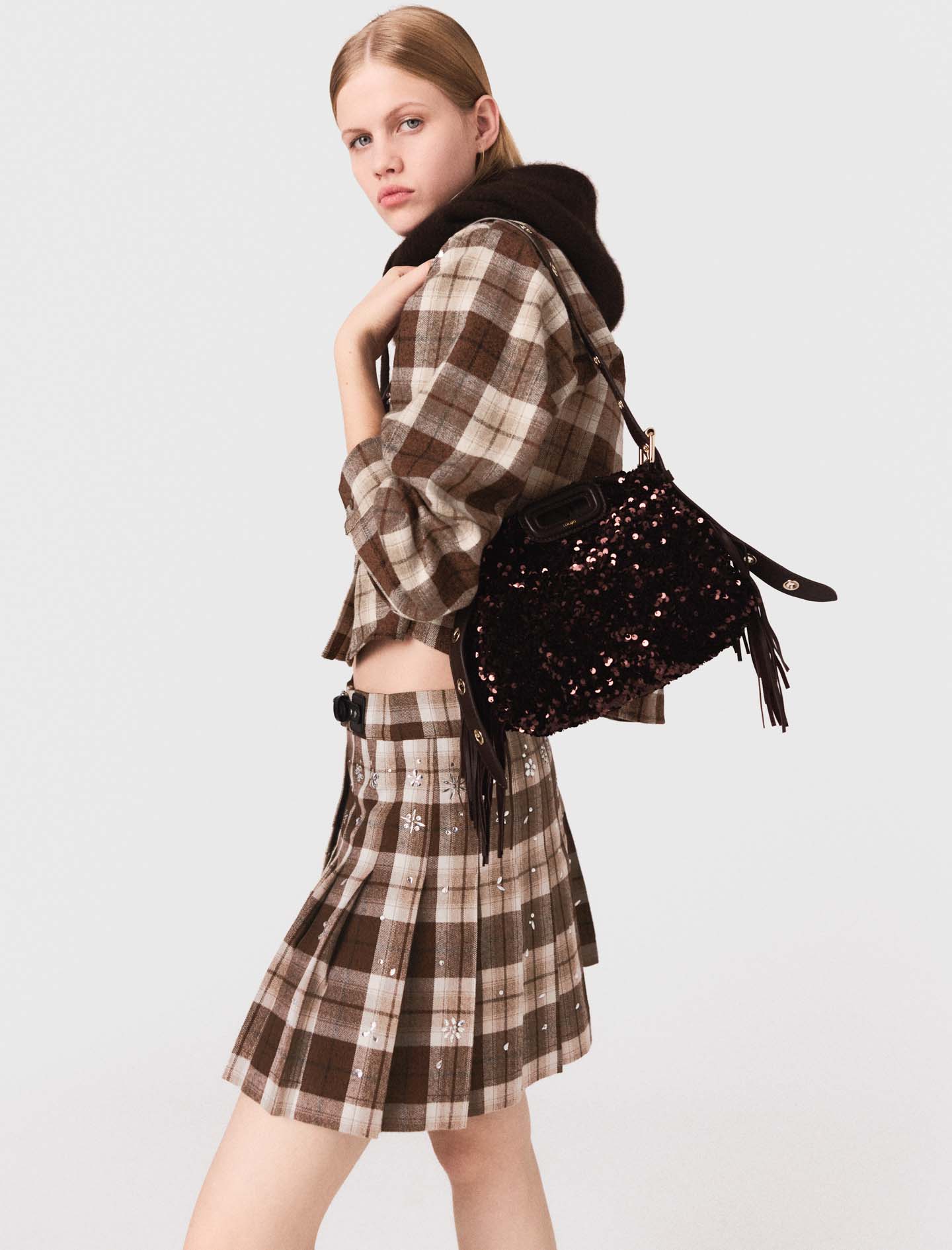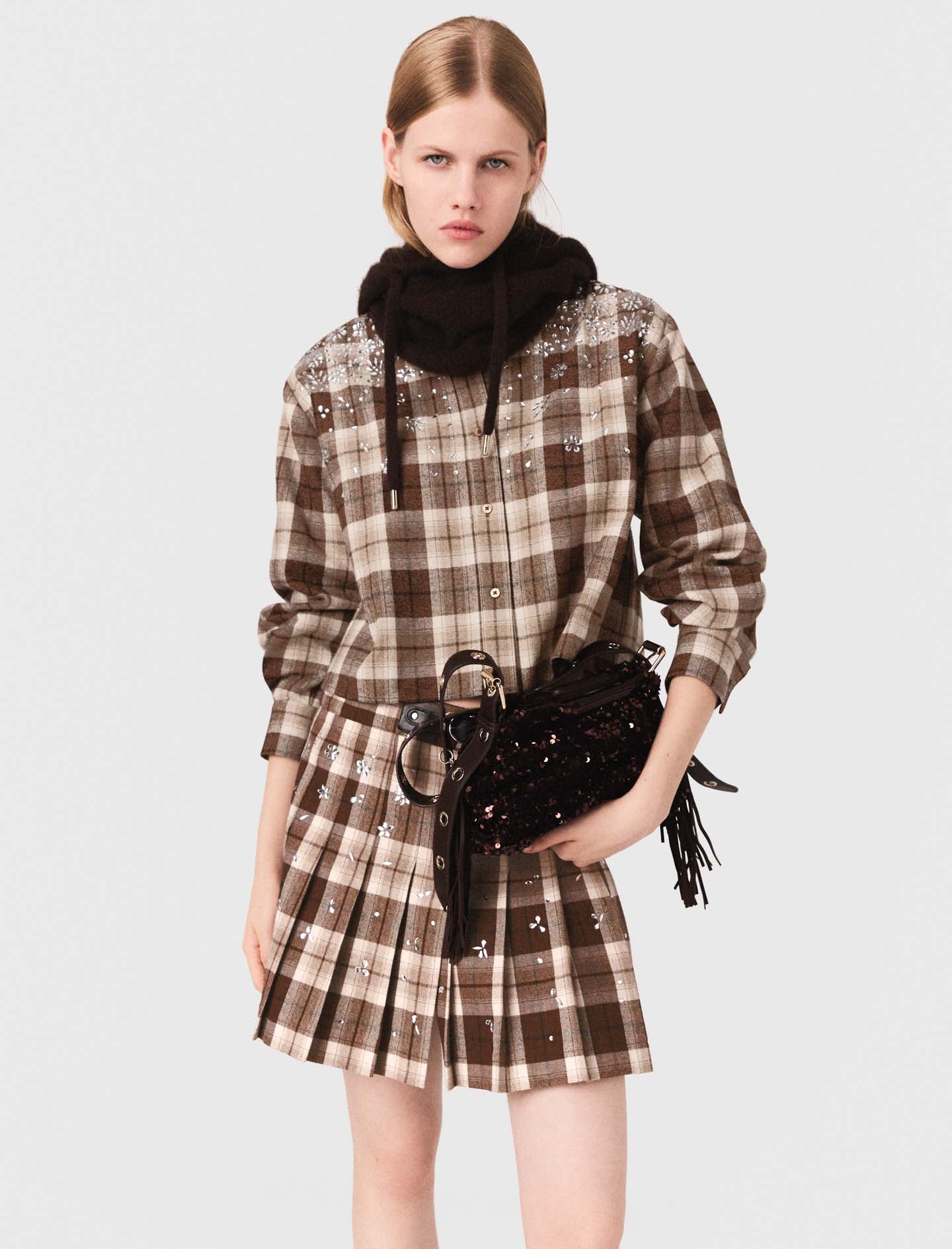 Here, the checked flannel has a supple drape and is distinguished by delicate rhinestone embroidery on the top.