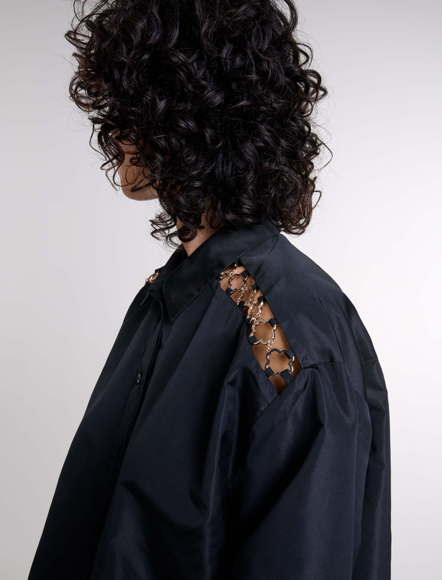 Technical shirt Shirt collar Openwork shoulders with inset Clover gold links and chain Long sleeves and buttoned cuffs Button fastening Box pleat on back.