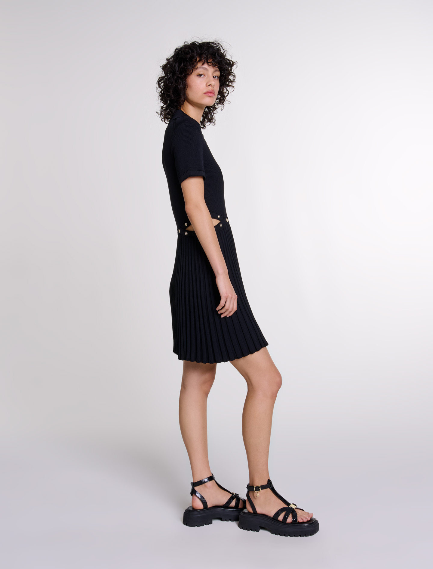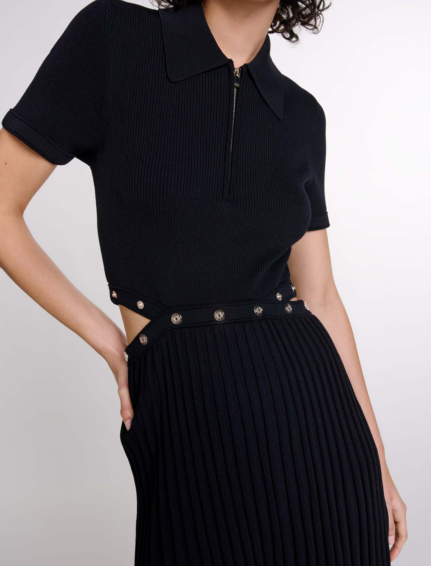 Short rib knit stretch dress Zip-up polo neck Short sleeves Cutaway waist with press studs Pleated skirt.