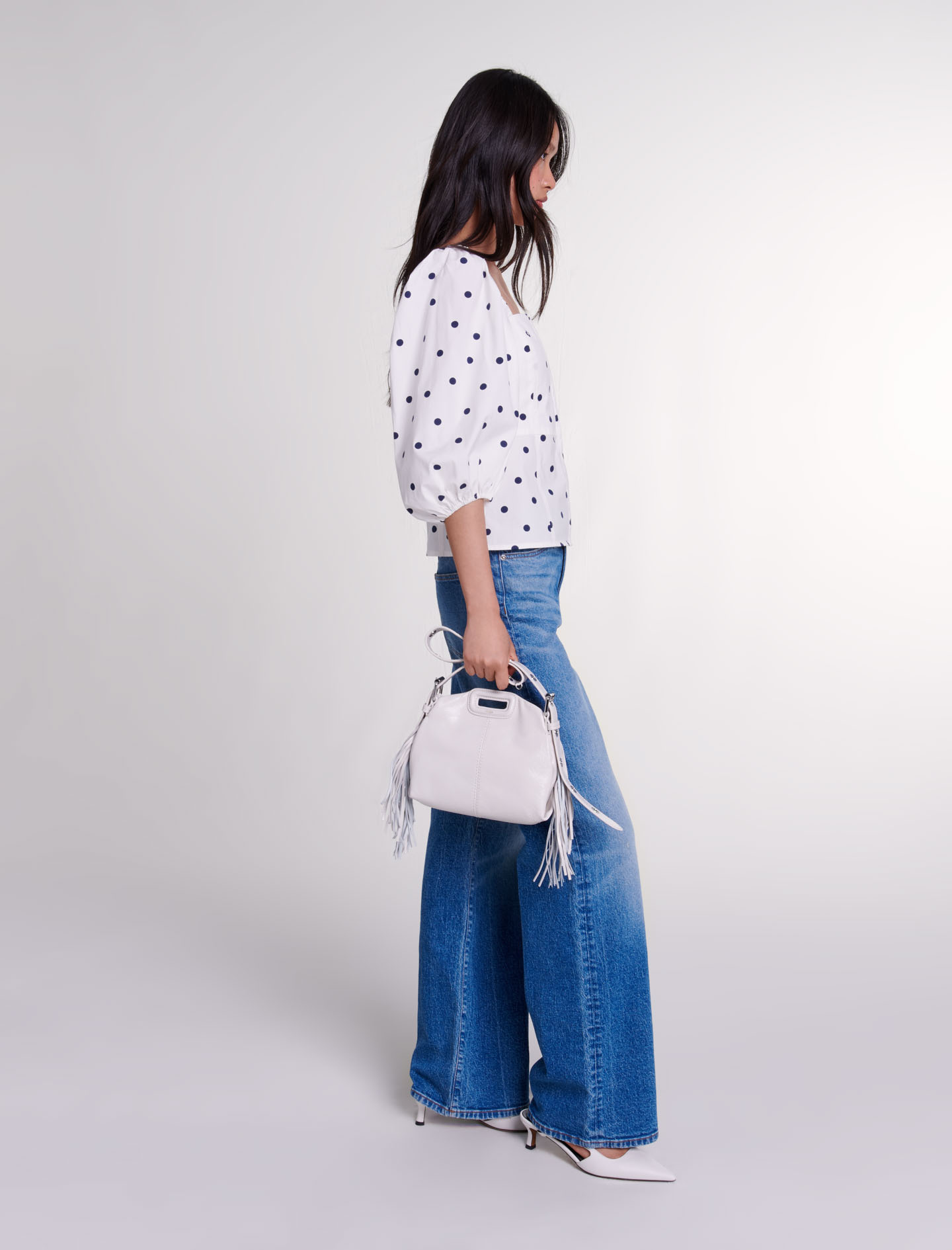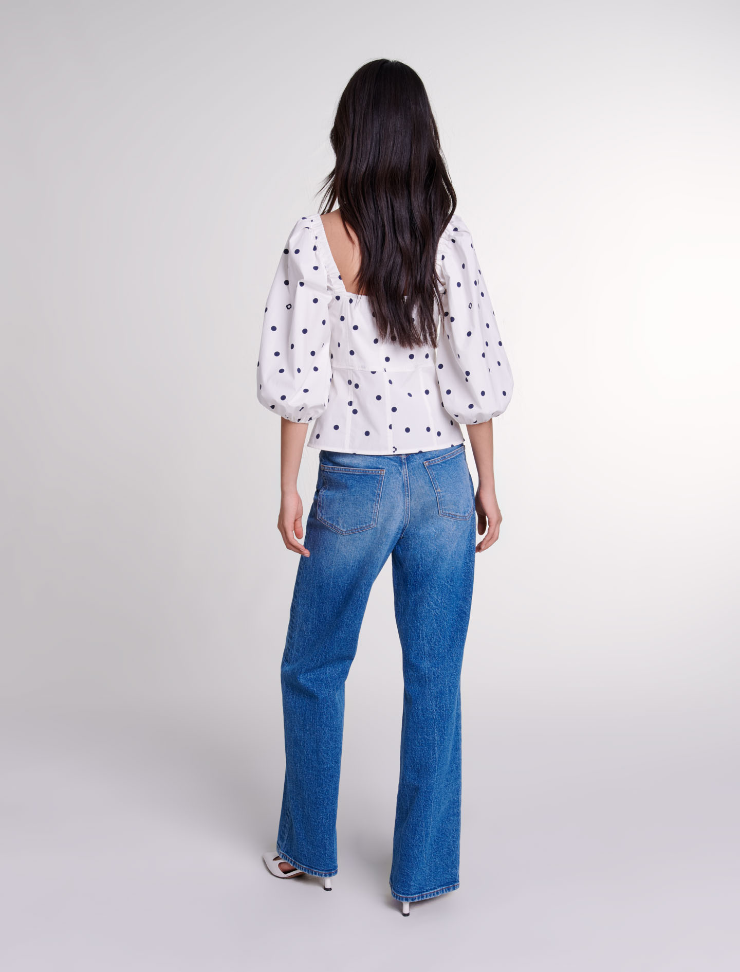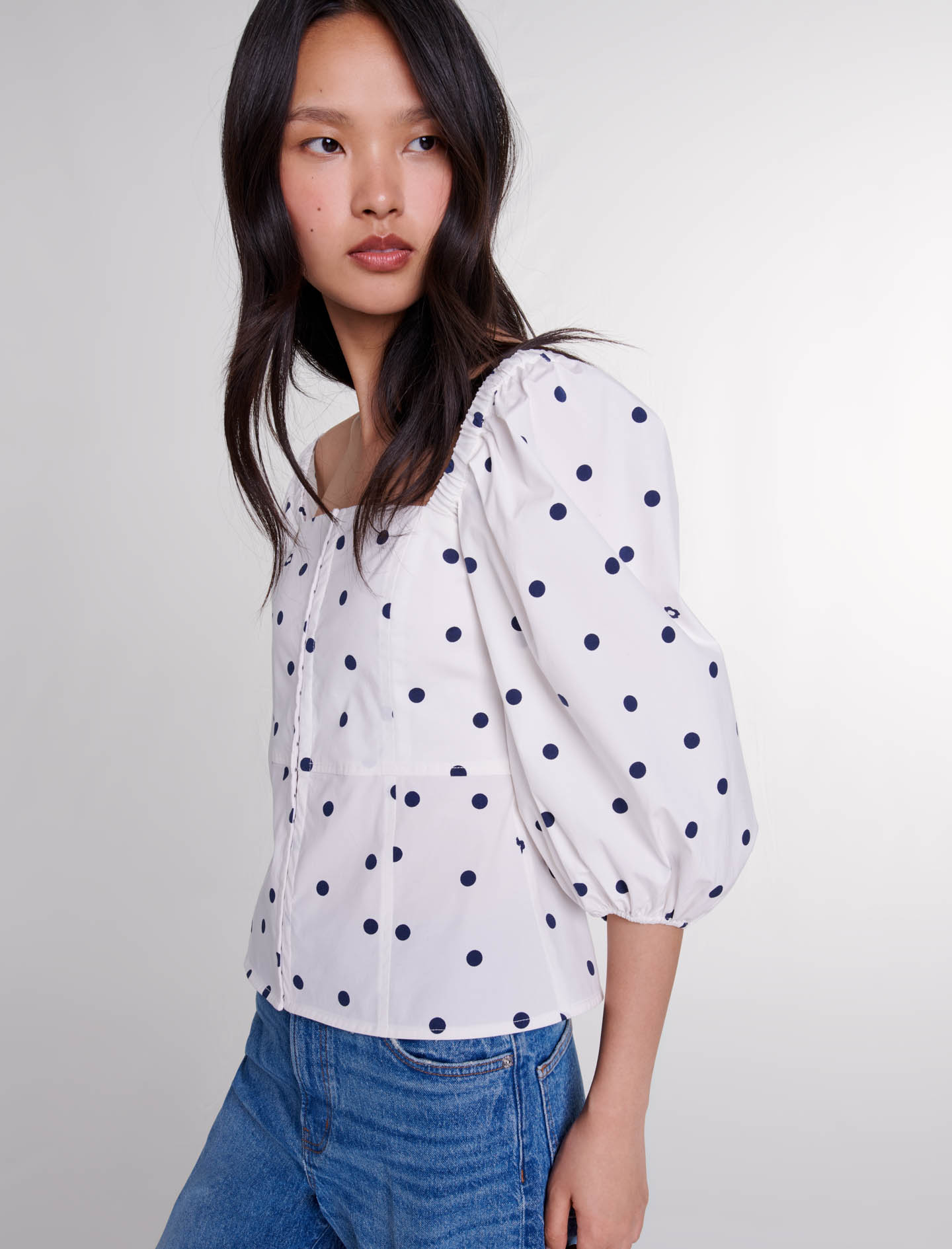 Cotton poplin top Polka dot print Corset effect tailoring Hook-and-eye fastening in front Square neck and back 3/4-length sleeves with elasticated shoulders and cuffs.