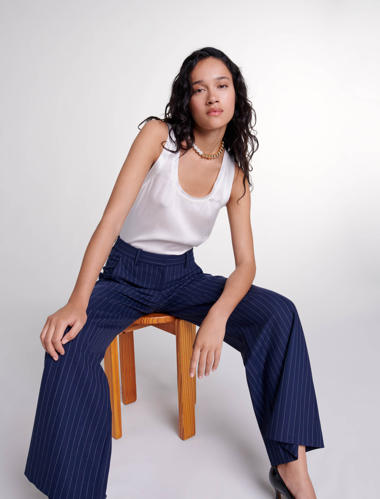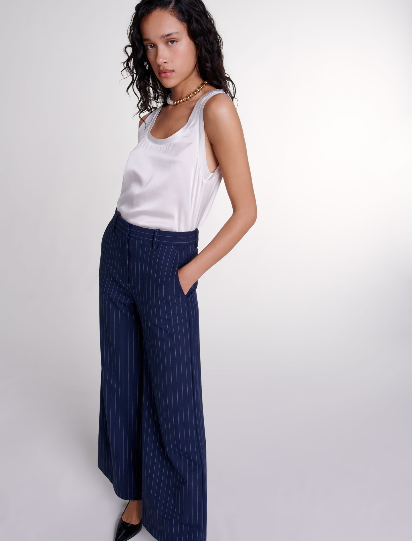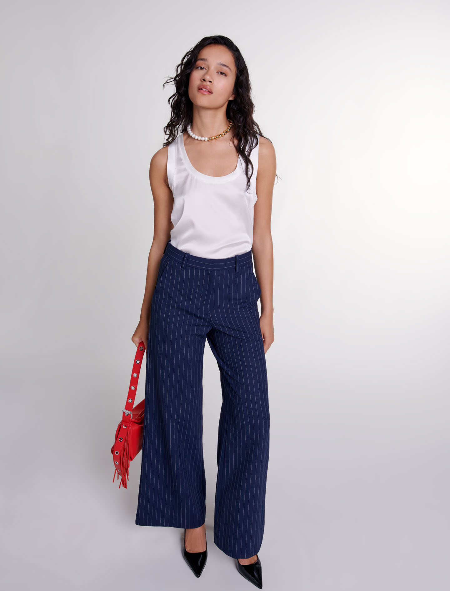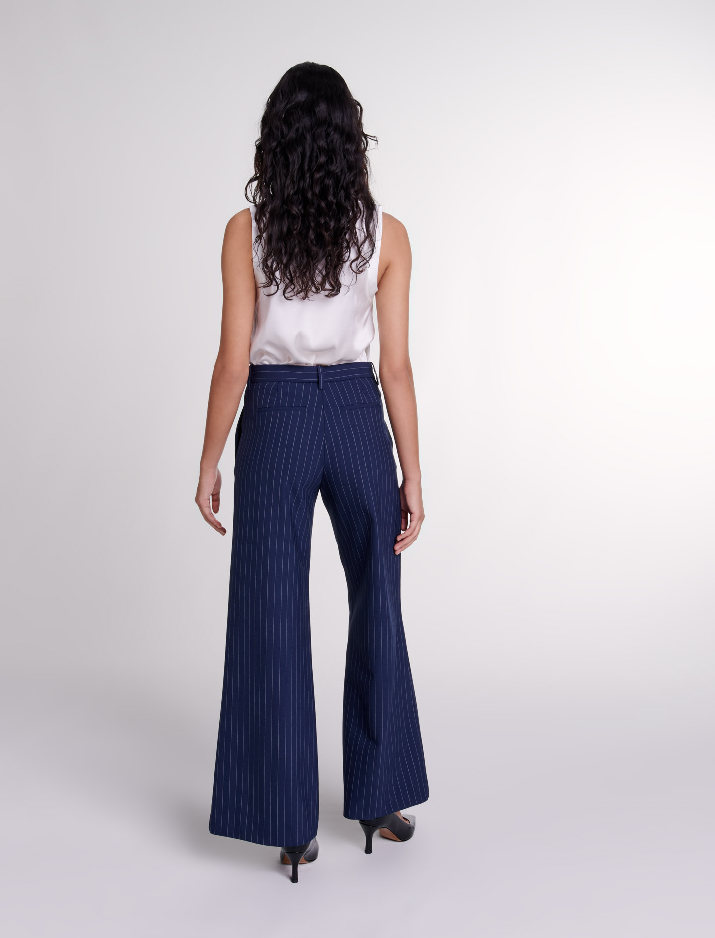 Maje wool These wide-leg suit trousers, with their stripes, play on lines and volume.