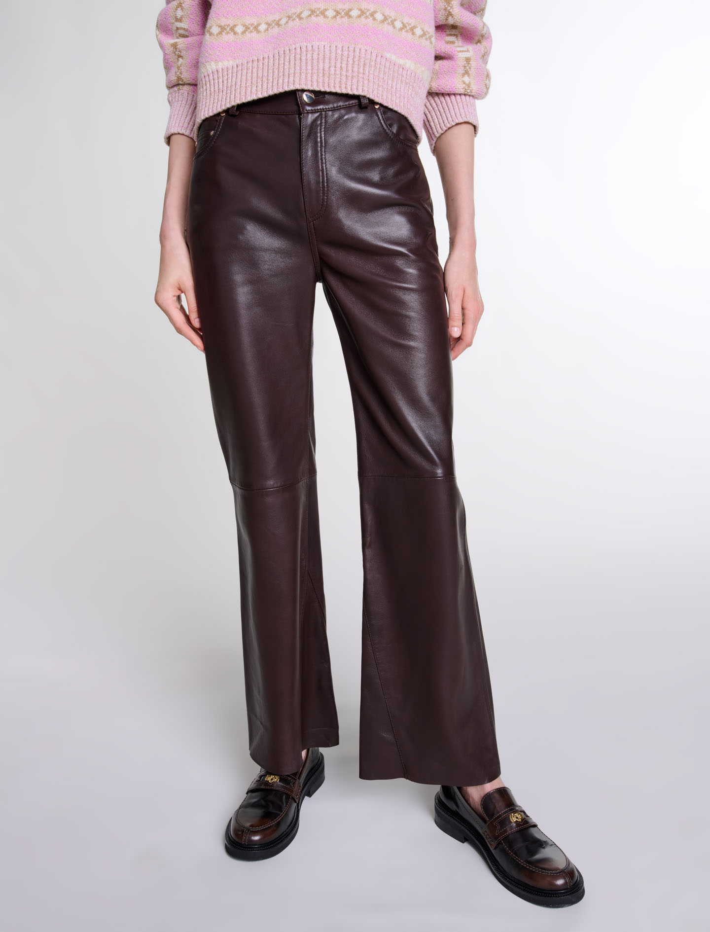 Leather trousers Mid-rise waist Zip fastening with press stud 5 pockets Slightly flared legs.