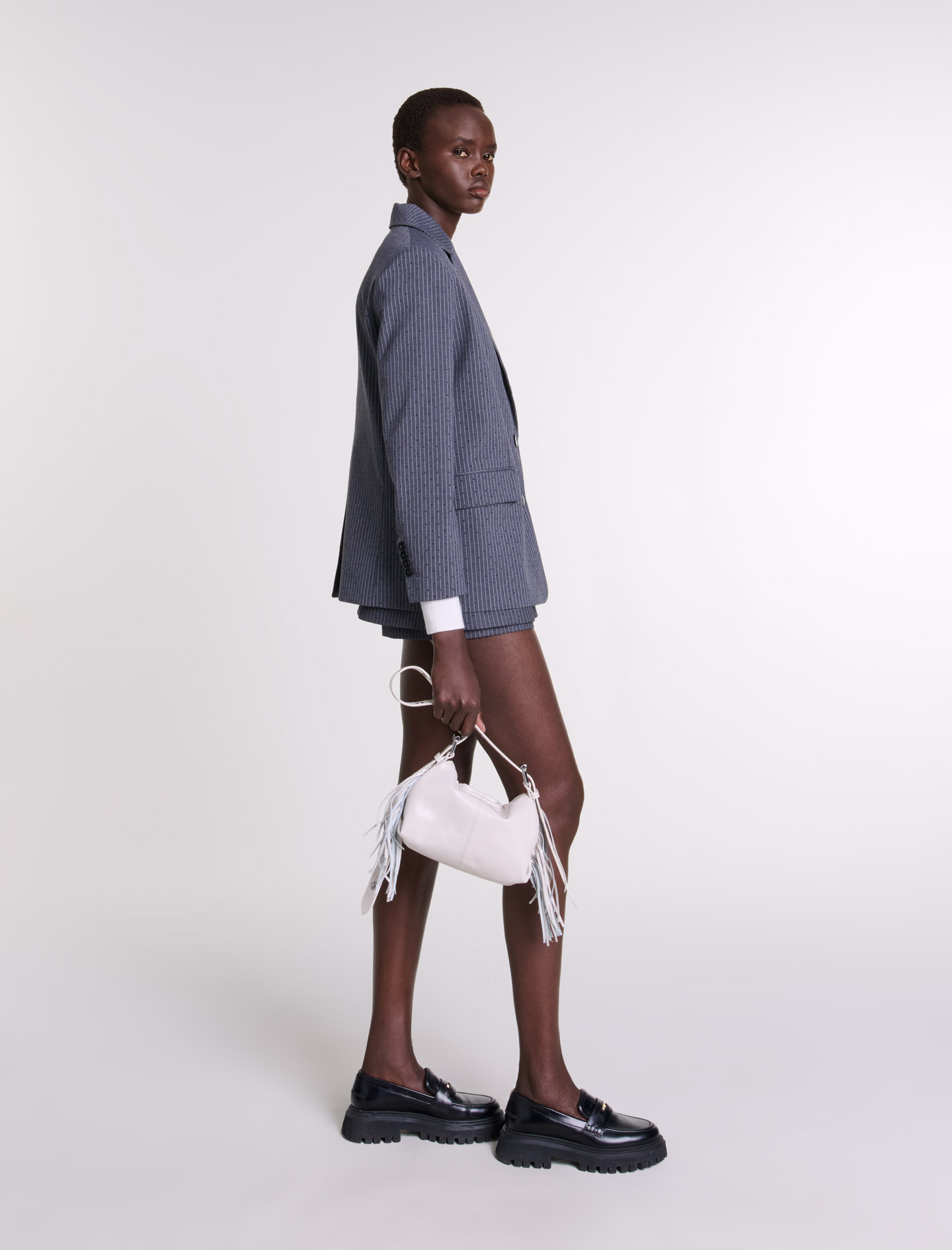 With all-over stripes and rhinestones, this suit jacket is slightly oversized for a structured yet relaxed look.