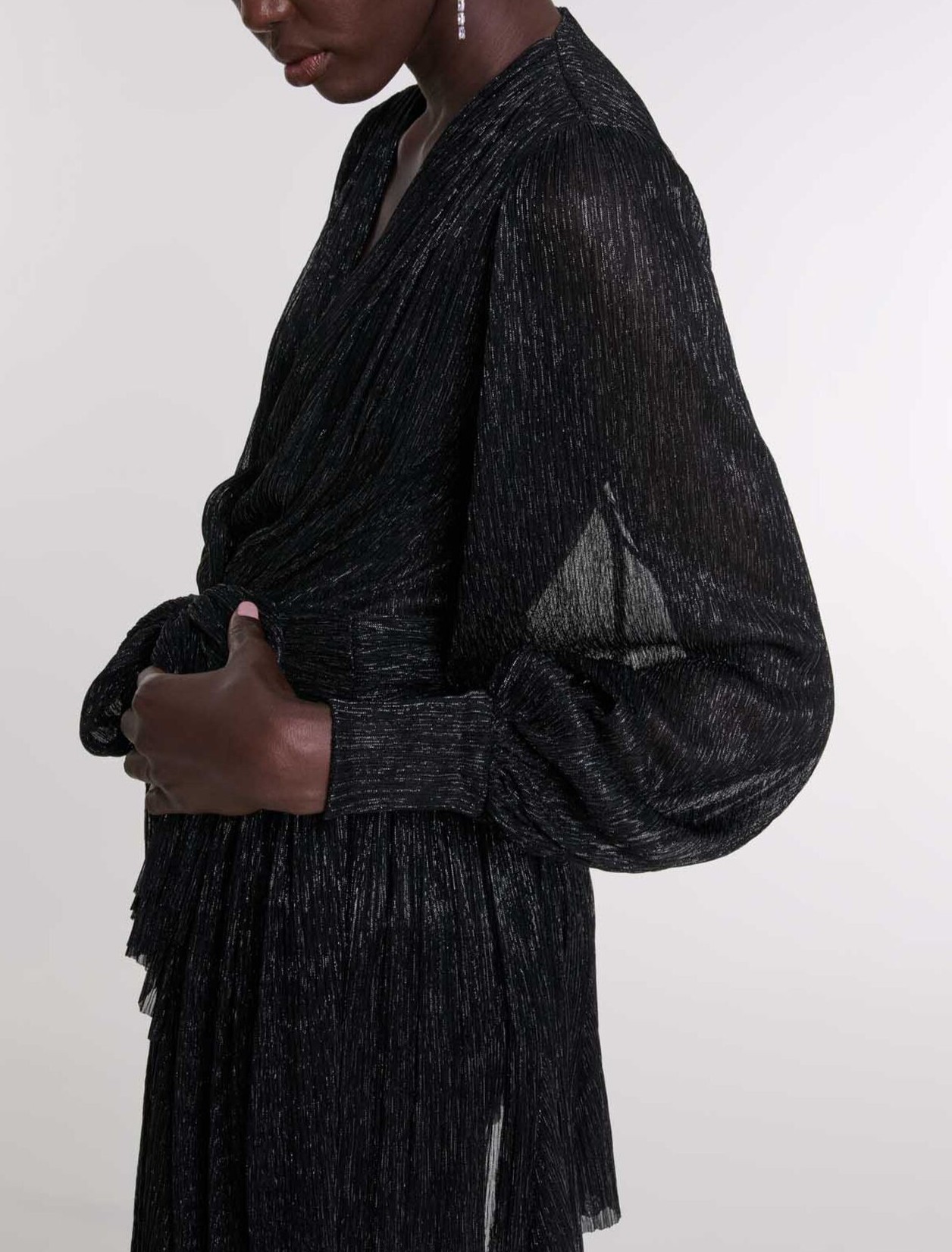 Shiny effect short dress Plunging wrap neckline Long sleeves Gathered cuffs Tied at the waist Pleated skirt Draped effect.
